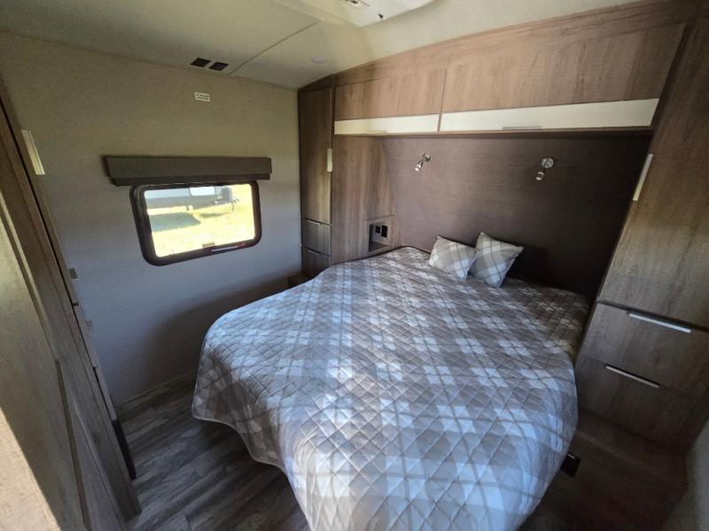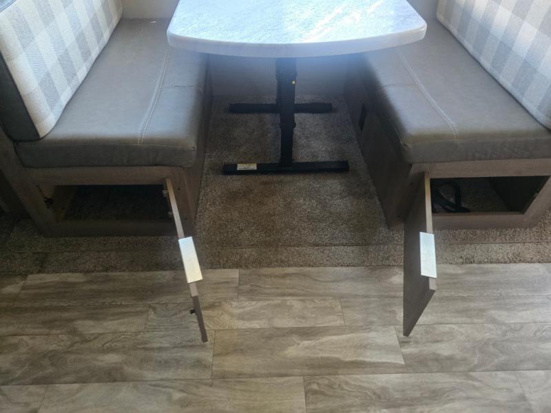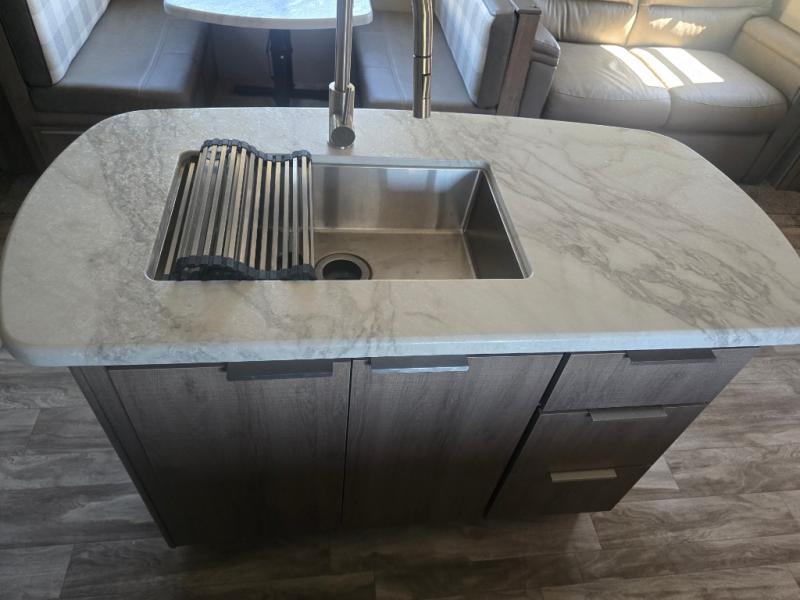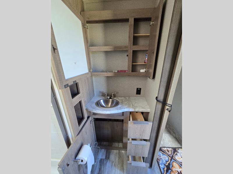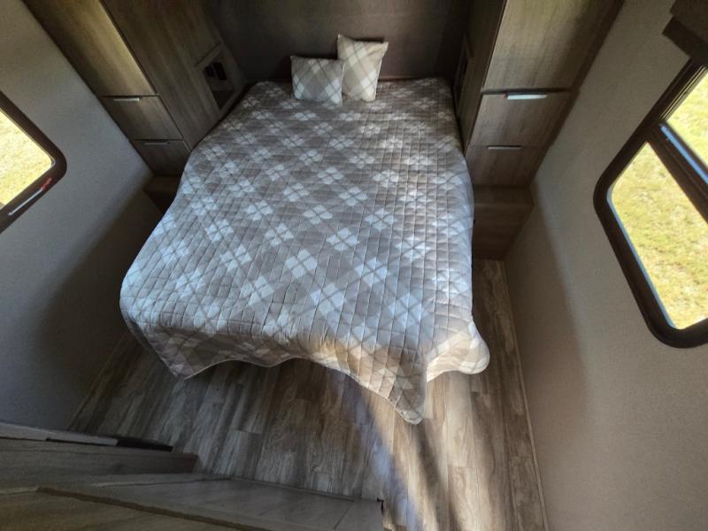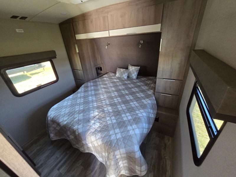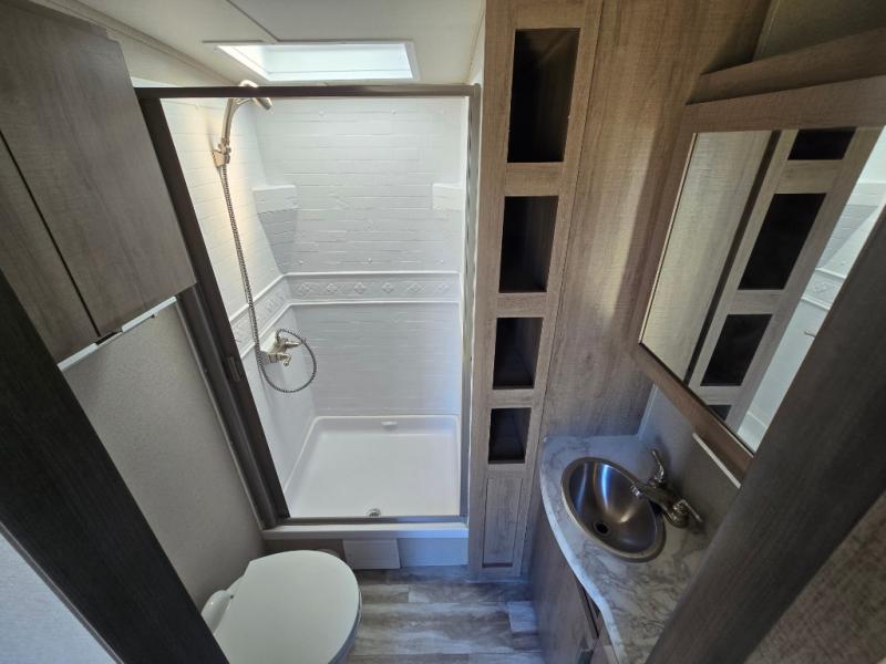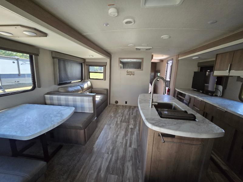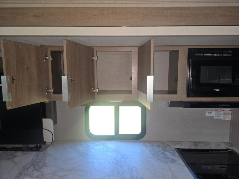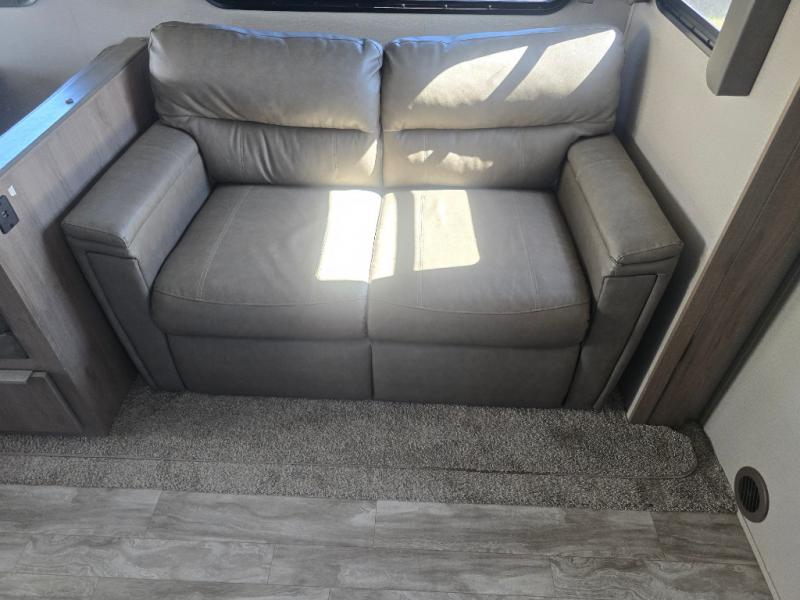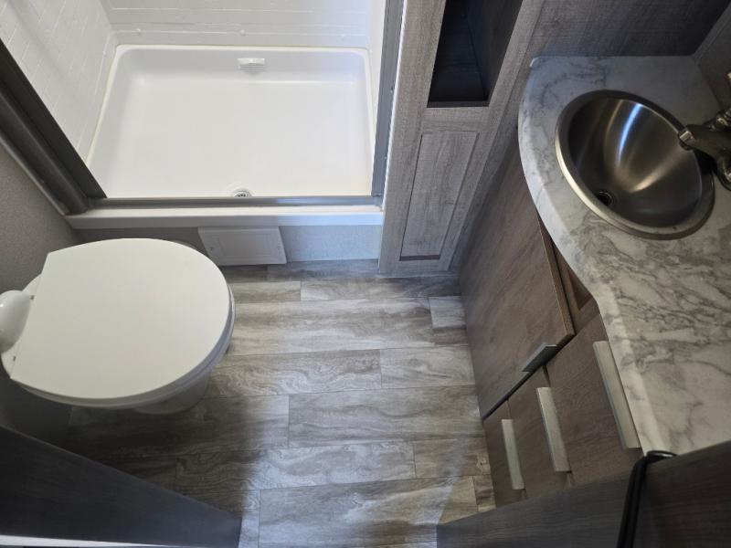How does a desk with a view sound in your next travel trailer? You can work remotely or check your social media from the desk which is next to the pantry so you can easily grab a snack whenever you like. And your best friend can be eating from the pet dish under the refrigerator. The cook will enjoy having the kitchen island to prepare and serve meals as well as dry dishes next to the sink. They might like to make a few meals on the outside kitchen and store extra drinks in the 1.6 cu. ft. outdoor refrigerator. Everyone else can relax under the 21' power adjustable awning. Inside there are two slides outs in the living and kitchen area offering a spacious place to relax on the tri-fold sofa and booth dinette while watching the telescoping 40" TV with fireplace below before getting cleaned up in the full bathroom. And the master suite with a walk-around queen bed and lots of clothing storage will be calling your name after a fun day exploring outdoors, working, and/or visiting with other RVers.