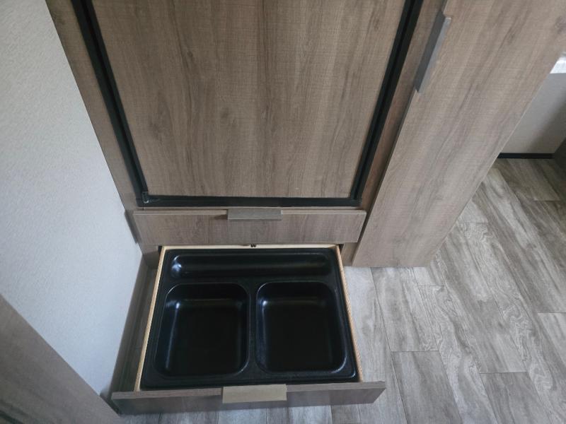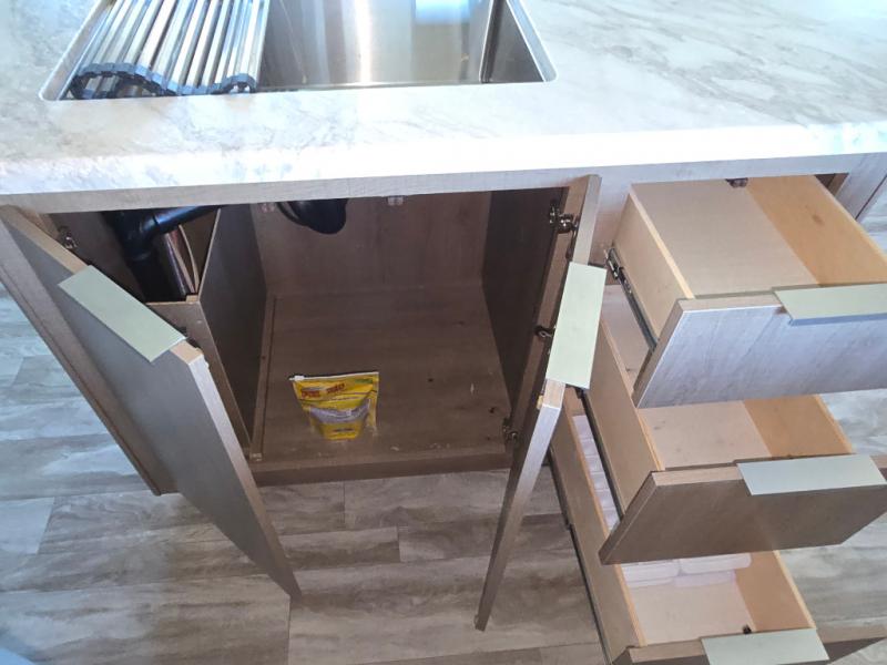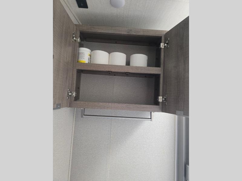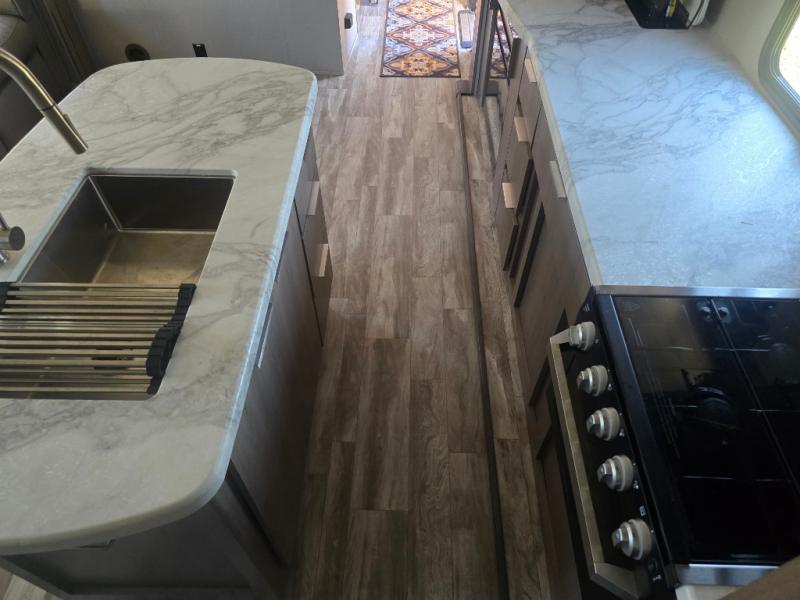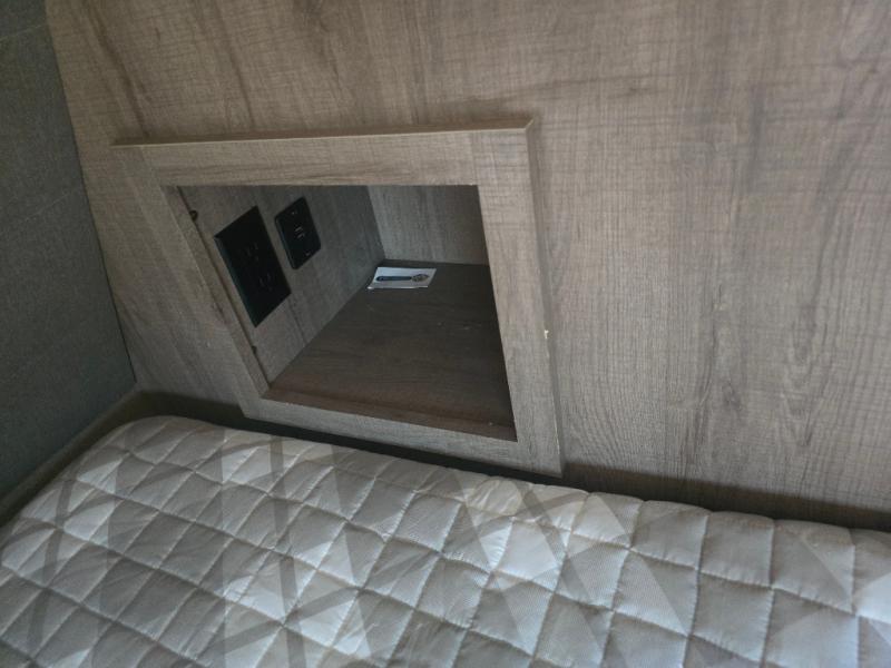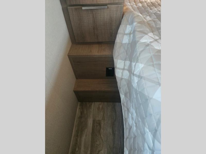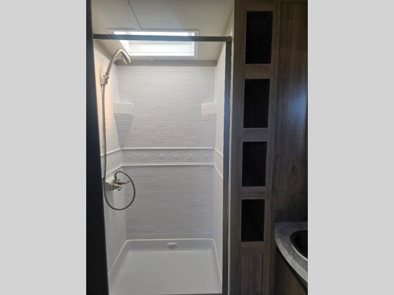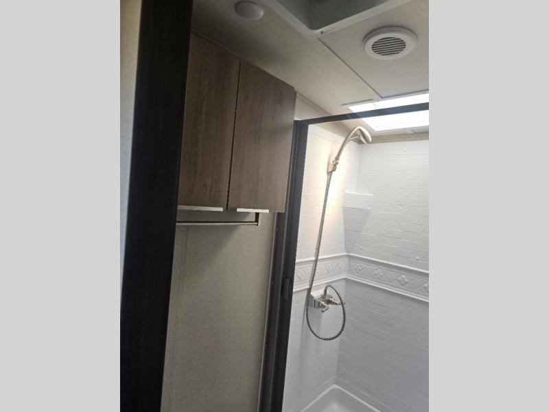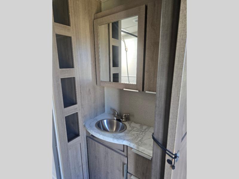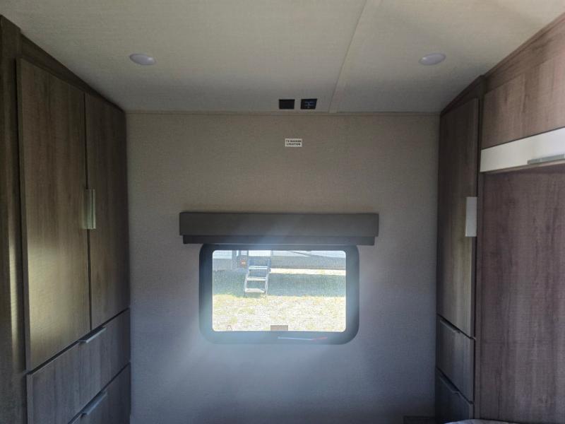 How does a desk with a view sound in your next travel trailer? You can work remotely or check your social media from the desk which is next to the pantry so you can easily grab a snack whenever you like. And your best friend can be eating from the pet dish under the refrigerator. The cook will enjoy having the kitchen island to prepare and serve meals as well as dry dishes next to the sink. They might like to make a few meals on the outside kitchen and store extra drinks in the 1.6 cu. ft. outdoor refrigerator. Everyone else can relax under the 21' power adjustable awning. Inside there are two slides outs in the living and kitchen area offering a spacious place to relax on the tri-fold sofa and booth dinette while watching the telescoping 40" TV with fireplace below before getting cleaned up in the full bathroom. And the master suite with a walk-around queen bed and lots of clothing storage will be calling your name after a fun day exploring outdoors, working, and/or visiting with other RVers.