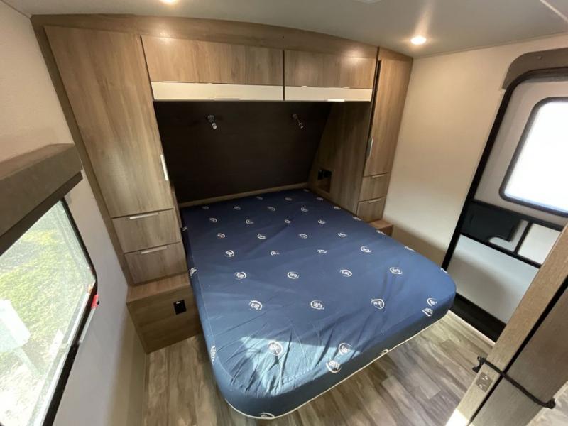 Family fun outdoors with inside comforts, plus plenty of sleeping space and storage for everyone's things can be found in this trailer and inside the exterior pass through storage. As you easily enter through either one of the exterior entries you can get to the rear and front quickly to load, unload or stay for a while. The double size bunks with a ladder and privacy curtains can sleep four kiddos and the full bathroom will keep everyone refreshed for the next activity. The master suite offers a walk-around queen bed with dual wardrobes and a space saving sliding door for privacy. Everyone can gather in the main living and kitchen area with a slide out which includes the U-shaped dinette or choose the free standing option and the tri-fold sofa or choose the optional theatre seating. The cook can whip up meals in the L-shaped kitchen which includes appliances, a flip-up countertop extension, a wardrobe/pantry, shoe storage and a pet dish drawer.