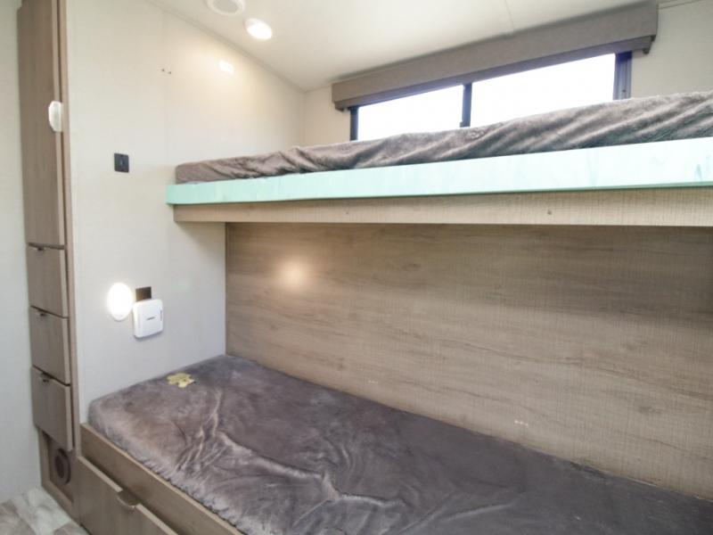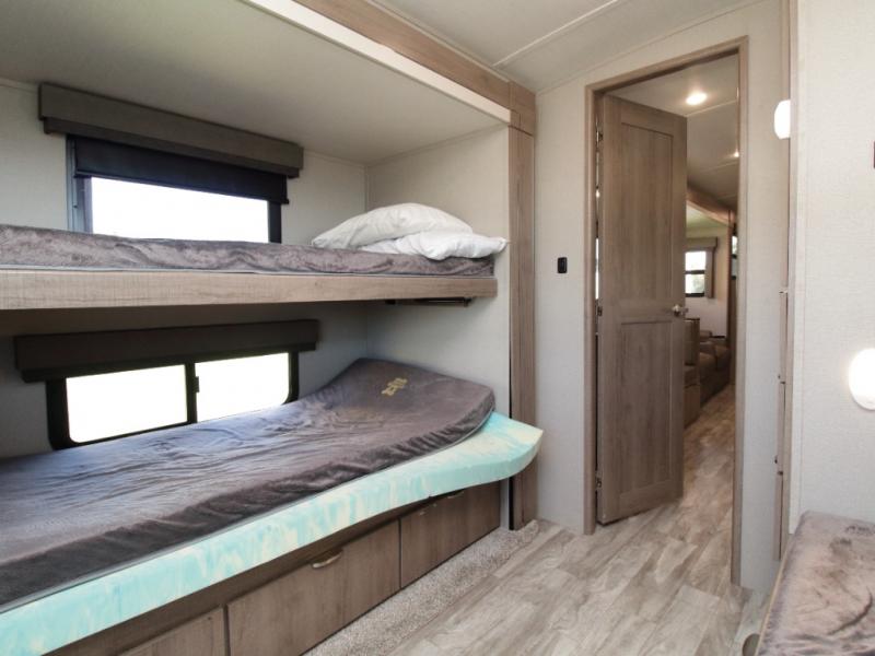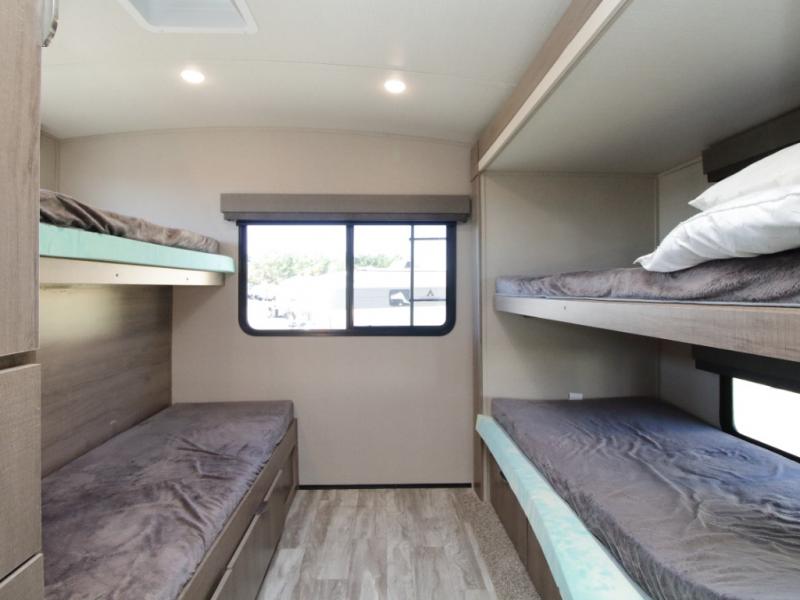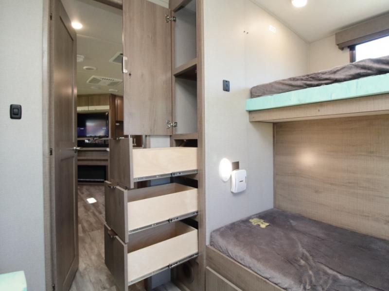 Private Bunkhouse with Four Bunk Beds – Ideal for kids or guests, featuring its own slide-out, wardrobe, drawers, and rear window for natural light.
