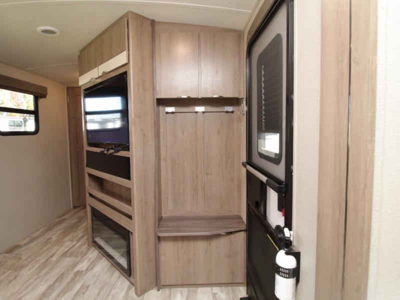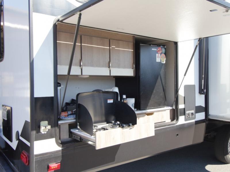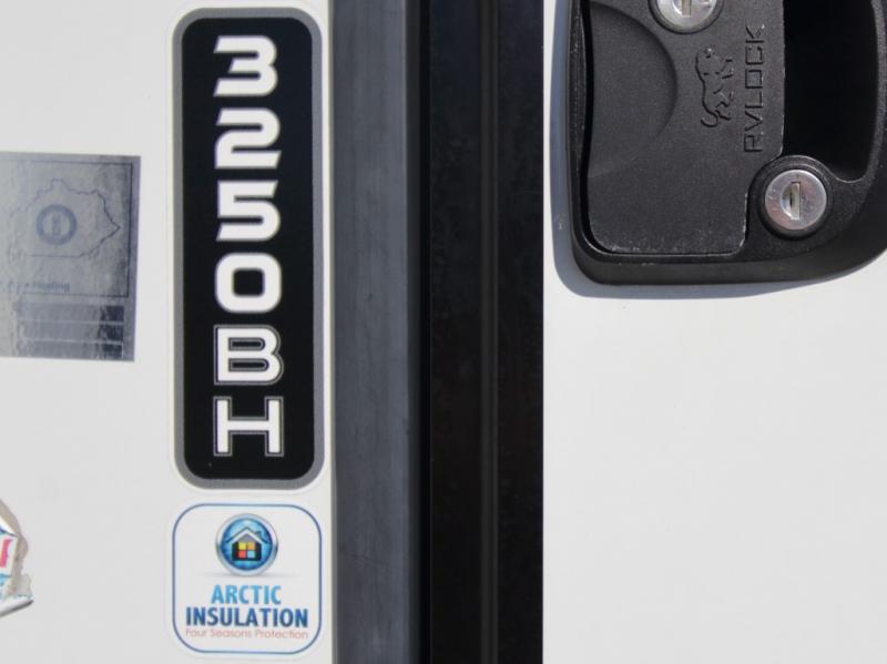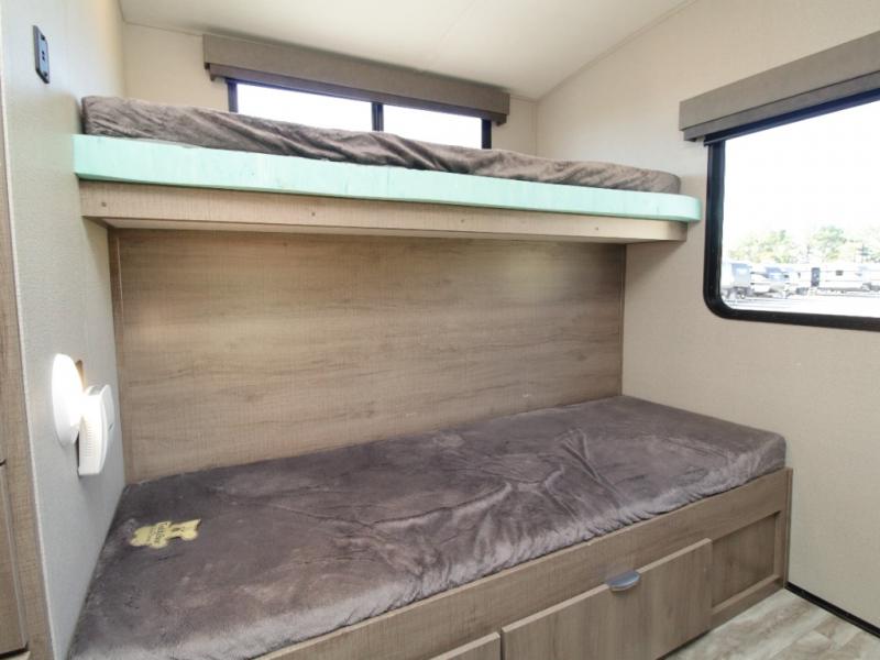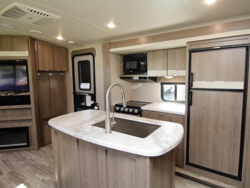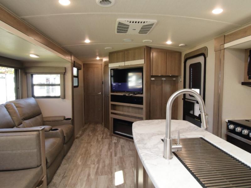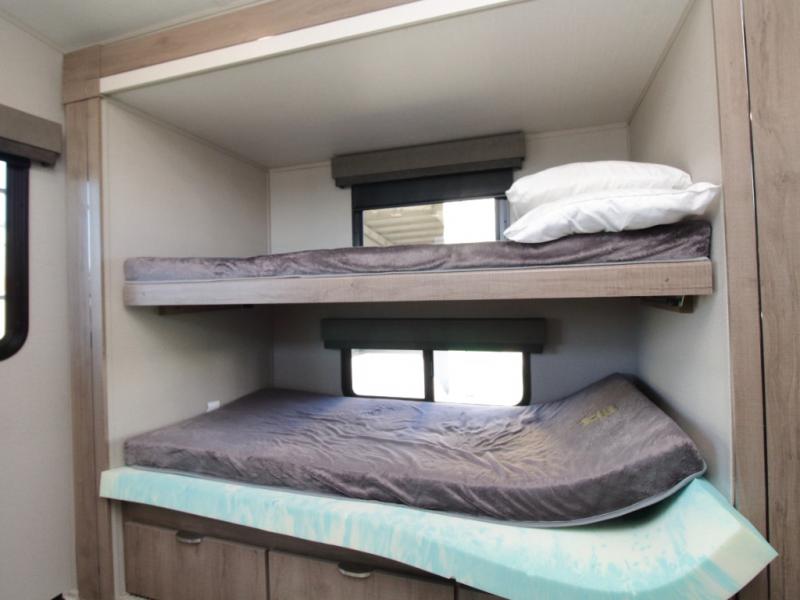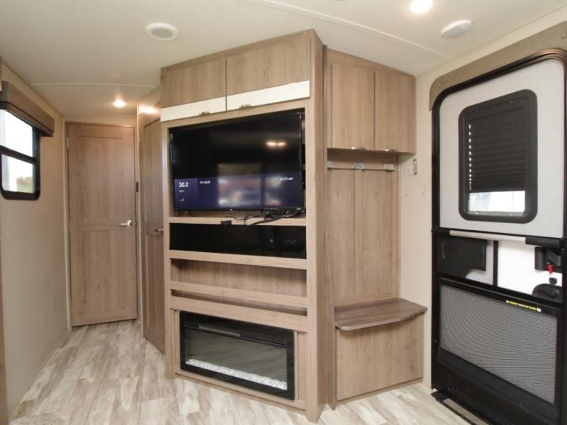 Used 2021 Imagine 3250BH is decked out with an outdoor kitchen, bunk house, kitchen island, fireplace, and more!