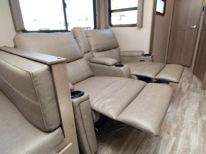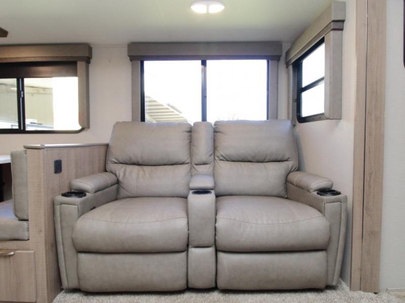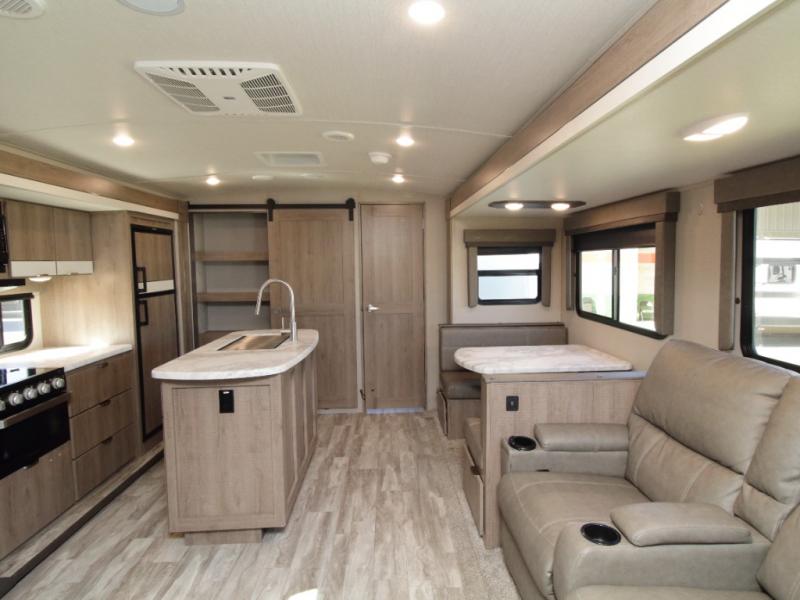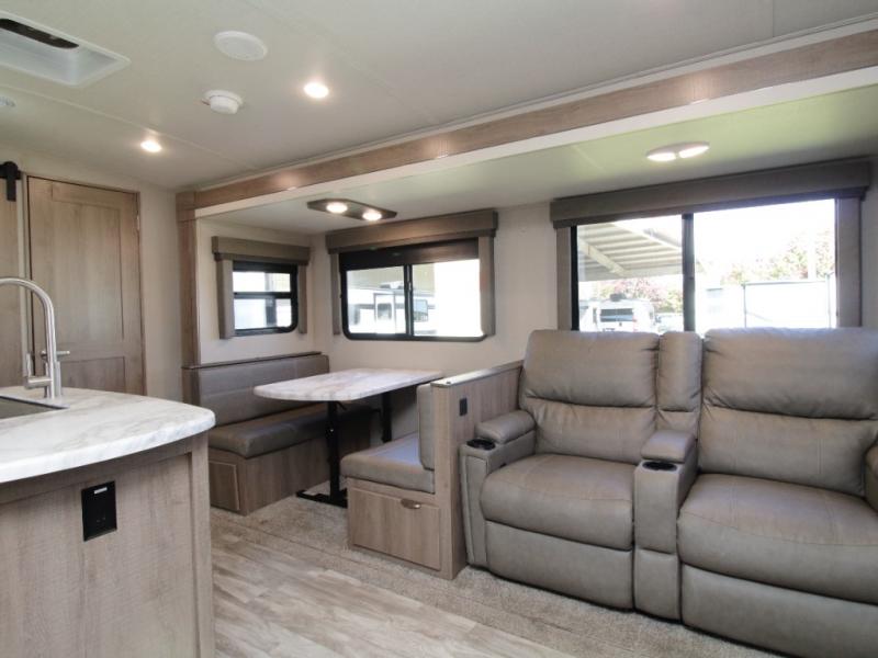 Open-Concept Living Area – Includes a tri-fold sofa, booth dinette (or optional theater seating and free-standing table), and a cozy fireplace for relaxing evenings.