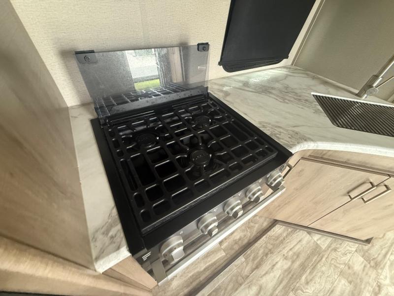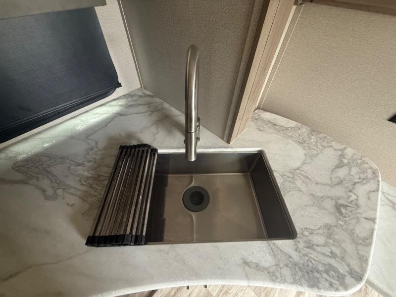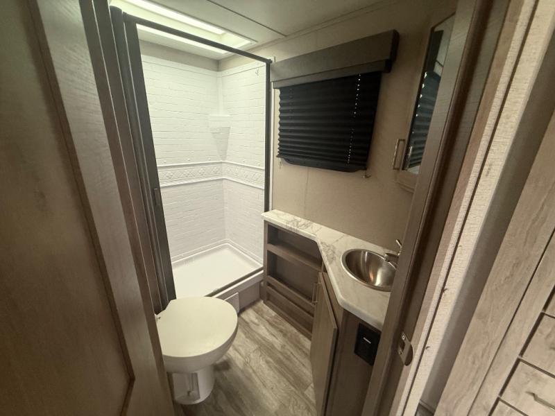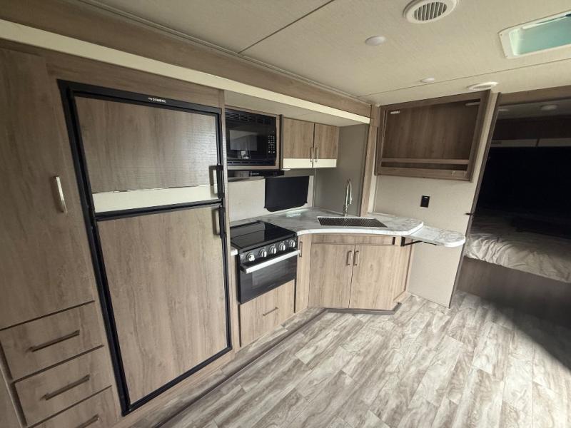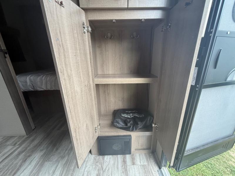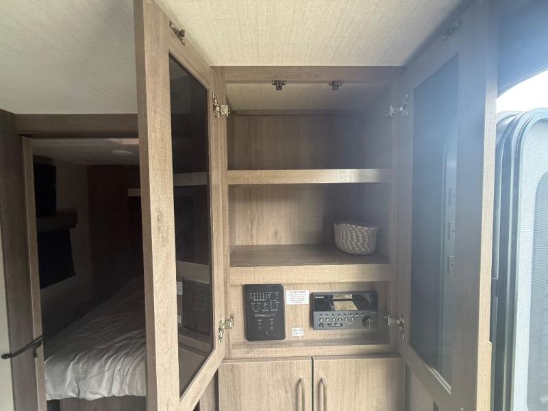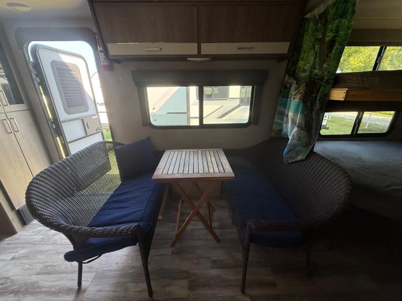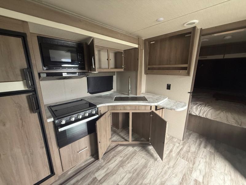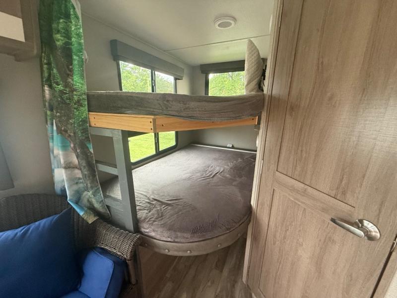 Your family will enjoy each and ever trip in this trailer with sleeping space for six between the double-size bunks in the rear with privacy curtains and the walk-around queen bed in the private bedroom, plus the booth dinette that doubles as extra sleeping space for one! After hiking the trailers and hanging out around the campfire, the cook can make meals inside with full amenities within the slide out including a double door refrigerator or outdoors using the outside kitchen. The 20' electric awning provides a covered area for all to enjoy, just add your camping chairs. Everyone can take turns getting cleaned up in the full bathroom before bedtime and some might like to watch the HD TV before falling asleep.