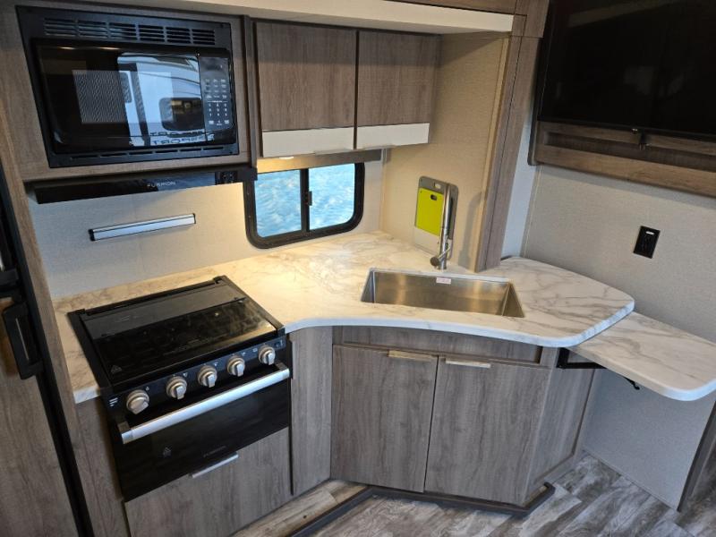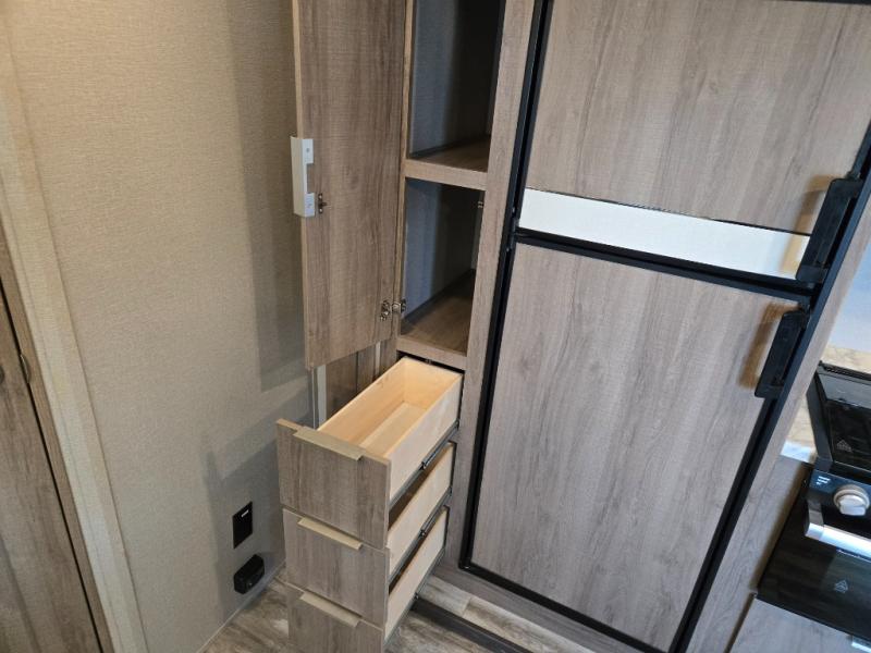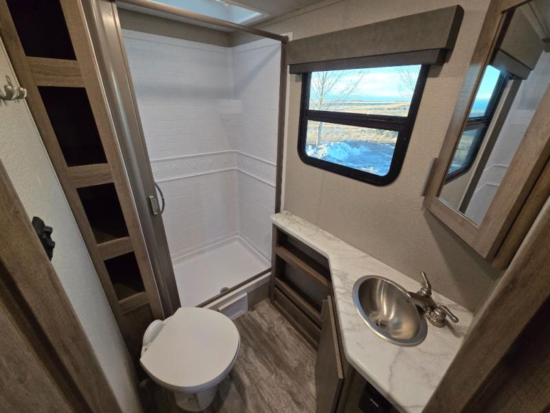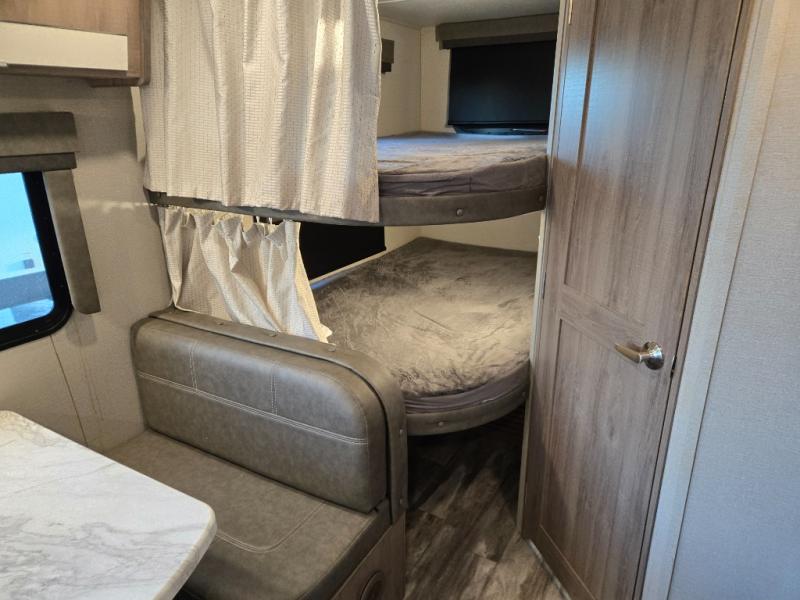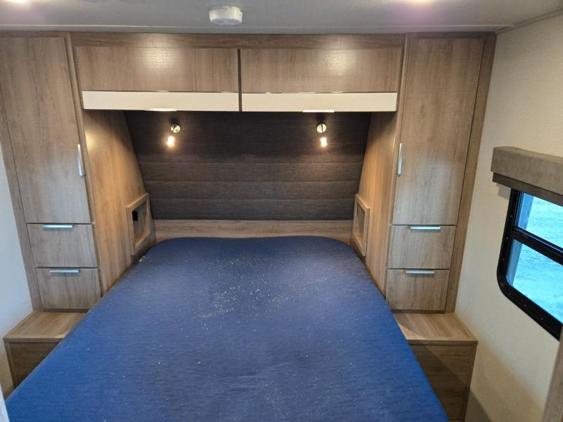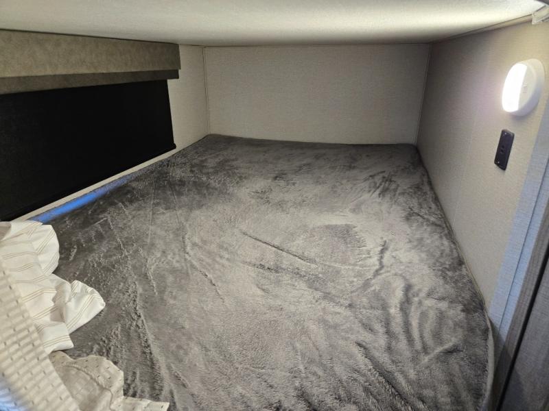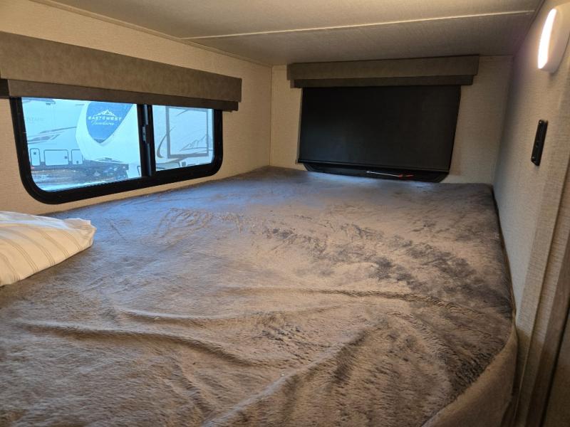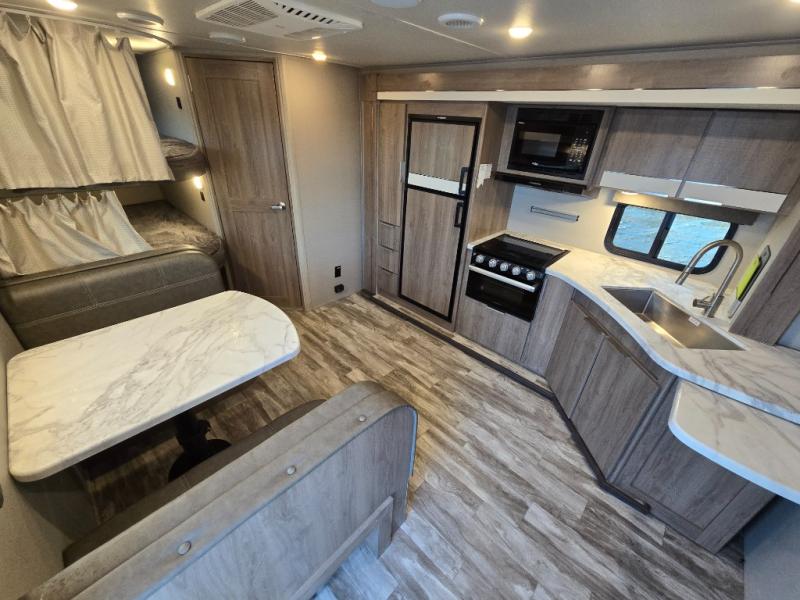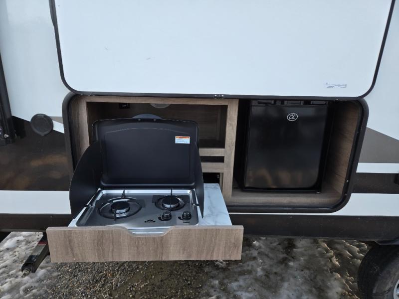 Your family will enjoy each and ever trip in this trailer with sleeping space for six between the double-size bunks in the rear with privacy curtains and the walk-around queen bed in the private bedroom, plus the booth dinette that doubles as extra sleeping space for one! After hiking the trailers and hanging out around the campfire, the cook can make meals inside with full amenities within the slide out including a double door refrigerator or outdoors using the outside kitchen. The 20' electric awning provides a covered area for all to enjoy, just add your camping chairs. Everyone can take turns getting cleaned up in the full bathroom before bedtime and some might like to watch the HD TV before falling asleep.