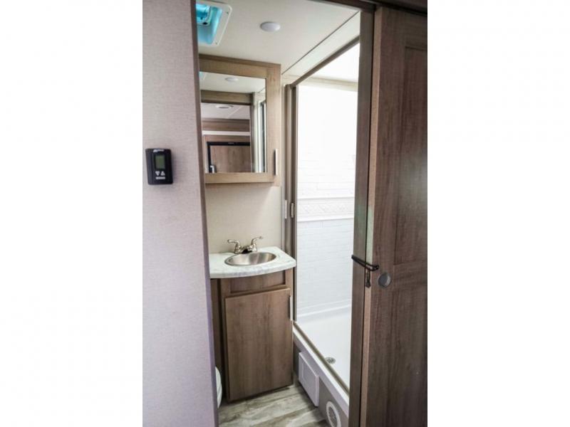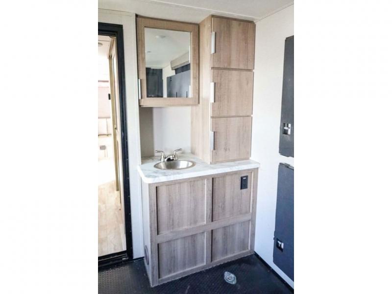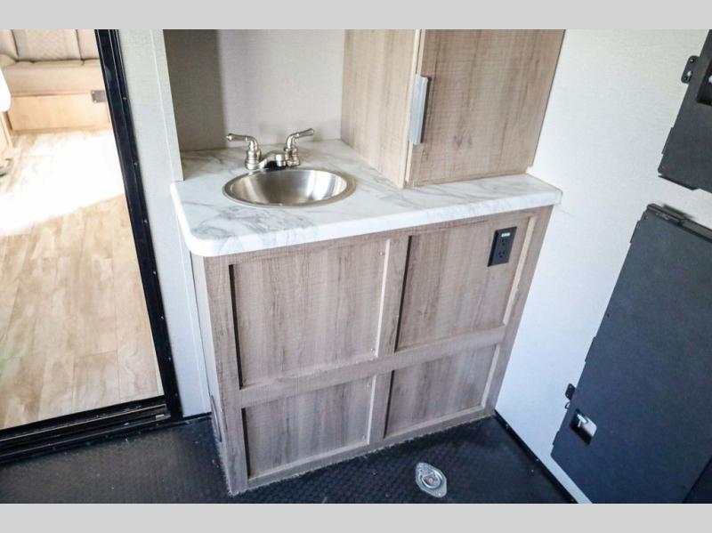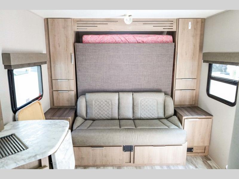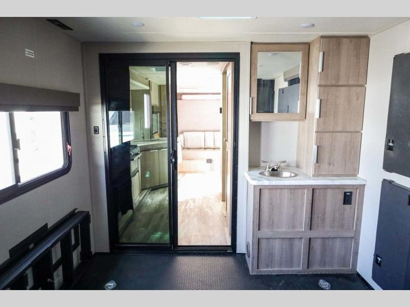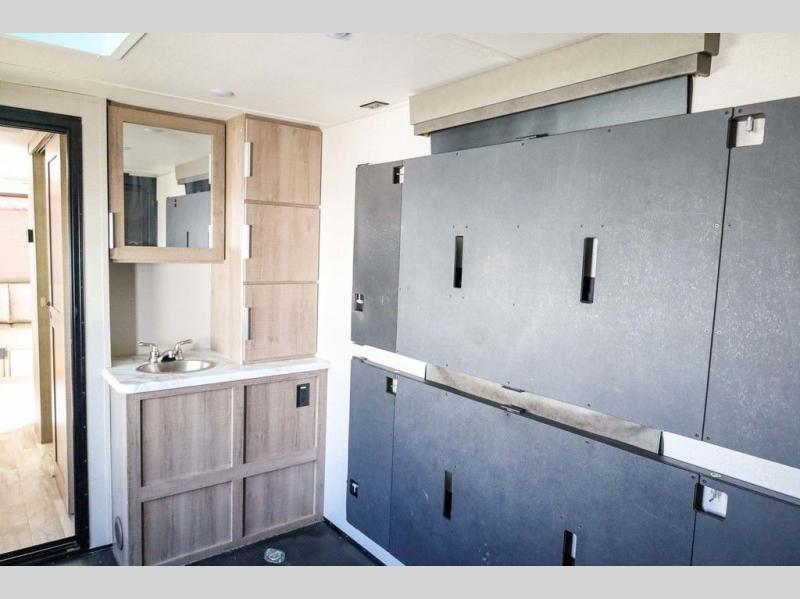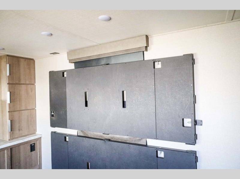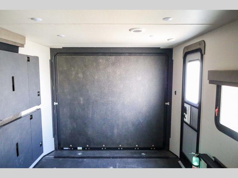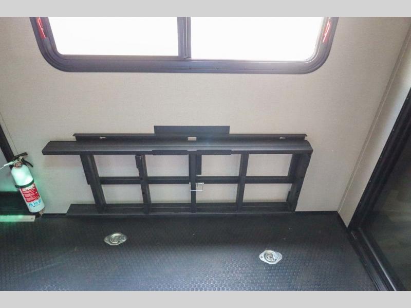 This toy hauler allows you to make your camping trip even better with your favorite outdoor toys. Since the 10' separate garage has a 1,500 lb. carrying capacity, you can bring along the four wheeler and the kayak! After you've worked up your appetite from being outside all day, whip up dinner on the three burner range or make something quick in the microwave oven, and the flip-up countertop will provide extra space to cut fresh fruit for the kids. You'll find a convenient sink in the garage so you can wash up before bed and the full bath includes a walk-in shower for compete comfort. This model has you covered when it's time to get some shut-eye. The garage features a convertible sleeping system that can convert into a queen bed or bunk beds, and the front Murphy bed in the main area is both comfortable and versatile!