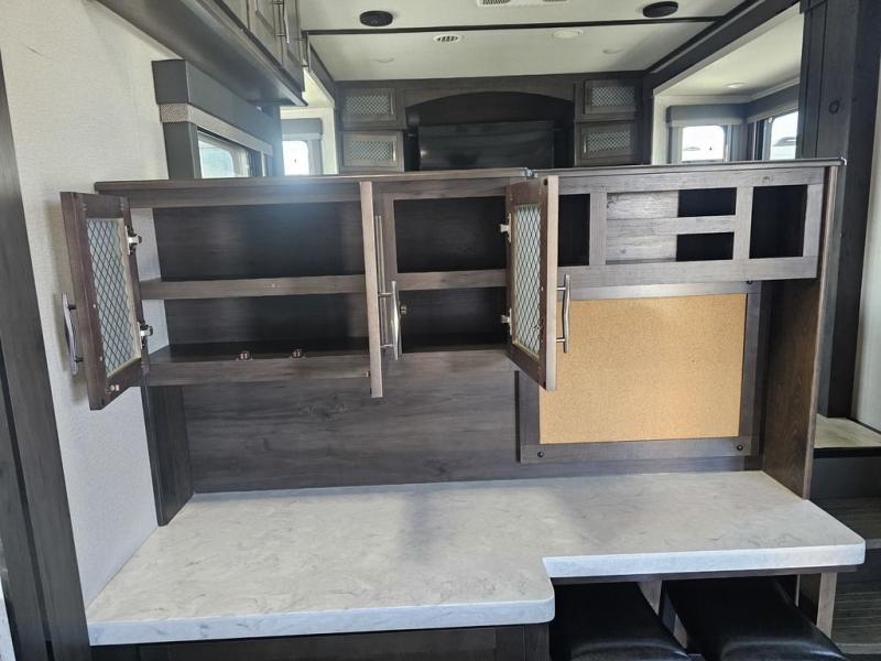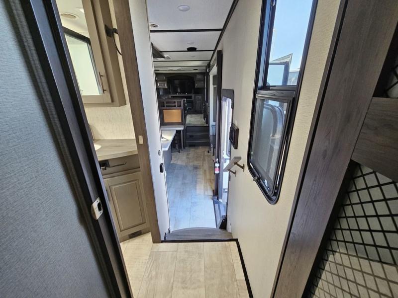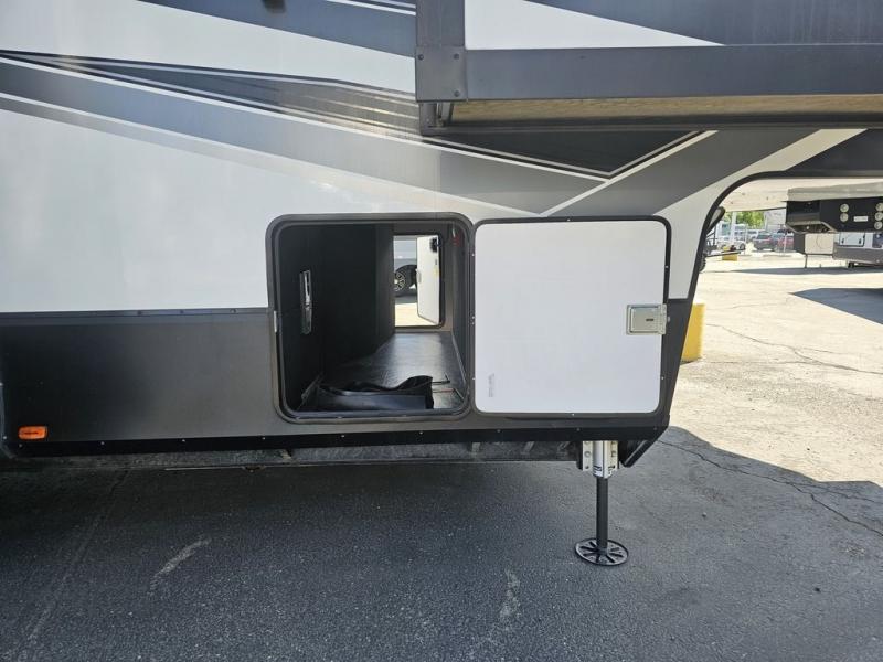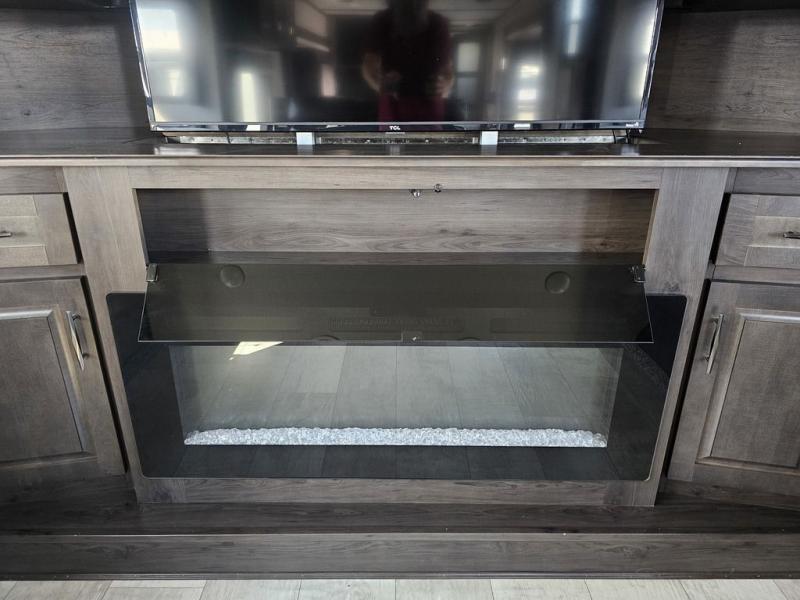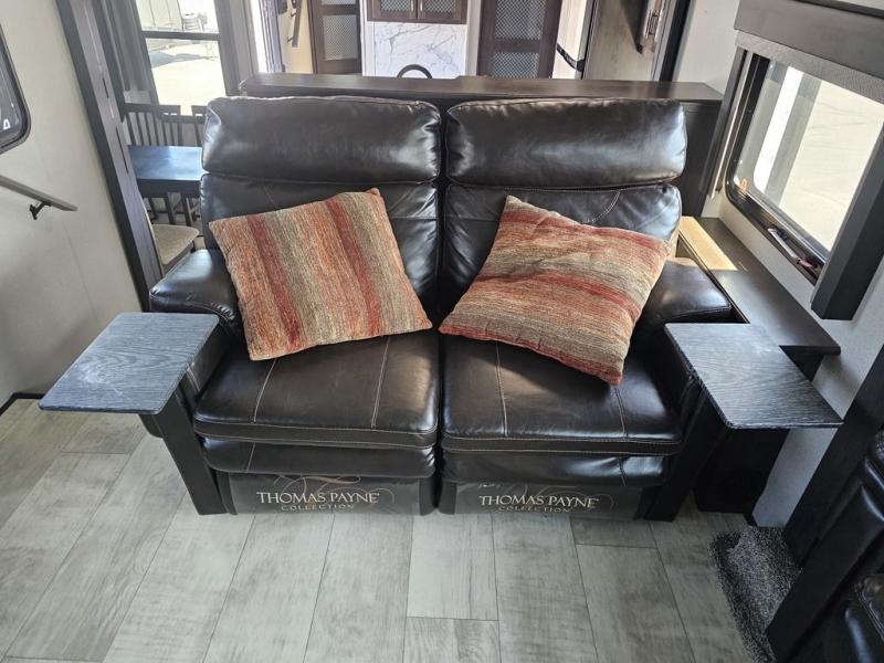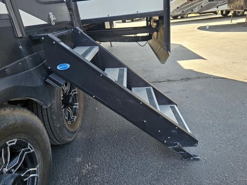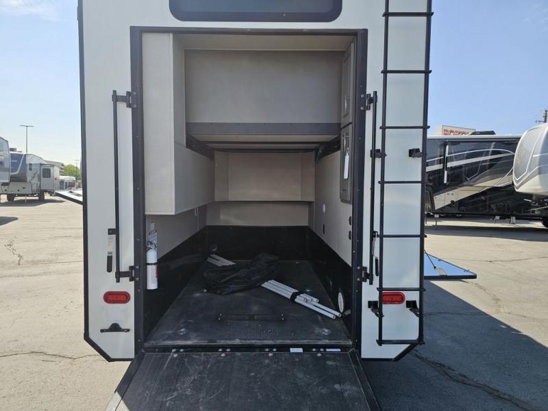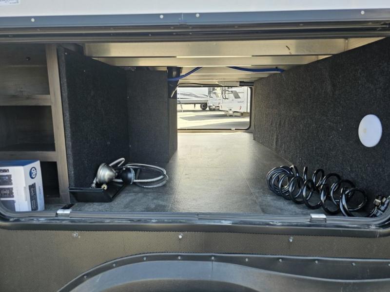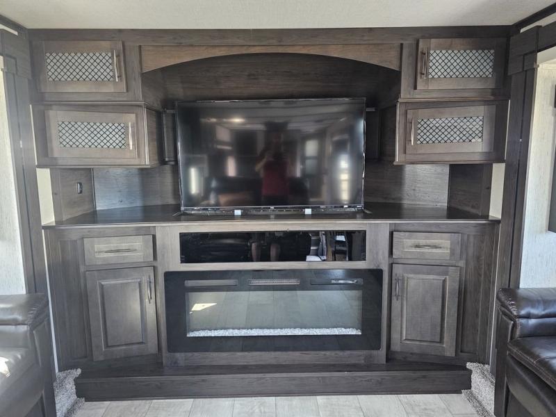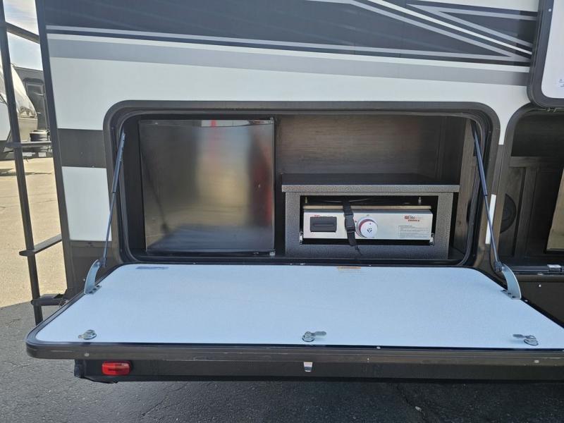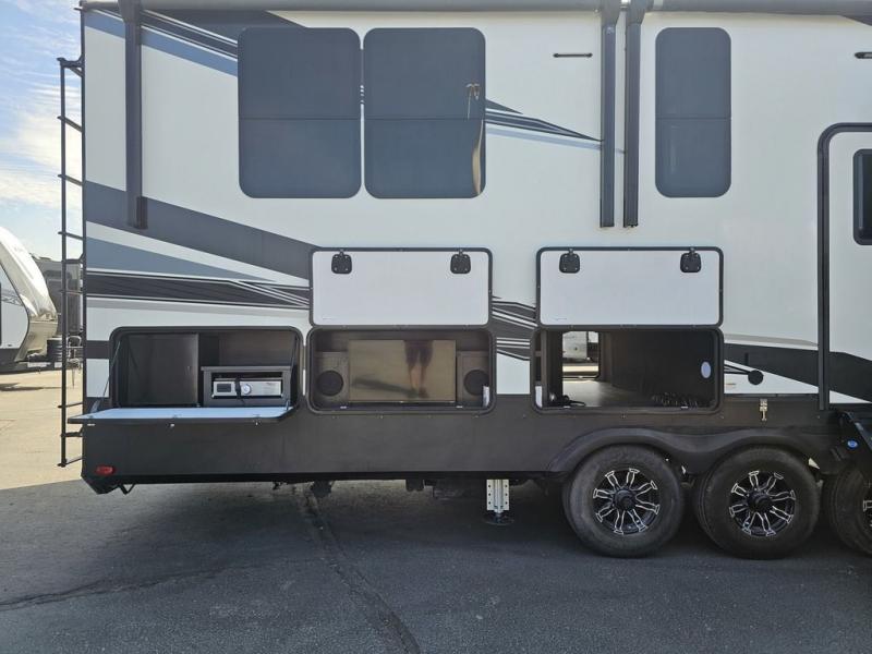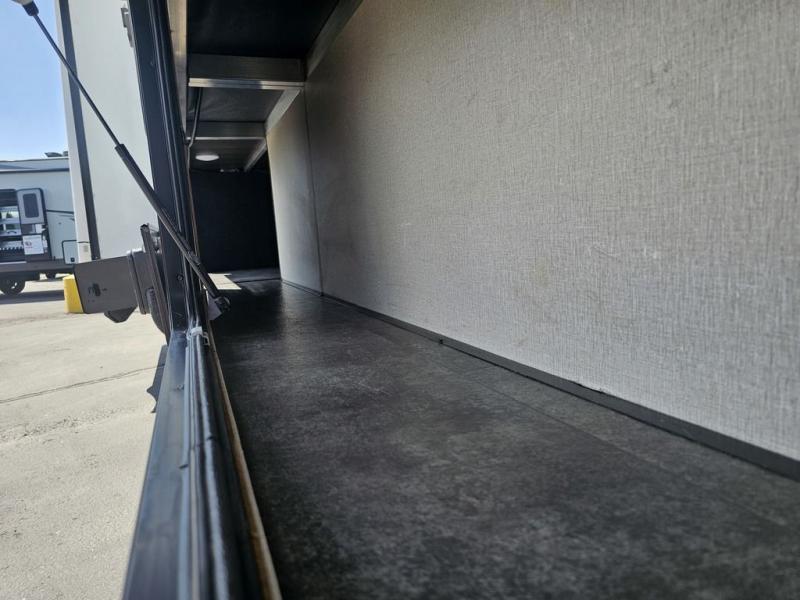 This Momentum toy hauler is wonderfully modern and luxurious with three LED TVs, an electric fireplace, a master suite, theater seating with heat/massage, an 18-cubic foot refrigerator, and an outdoor kitchen! The interior feels residential since it has a separate living room up at the front, and the kitchen is stocked with all of the essentials plus a few extras, like a desk and free-standing dinette with chairs. The dual-entry bathroom has a main entrance in the hallway and a second private entrance into the bedroom. With a skylight above the shower, you'll be able to rinse off while the sunshine streams through, and the two exterior pass-through storage compartments will allow you to bring even more gear in addition to what you have in the below-floor garage.