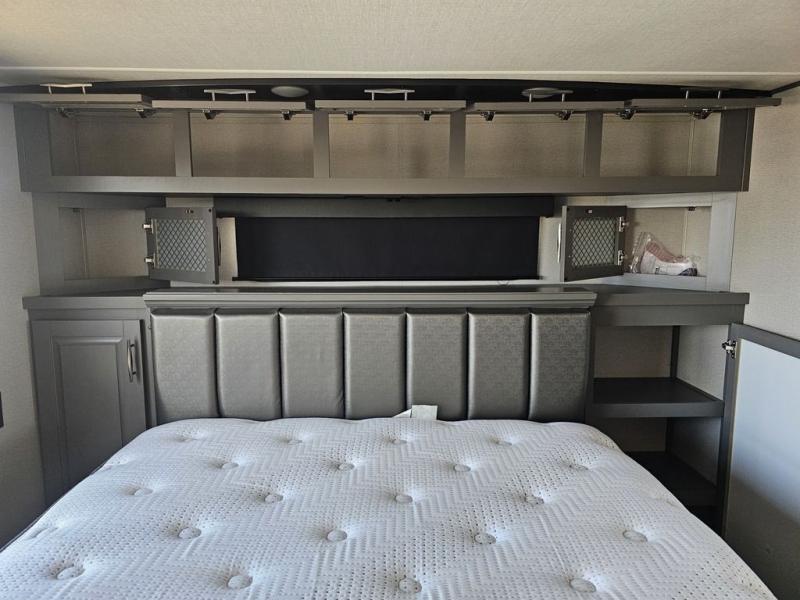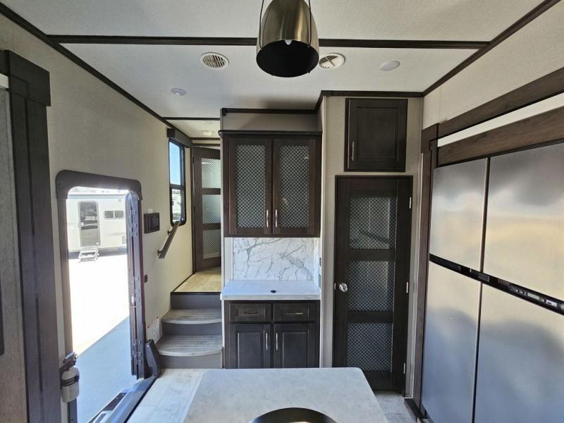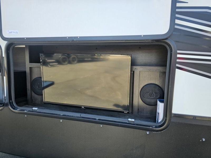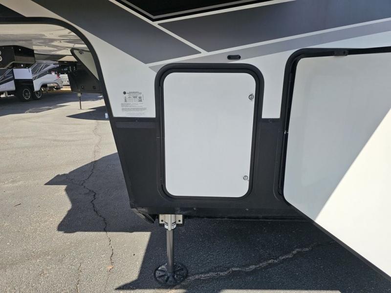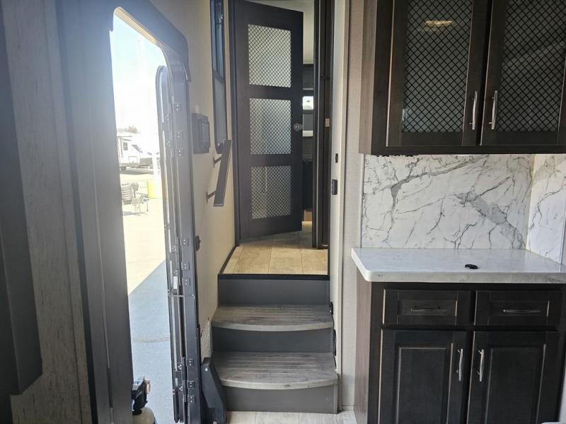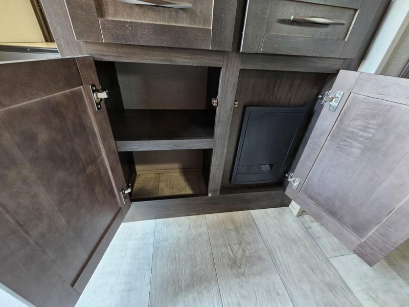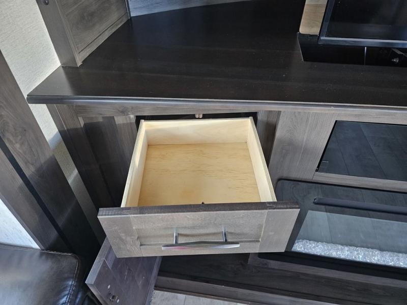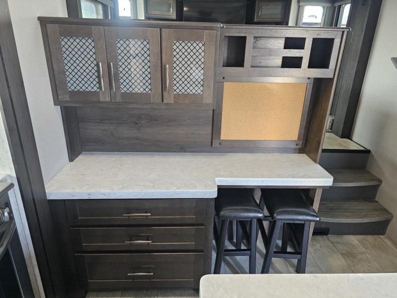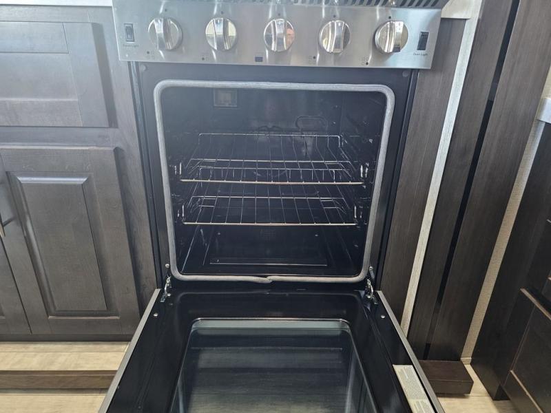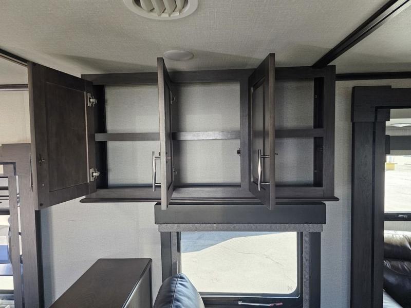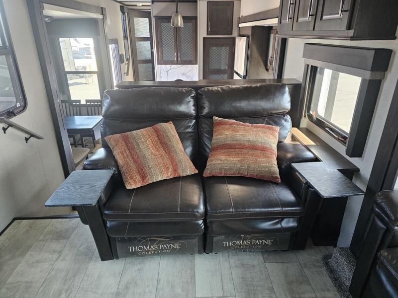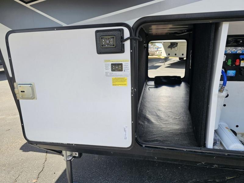 This Momentum toy hauler is wonderfully modern and luxurious with three LED TVs, an electric fireplace, a master suite, theater seating with heat/massage, an 18-cubic foot refrigerator, and an outdoor kitchen! The interior feels residential since it has a separate living room up at the front, and the kitchen is stocked with all of the essentials plus a few extras, like a desk and free-standing dinette with chairs. The dual-entry bathroom has a main entrance in the hallway and a second private entrance into the bedroom. With a skylight above the shower, you'll be able to rinse off while the sunshine streams through, and the two exterior pass-through storage compartments will allow you to bring even more gear in addition to what you have in the below-floor garage.