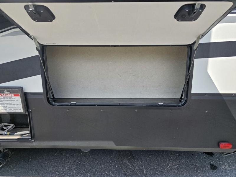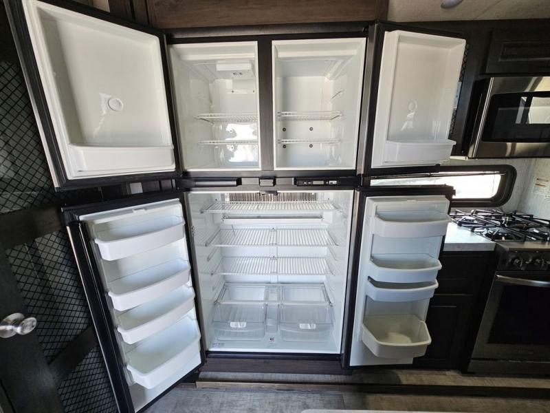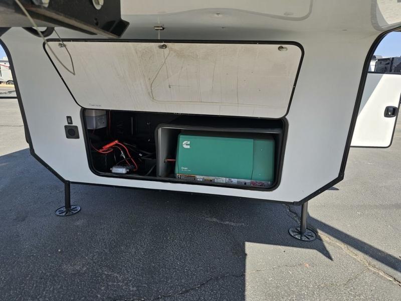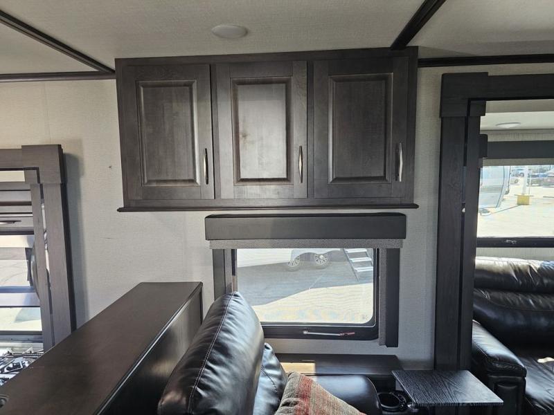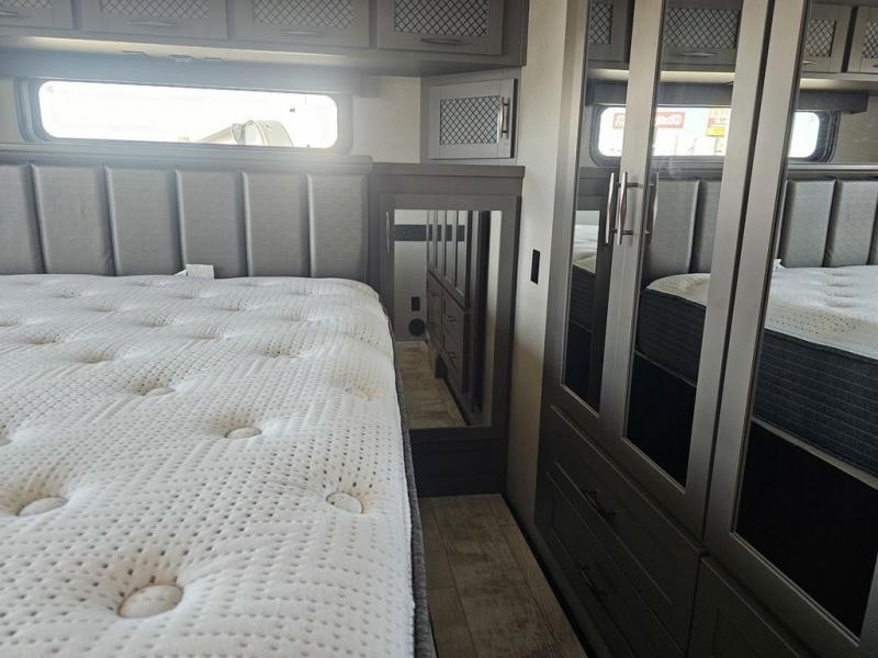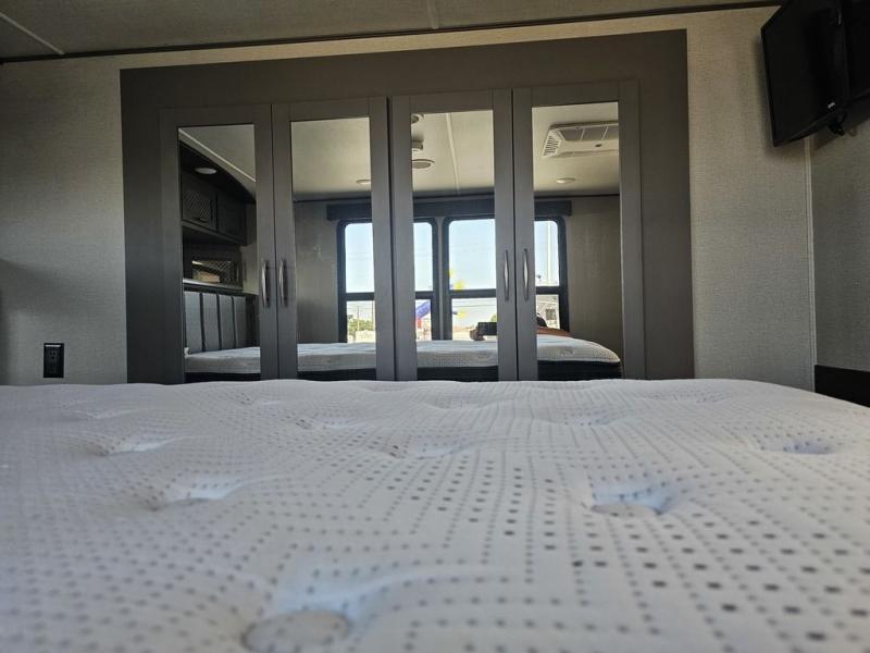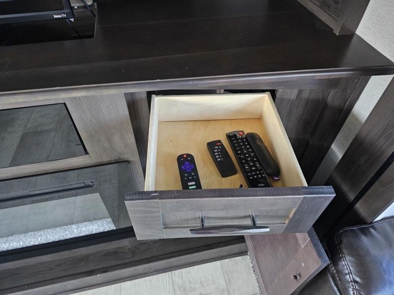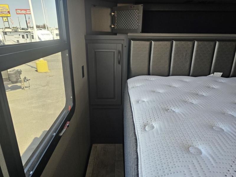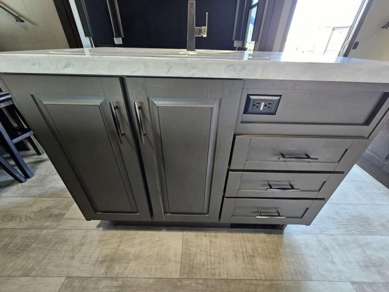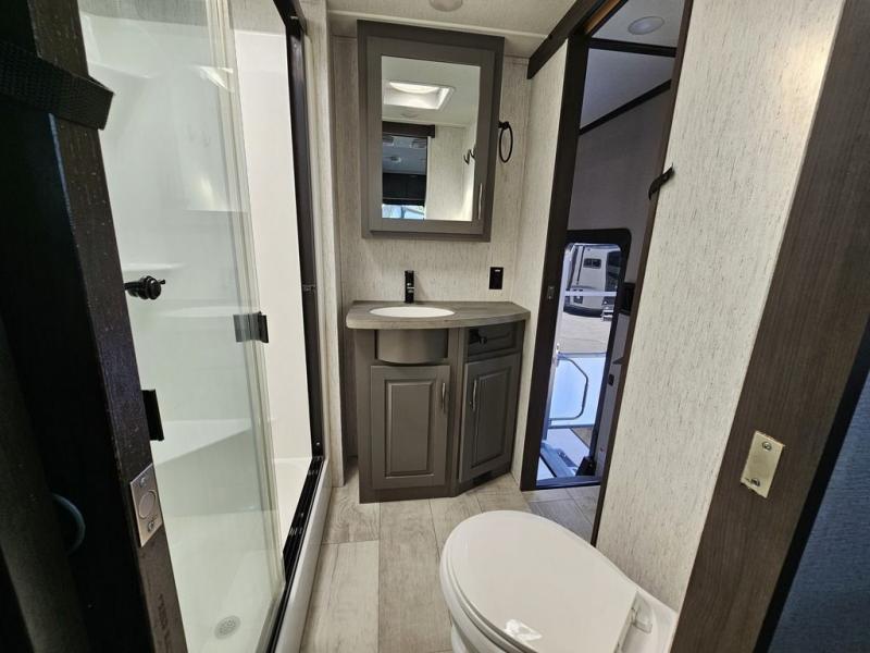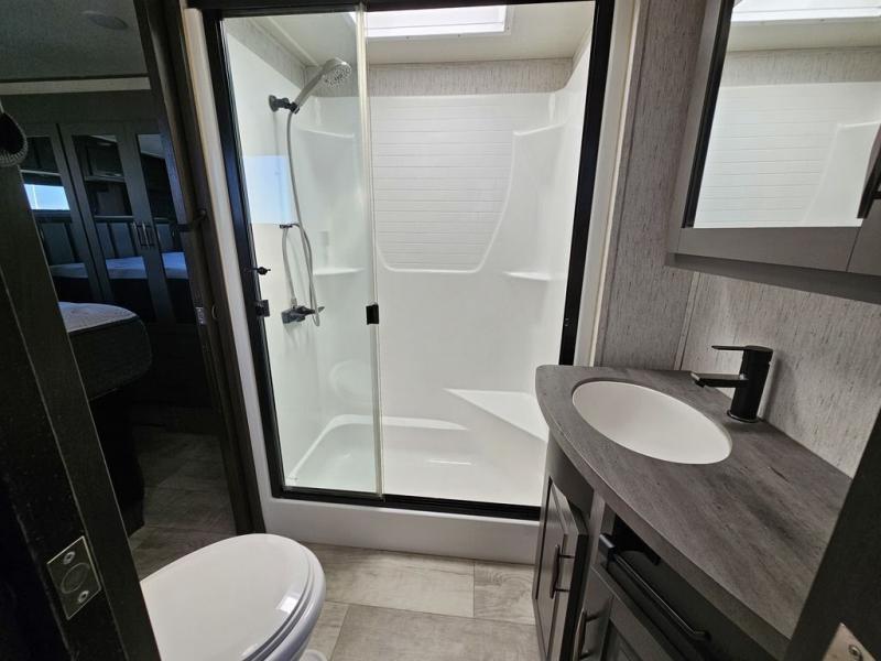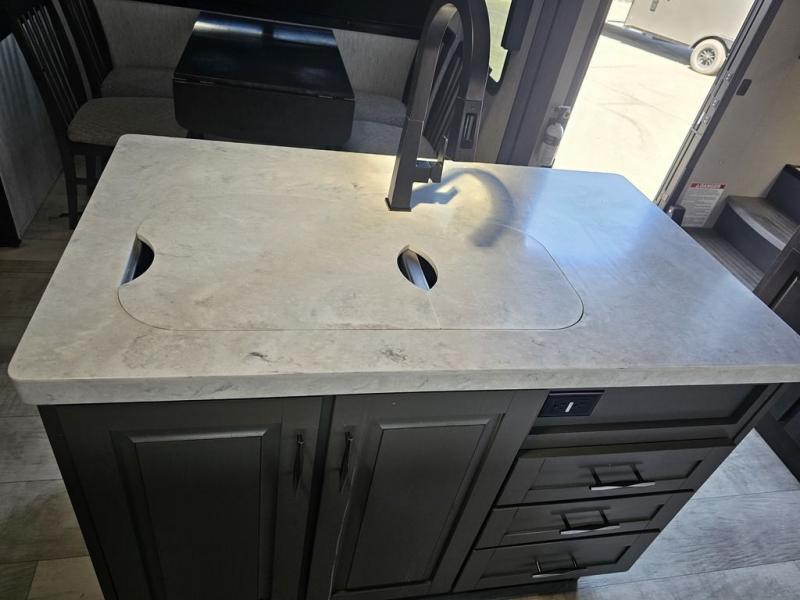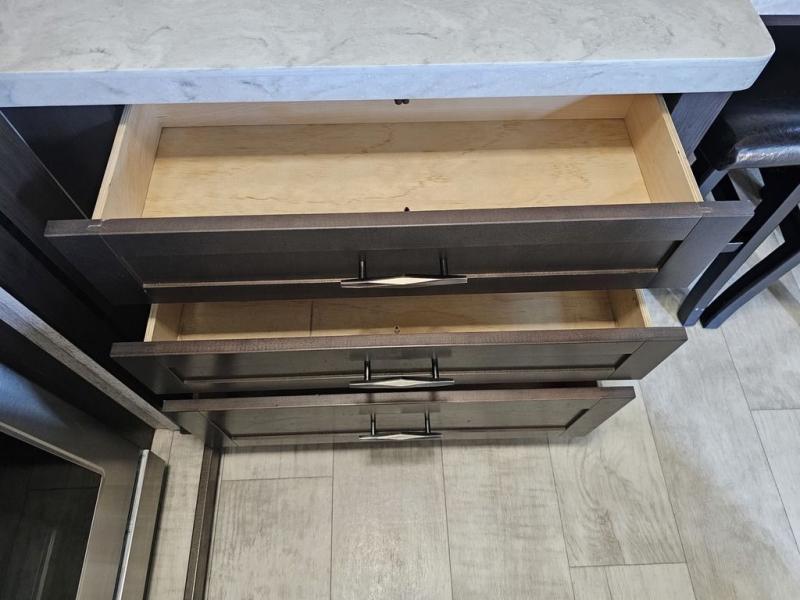 This Momentum toy hauler is wonderfully modern and luxurious with three LED TVs, an electric fireplace, a master suite, theater seating with heat/massage, an 18-cubic foot refrigerator, and an outdoor kitchen! The interior feels residential since it has a separate living room up at the front, and the kitchen is stocked with all of the essentials plus a few extras, like a desk and free-standing dinette with chairs. The dual-entry bathroom has a main entrance in the hallway and a second private entrance into the bedroom. With a skylight above the shower, you'll be able to rinse off while the sunshine streams through, and the two exterior pass-through storage compartments will allow you to bring even more gear in addition to what you have in the below-floor garage.