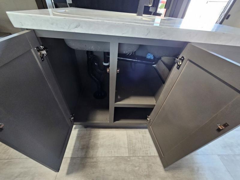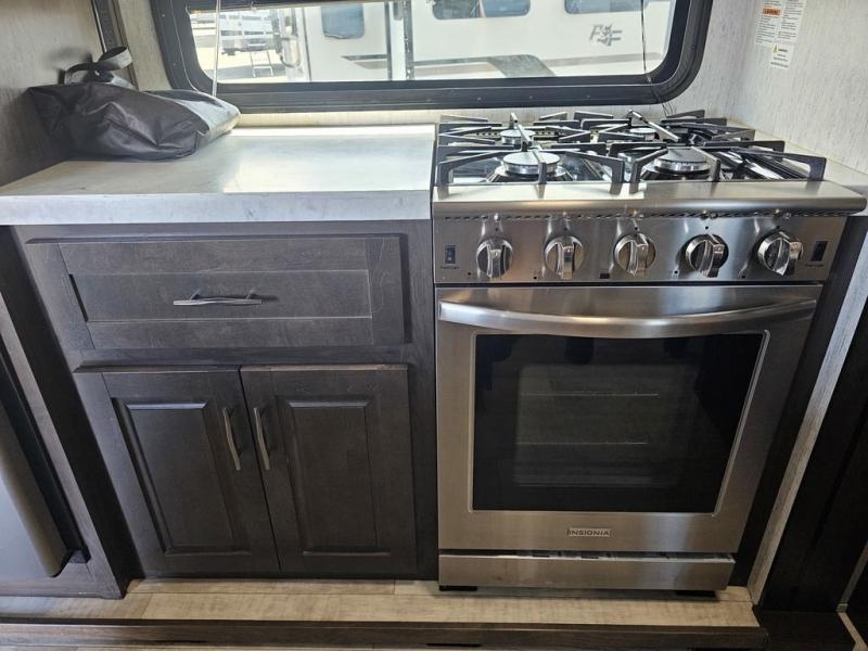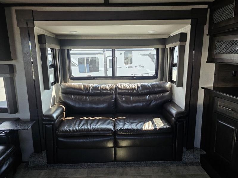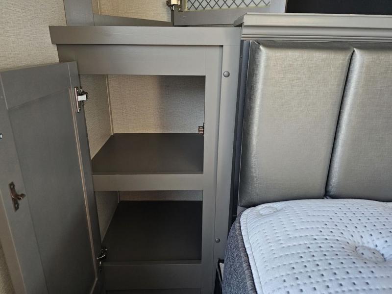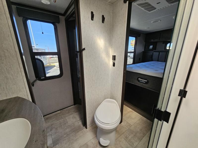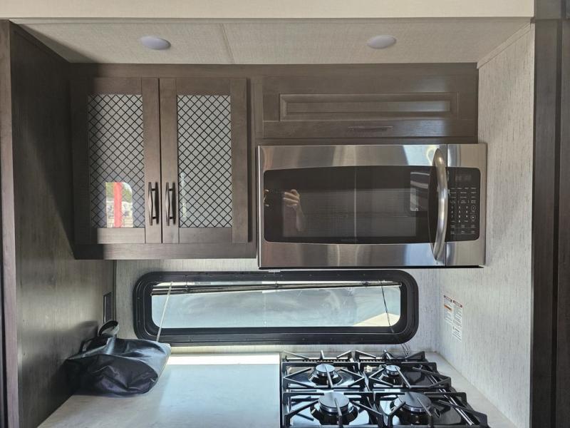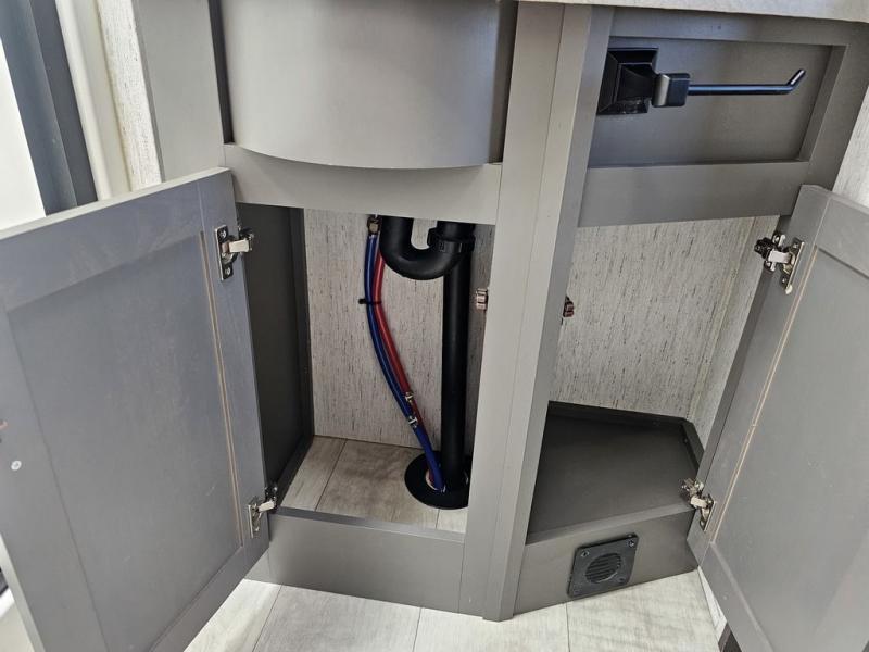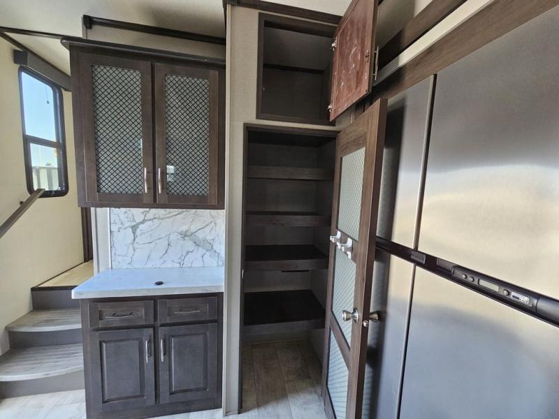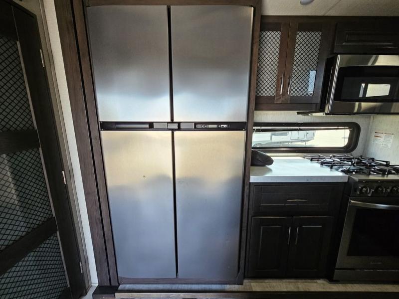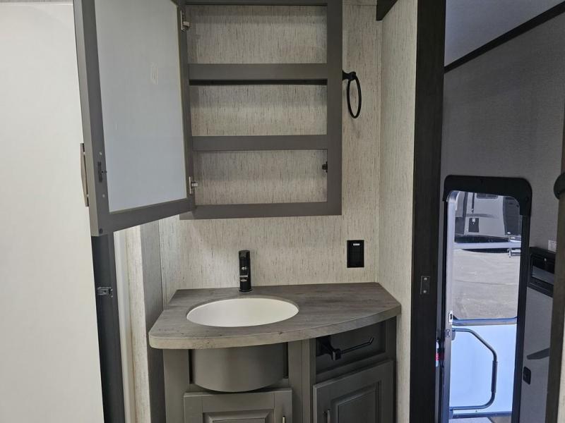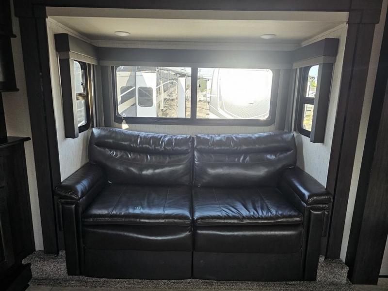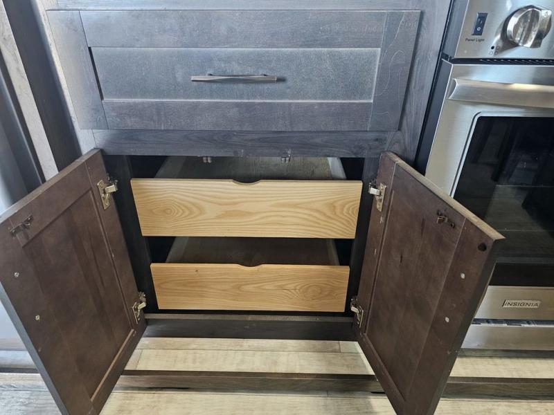 This Momentum toy hauler is wonderfully modern and luxurious with three LED TVs, an electric fireplace, a master suite, theater seating with heat/massage, an 18-cubic foot refrigerator, and an outdoor kitchen! The interior feels residential since it has a separate living room up at the front, and the kitchen is stocked with all of the essentials plus a few extras, like a desk and free-standing dinette with chairs. The dual-entry bathroom has a main entrance in the hallway and a second private entrance into the bedroom. With a skylight above the shower, you'll be able to rinse off while the sunshine streams through, and the two exterior pass-through storage compartments will allow you to bring even more gear in addition to what you have in the below-floor garage.