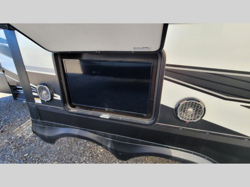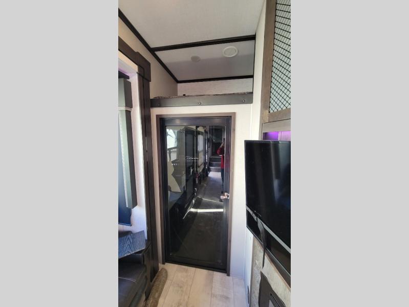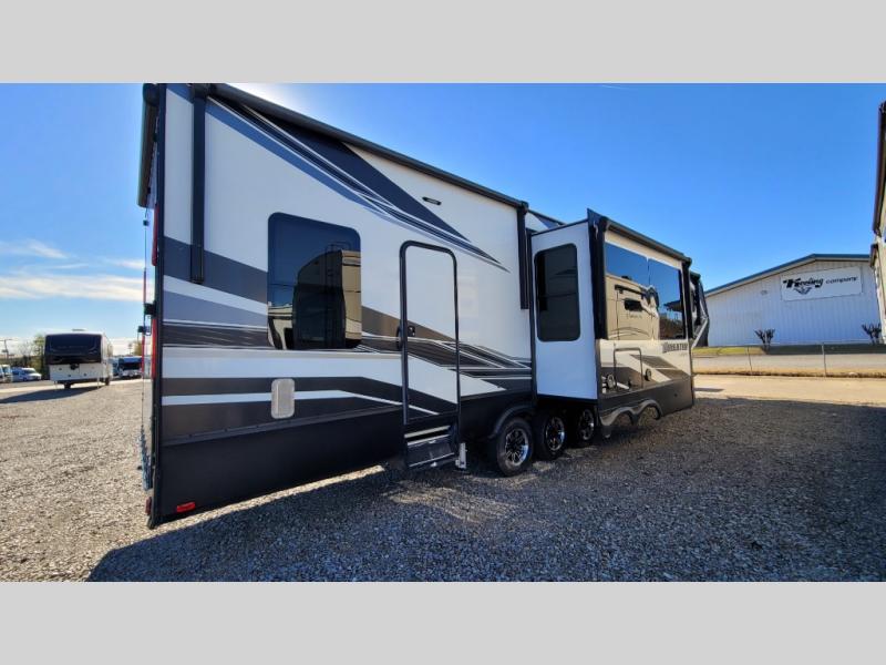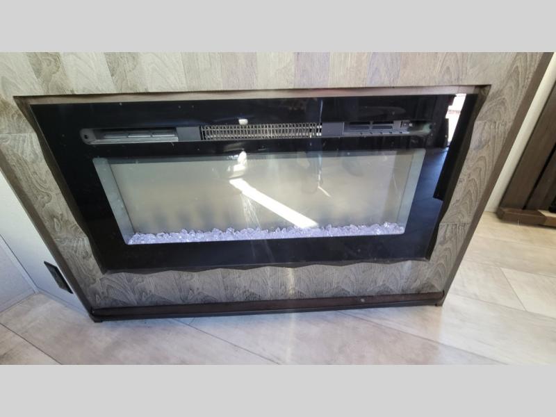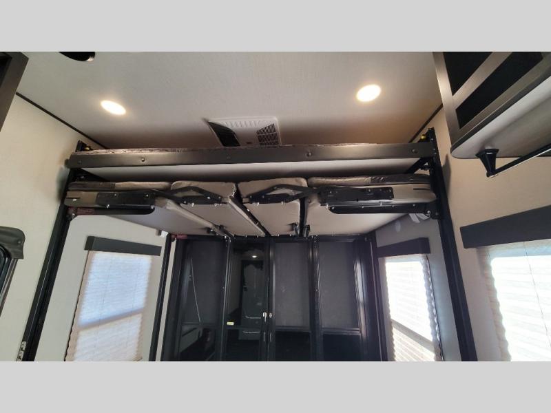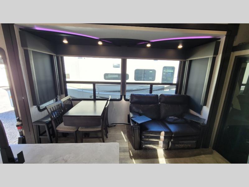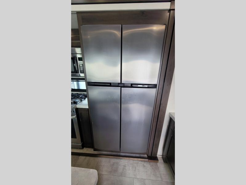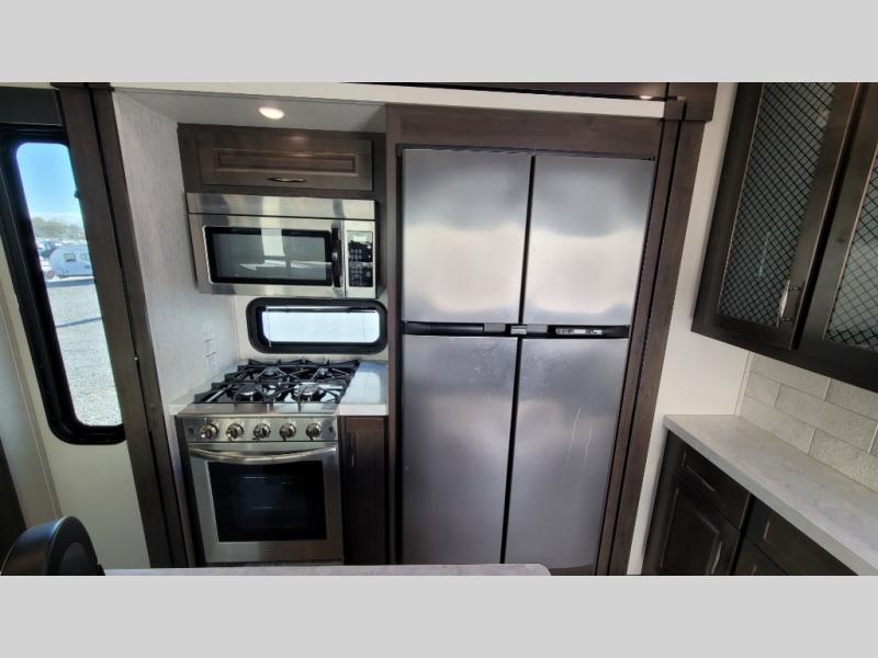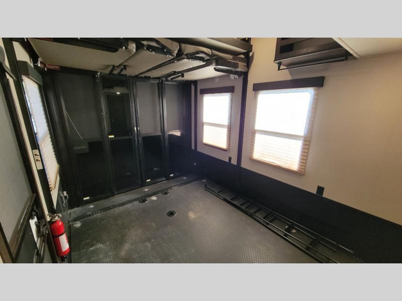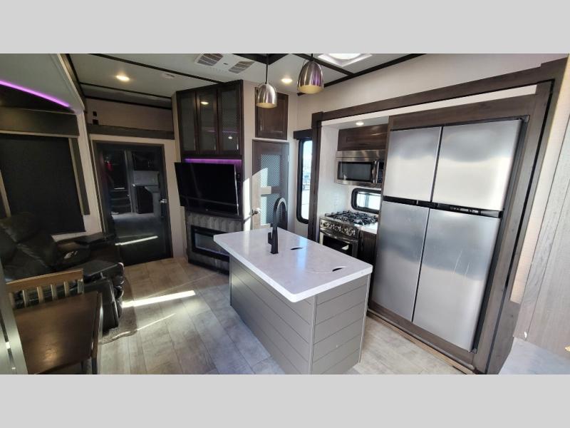 This Momentum toy hauler provides the maximum entertainment with its 49" LED TV in the living area, 32" LED TV in the private bedroom, 32" LED TV in the 12' 6" separate garage, and exterior LED TV! You can choose to add the optional Super Sofa which will create an amazingly comfortable area to sit down across from the electric fireplace. The two full bathrooms are one of the most impressive features found on this unit, and the three power awnings are another shocking addition. Within the kitchen, you'll be able to prepare all of your family's favorite dishes when you use the chef-inspired range and oven, and the window behind the range allows you to view the campsite while you cook. If you would prefer to have a residential refrigerator, you should check out model 397TH-R!