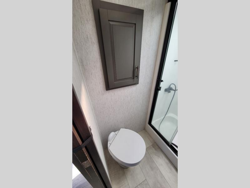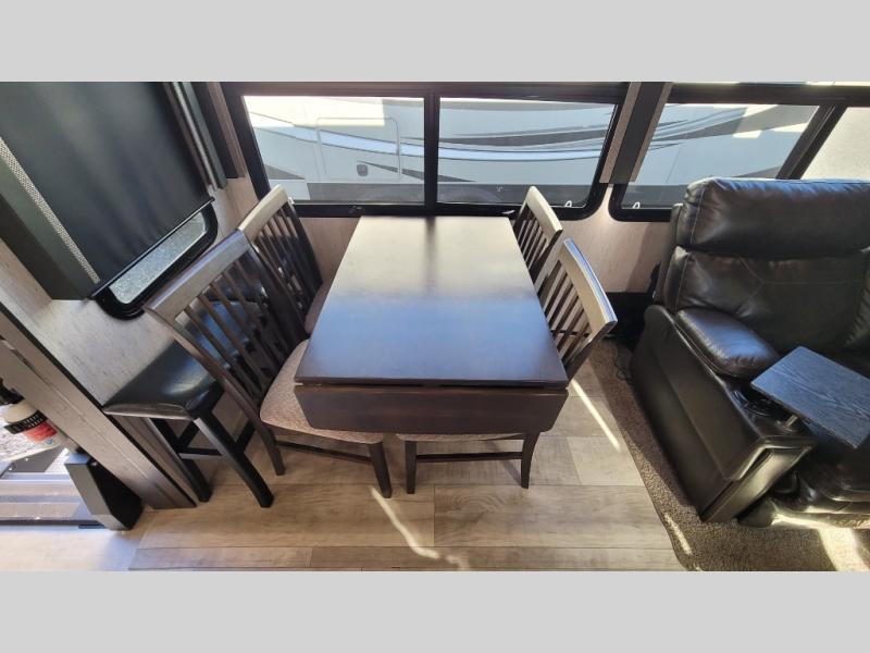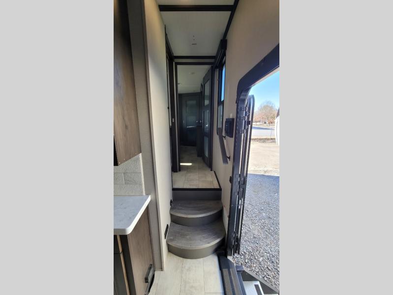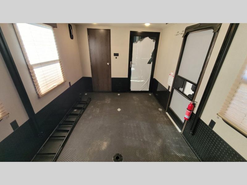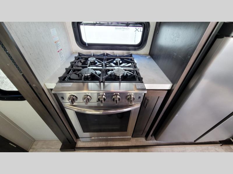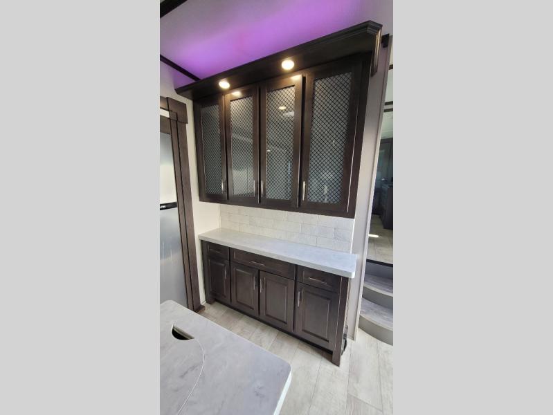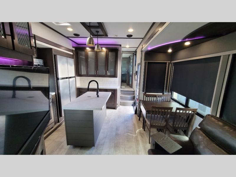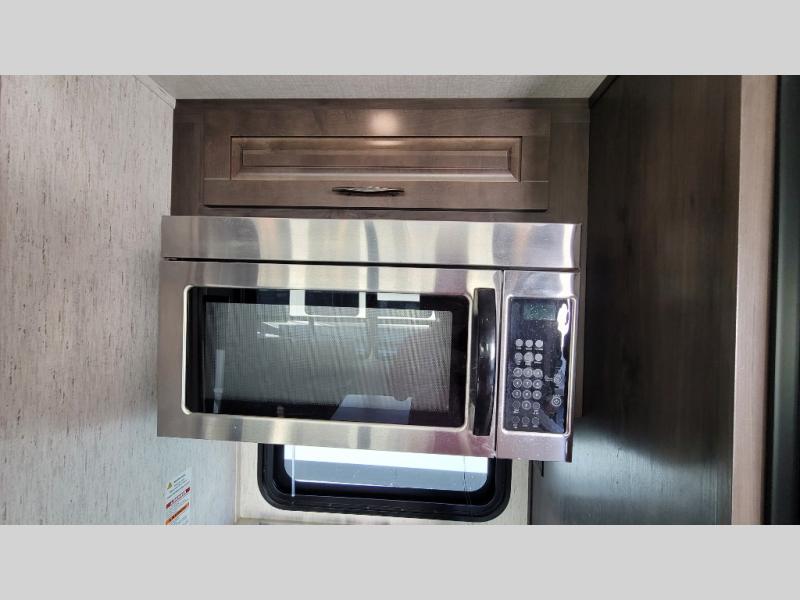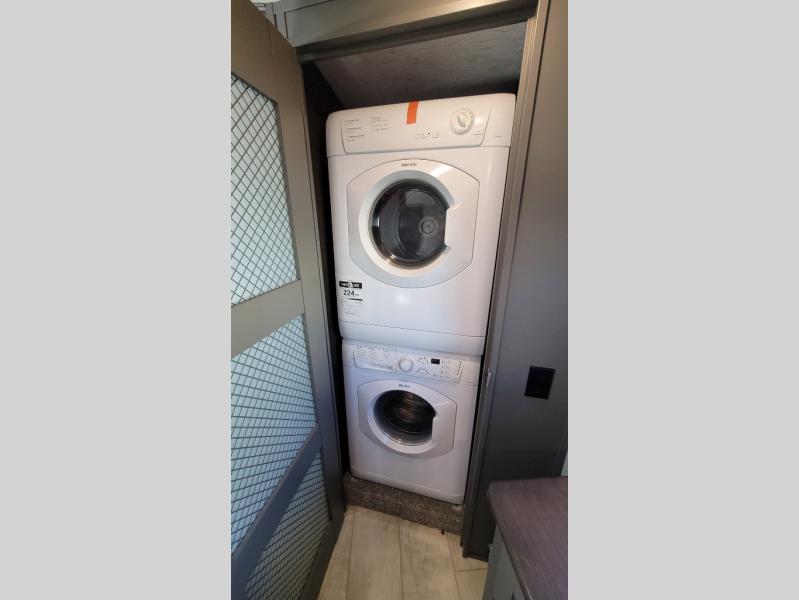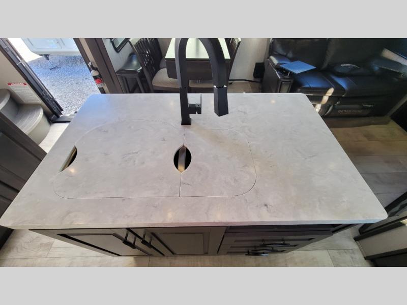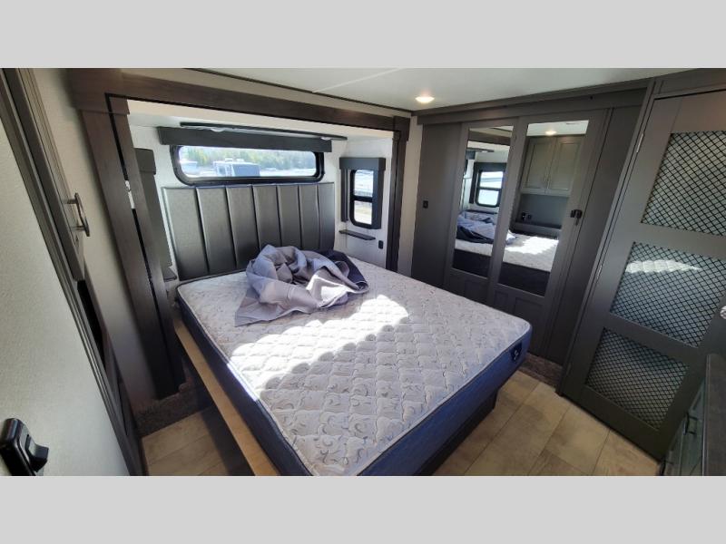 This Momentum toy hauler provides the maximum entertainment with its 49" LED TV in the living area, 32" LED TV in the private bedroom, 32" LED TV in the 12' 6" separate garage, and exterior LED TV! You can choose to add the optional Super Sofa which will create an amazingly comfortable area to sit down across from the electric fireplace. The two full bathrooms are one of the most impressive features found on this unit, and the three power awnings are another shocking addition. Within the kitchen, you'll be able to prepare all of your family's favorite dishes when you use the chef-inspired range and oven, and the window behind the range allows you to view the campsite while you cook. If you would prefer to have a residential refrigerator, you should check out model 397TH-R!