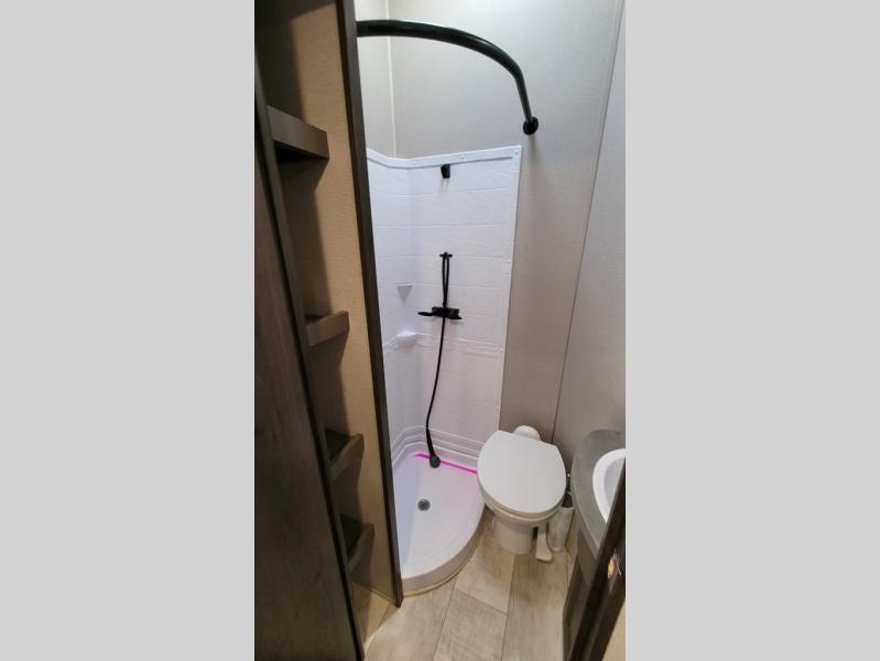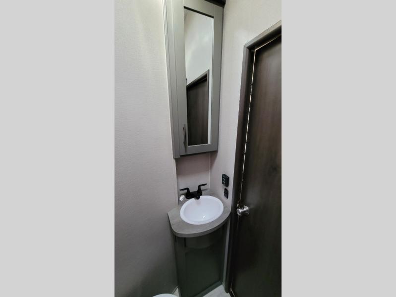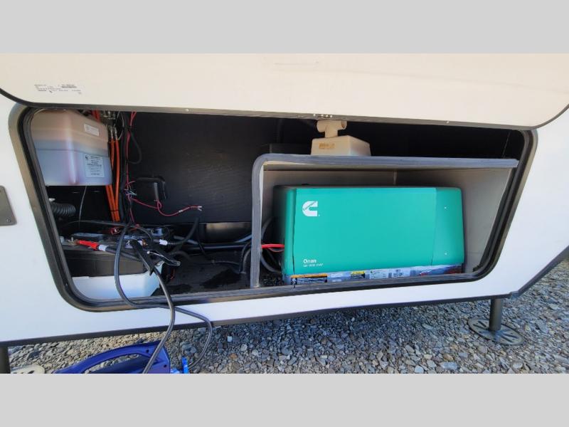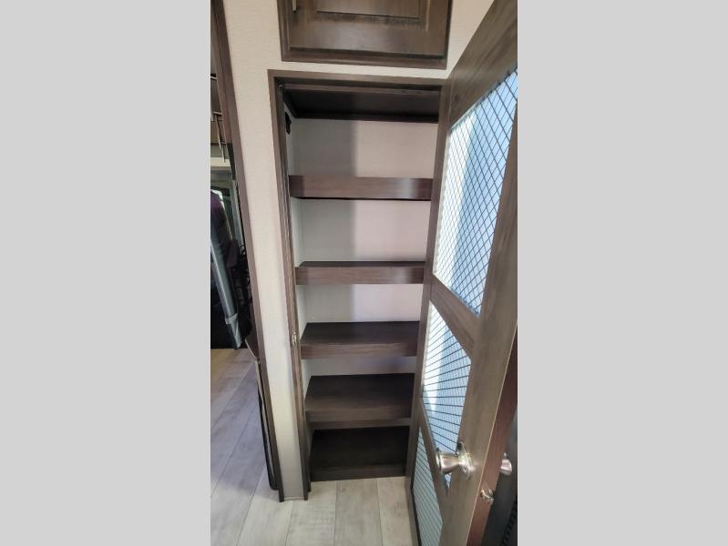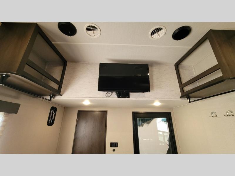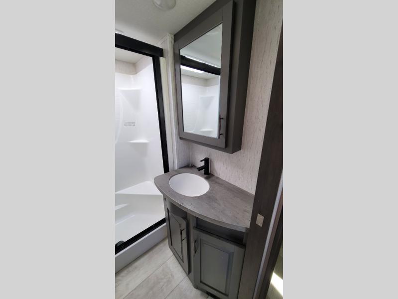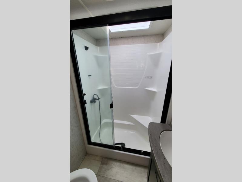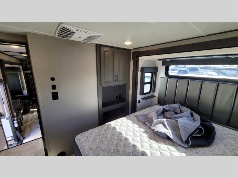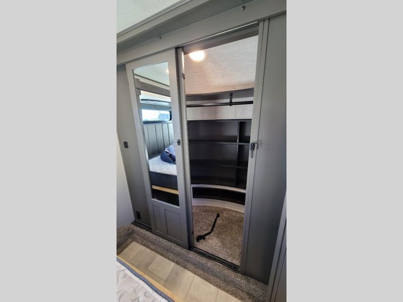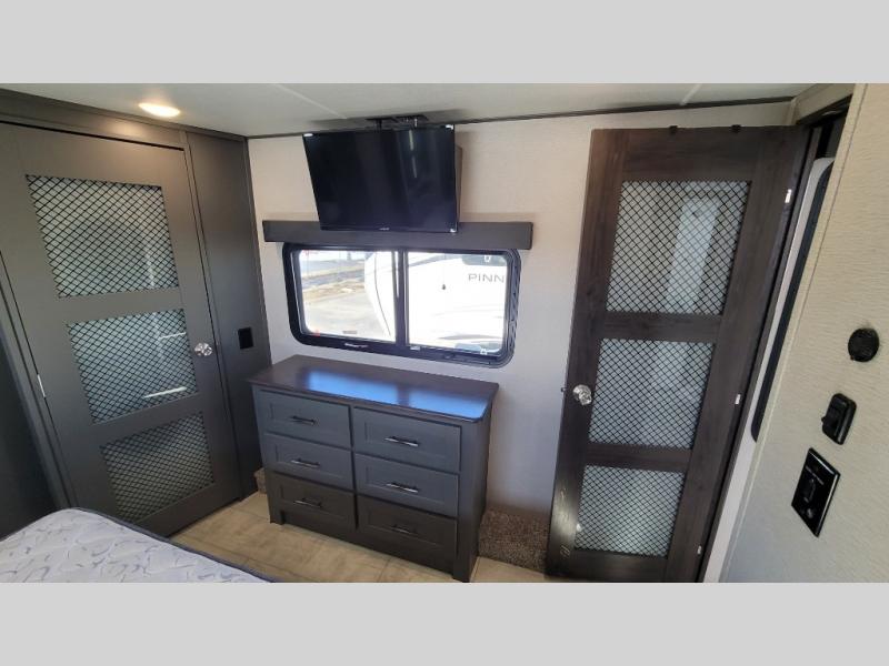This Momentum toy hauler provides the maximum entertainment with its 49" LED TV in the living area, 32" LED TV in the private bedroom, 32" LED TV in the 12' 6" separate garage, and exterior LED TV! You can choose to add the optional Super Sofa which will create an amazingly comfortable area to sit down across from the electric fireplace. The two full bathrooms are one of the most impressive features found on this unit, and the three power awnings are another shocking addition. Within the kitchen, you'll be able to prepare all of your family's favorite dishes when you use the chef-inspired range and oven, and the window behind the range allows you to view the campsite while you cook. If you would prefer to have a residential refrigerator, you should check out model 397TH-R!