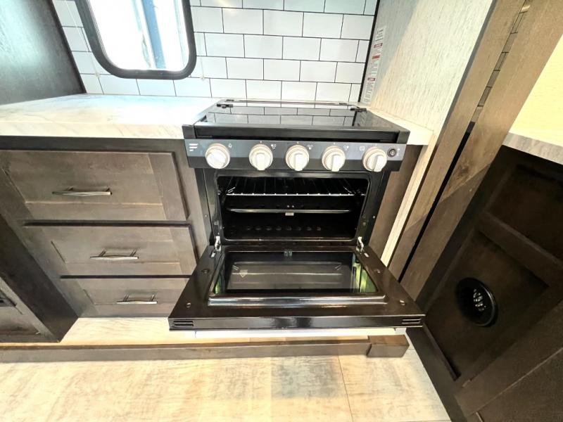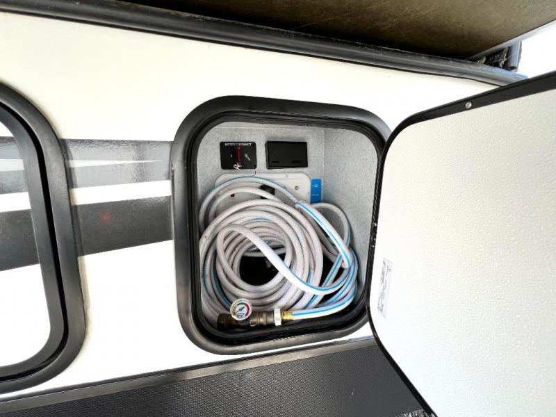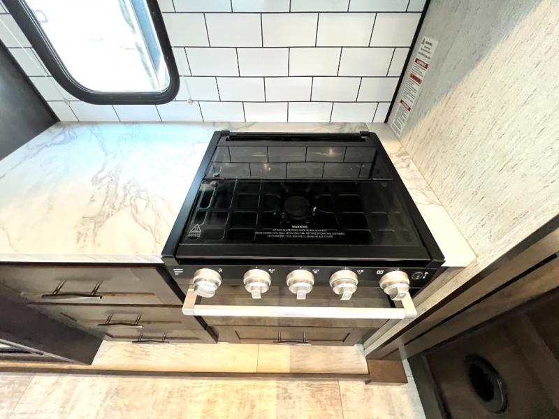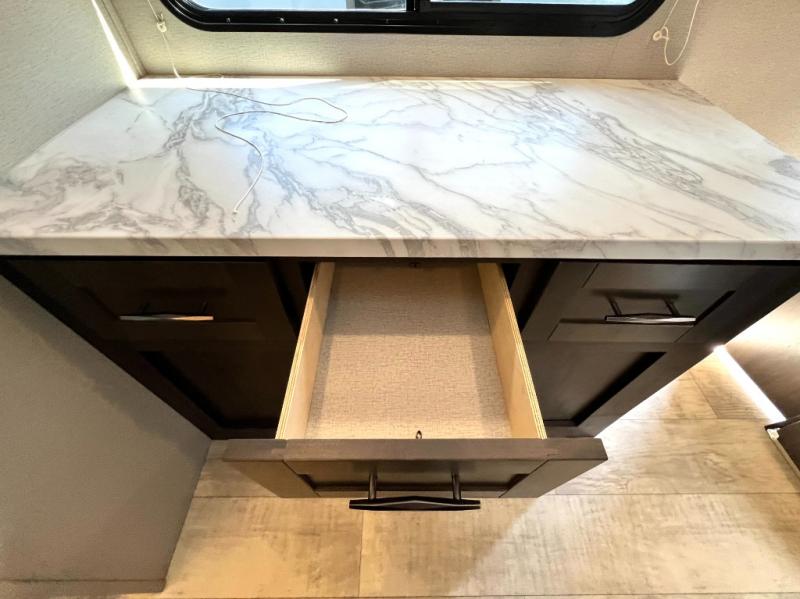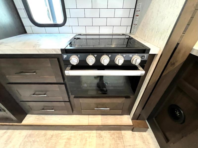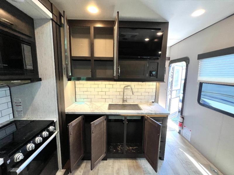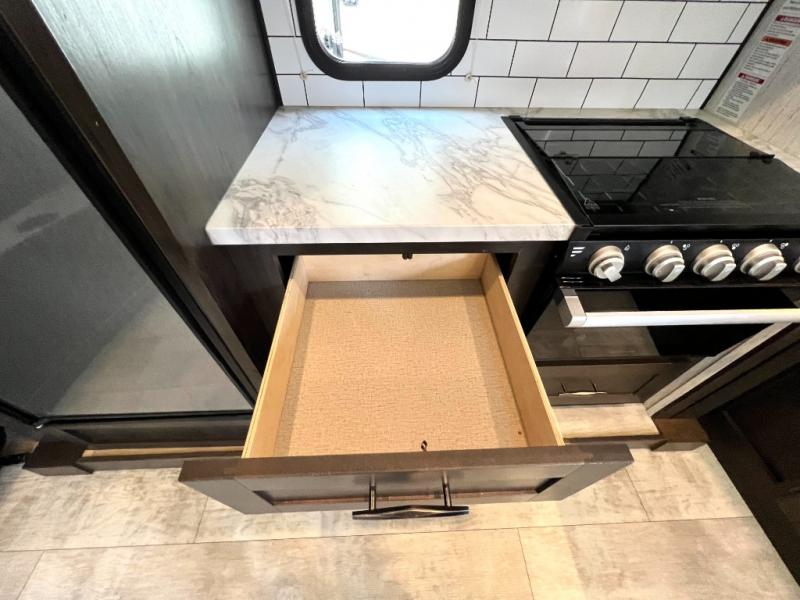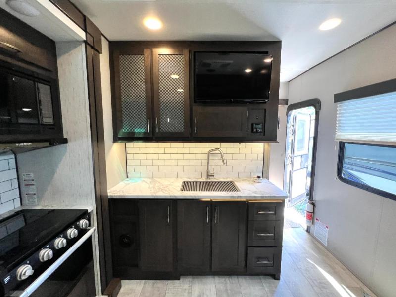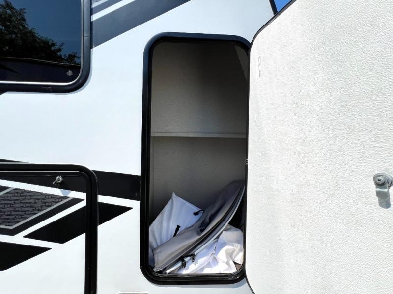 It's time to load up your family and off-road toys to enjoy the great outdoors at the speed you like with this Momentum G-Class toy hauler. Once at your destination, unload the toys from the 13' 6" of cargo space, put out the two slides, and start having fun. You can cook meals in the spacious kitchen area with extra counter space and relax in the Euro chairs or on the rollover sofas with a table. You can even cook at the outside kitchen underneath the 19' power awning. Once it's bedtime, the kids can sleep on the Happi-Jac power bunk or rollover sofas in the main area, and everyone is sure to appreciate the USB charging outlets to keep the electronics up and running just like the fuel station will do for the toys.