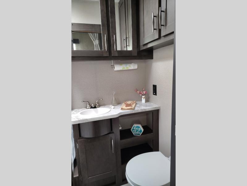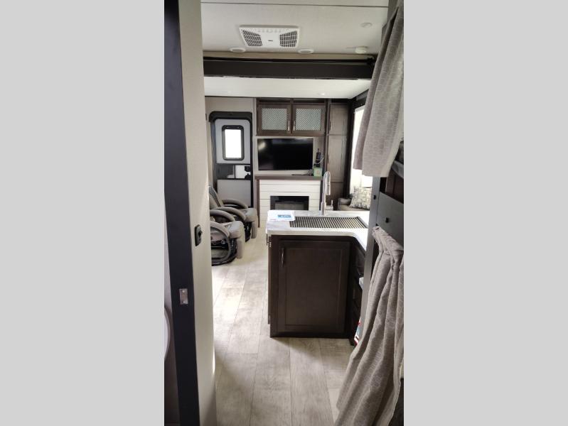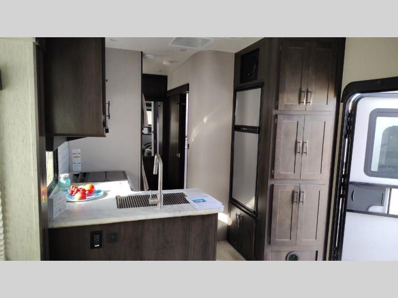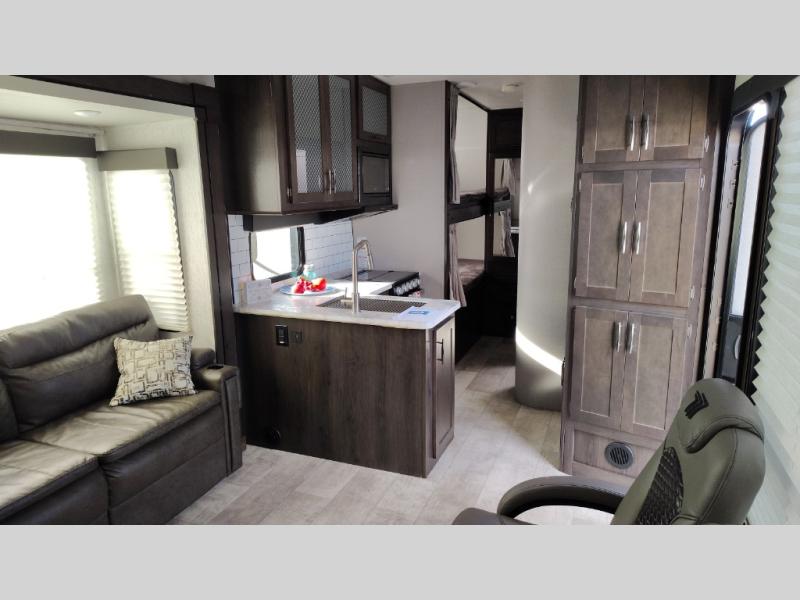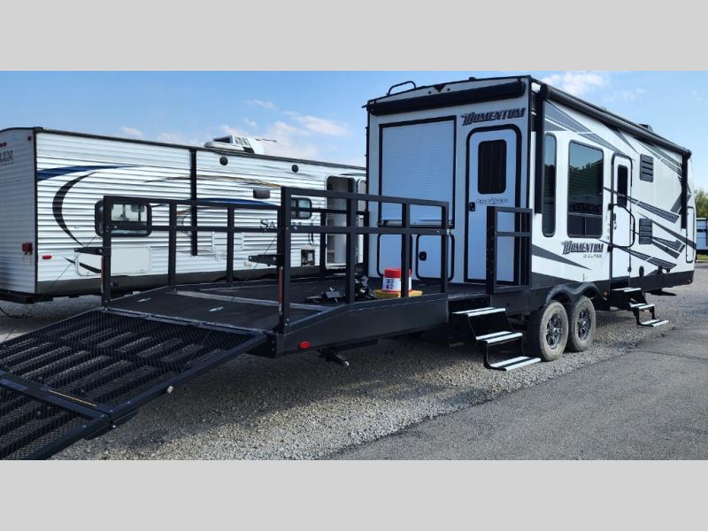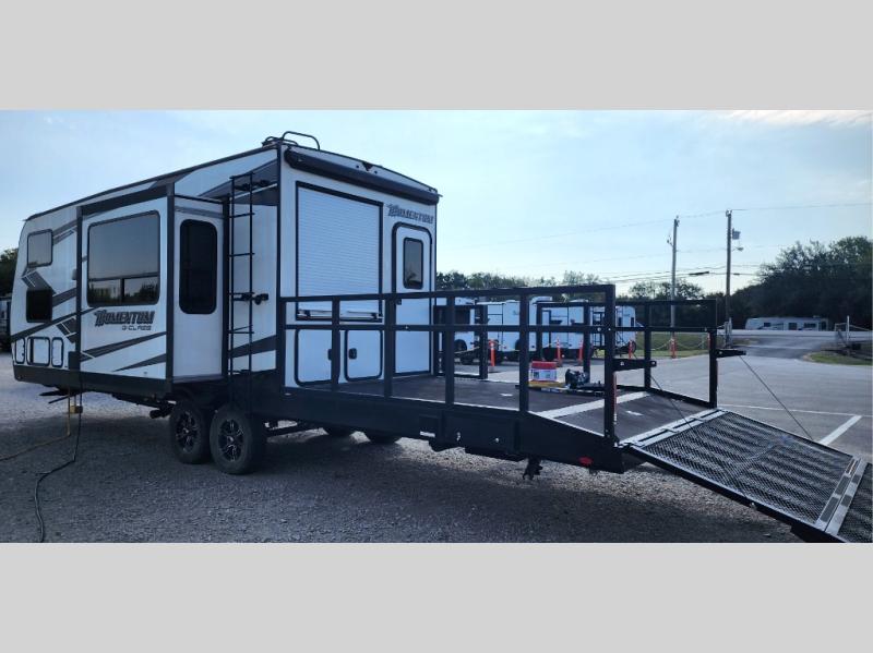 Stop waiting to take the adventure of a lifetime and let that adventure begin today with the Momentum G-Class toy hauler! This trailer is set up perfectly to ensure that each of your excursions are as much fun as they could possibly be. The attached open garage allows you to bring along whatever toy is your favorite, and the outdoor kitchen gives you a place to cook dinner while you are out in the fresh air. Once you do head inside, you will be welcomed by a cozy living area with a fold-down sofa bed, dual lounge chairs, and an entertainment center with a fireplace and LED HDTV. A full bathroom will come in handy at any time of the day, and the residential walk-in shower will certainly make you feel right at home.