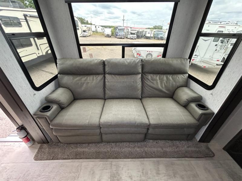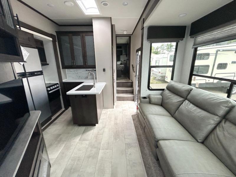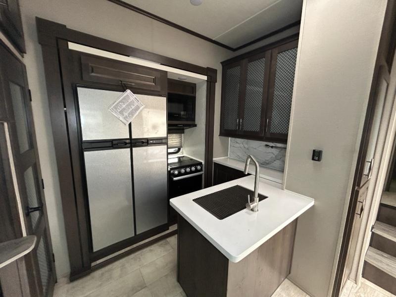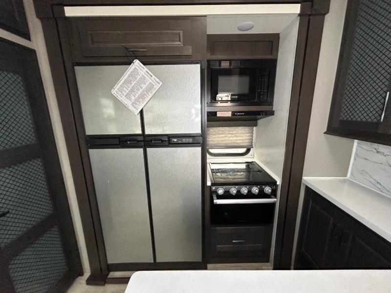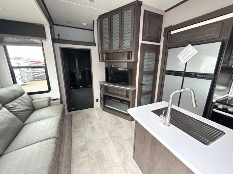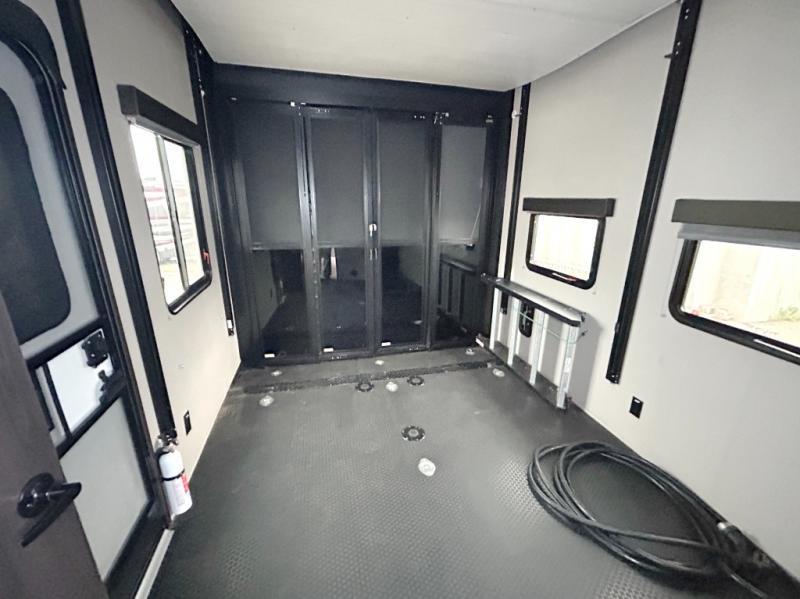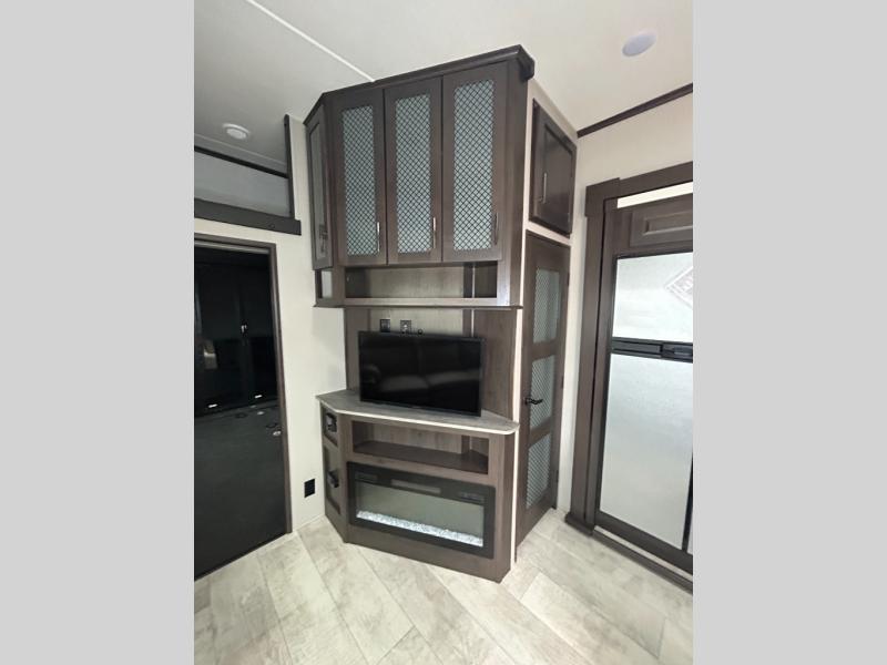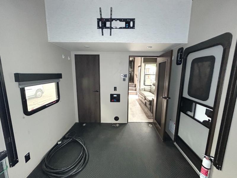 Are you looking forward to arriving at your destination, unloading your toys from an 11' separate garage, and heading out to the dunes? You can return to this Momentum G-Class toy hauler afterwards to find the convenience of having a full and half bath, two entry doors, and a loft bed. The rear ramp door can even be converted into a patio, plus there are Rockford Fosgate speakers to keep the party going! You will also appreciate the separate living area with a fireplace, theater seating, and full kitchen amenities. The front bedroom offers an escape to rest and relax for the next ride. Take a look outside and inside because you will be sold!