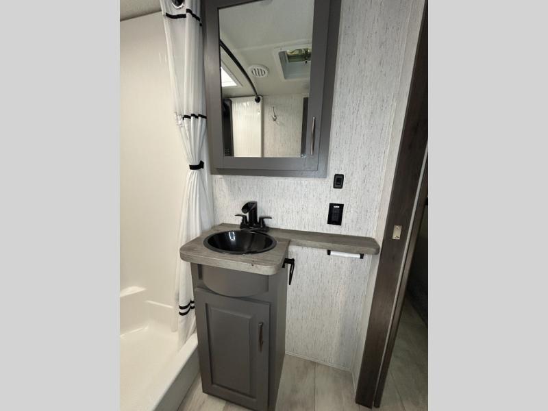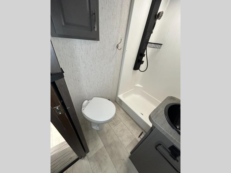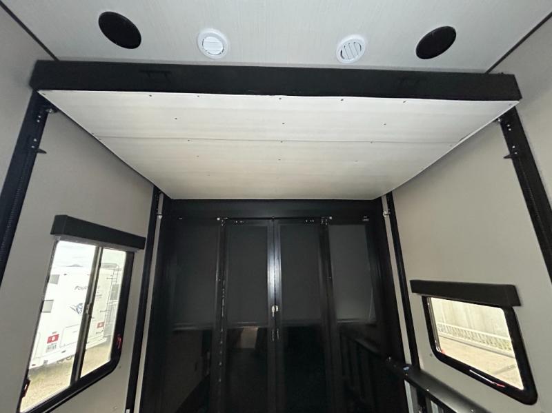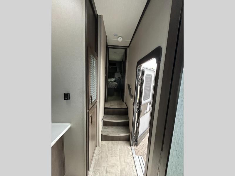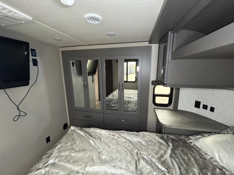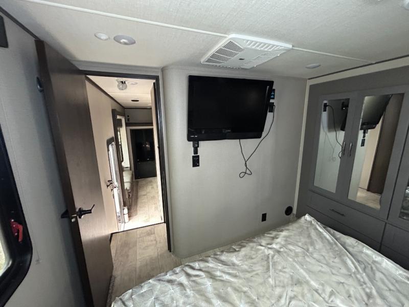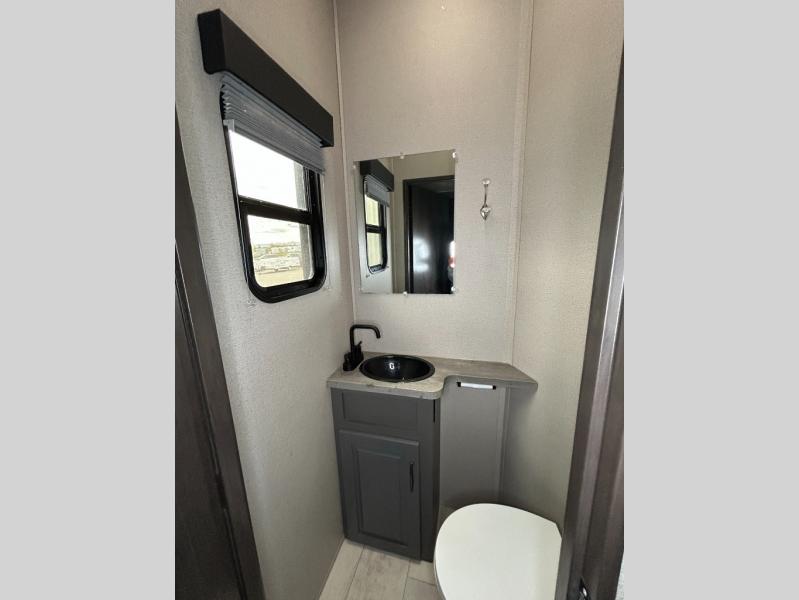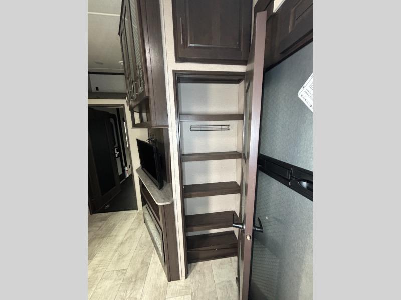 Are you looking forward to arriving at your destination, unloading your toys from an 11' separate garage, and heading out to the dunes? You can return to this Momentum G-Class toy hauler afterwards to find the convenience of having a full and half bath, two entry doors, and a loft bed. The rear ramp door can even be converted into a patio, plus there are Rockford Fosgate speakers to keep the party going! You will also appreciate the separate living area with a fireplace, theater seating, and full kitchen amenities. The front bedroom offers an escape to rest and relax for the next ride. Take a look outside and inside because you will be sold!
