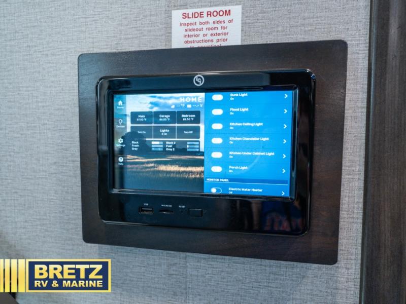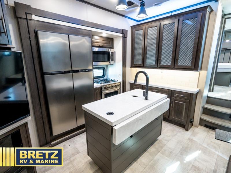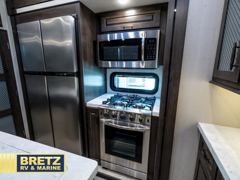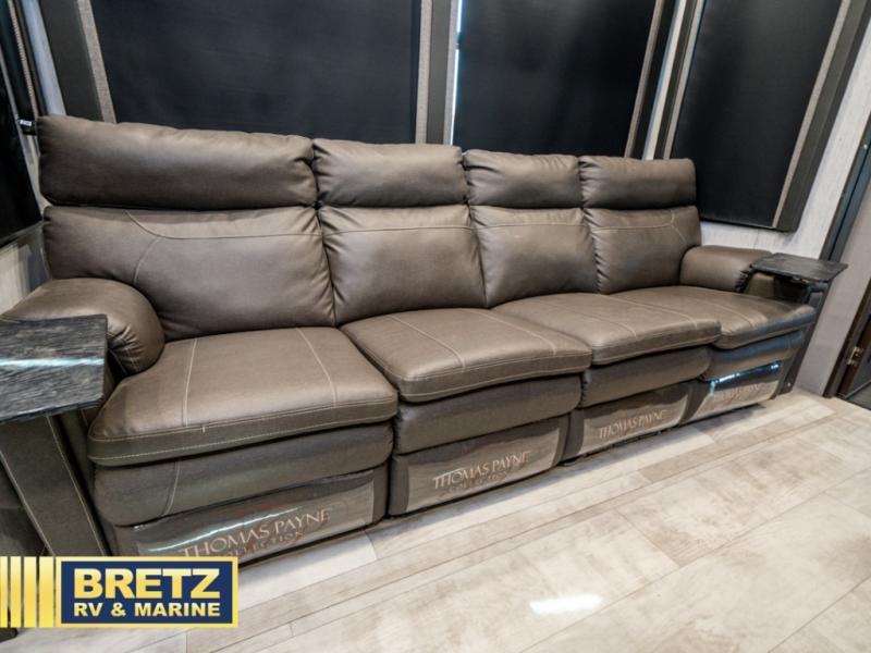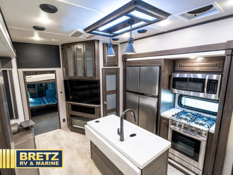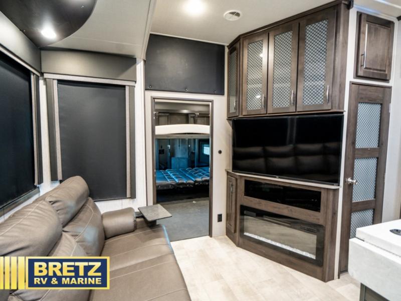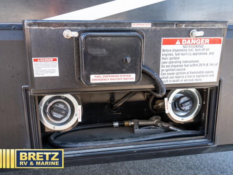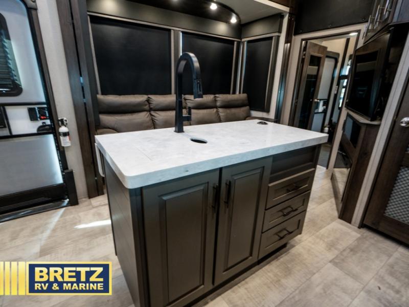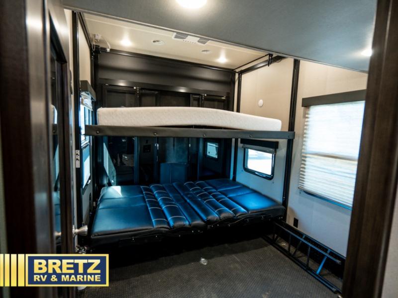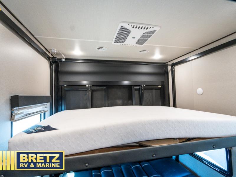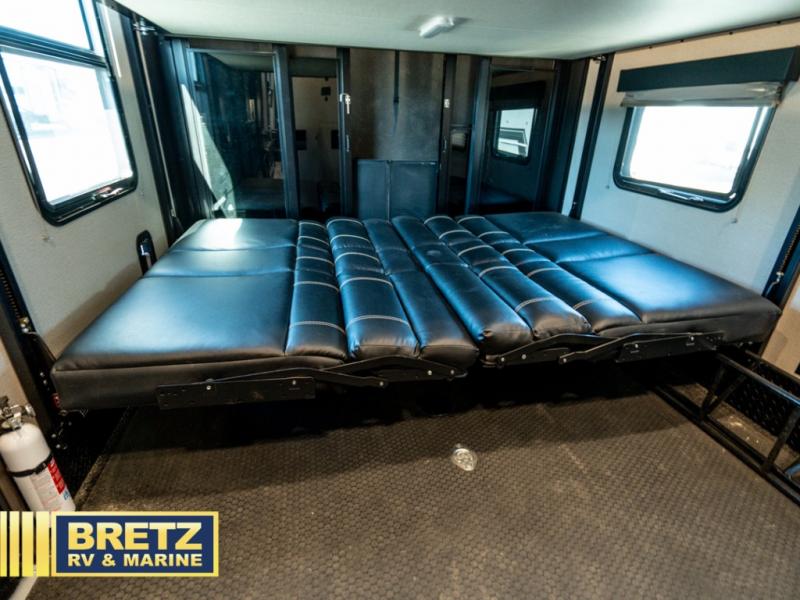 Everyone will stay clean with a full and half bath in this Momentum M-Class toy hauler, plus there is an exterior spray port to keep the sand outside! The kitchen is decked out in everything you will need to create a home-cooked meal including a kitchen island with bar stools, a fold-up countertop, and a USB charging port to keep your phone close by as it charges. There is also a hutch to store your nice dishes and a microwave for those nights when you don't feel like cooking. The four-seat sofa slide has a storable table for you to eat your meals and play a card game while you enjoy the entertainment center. The front private bedroom has a queen bed with USB charging outlets on either side and a wardrobe slide with drawers to keep your clothes looking their best! If you would prefer to have a residential refrigerator, you should check out model 351M-R!