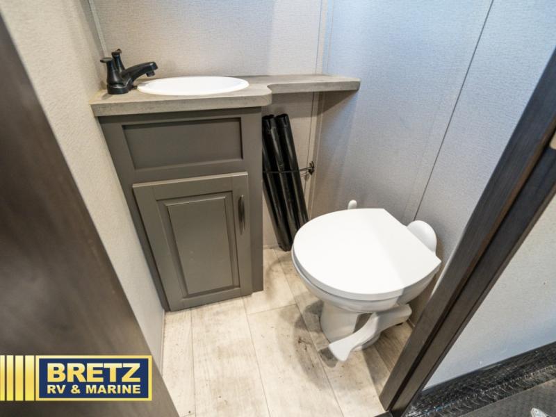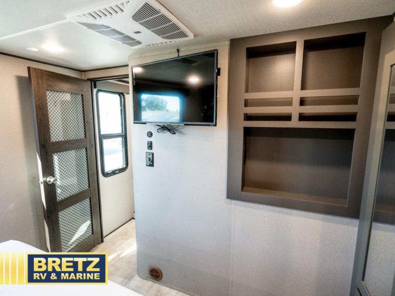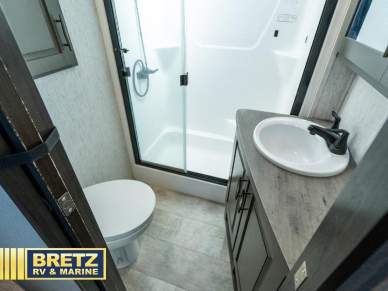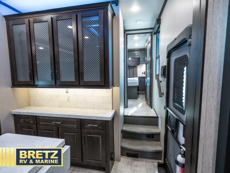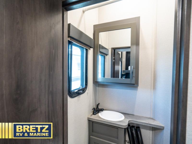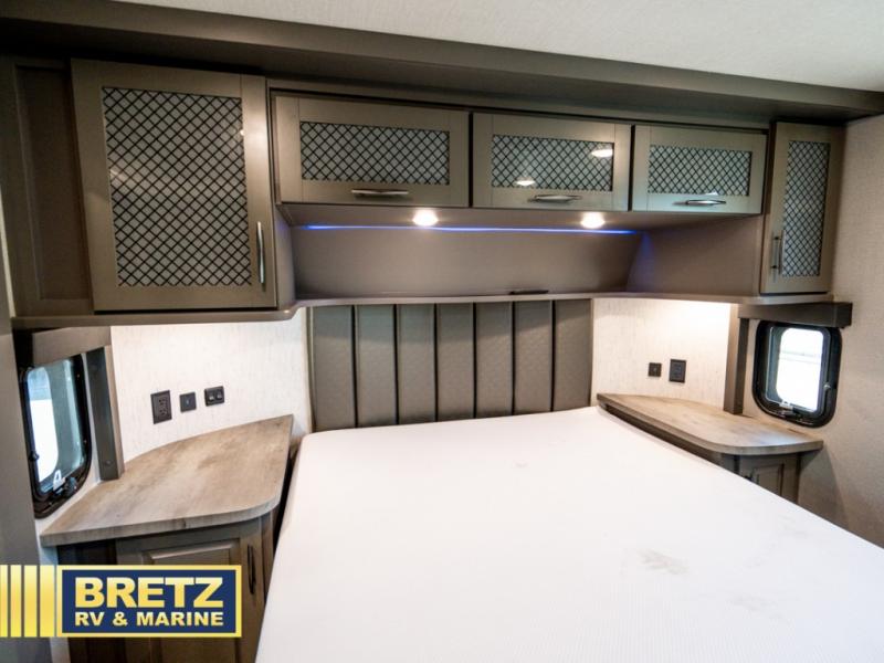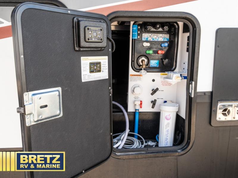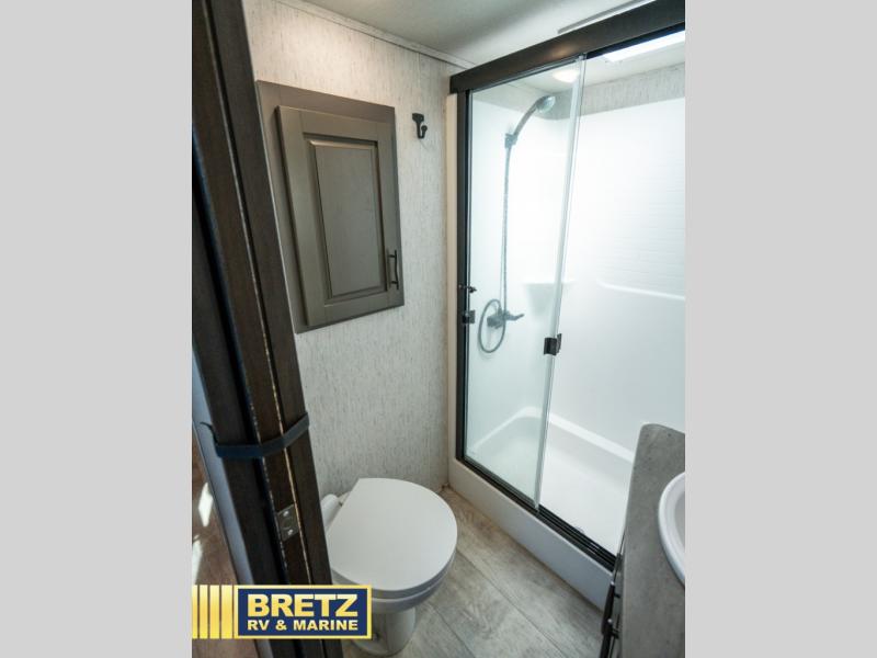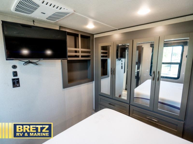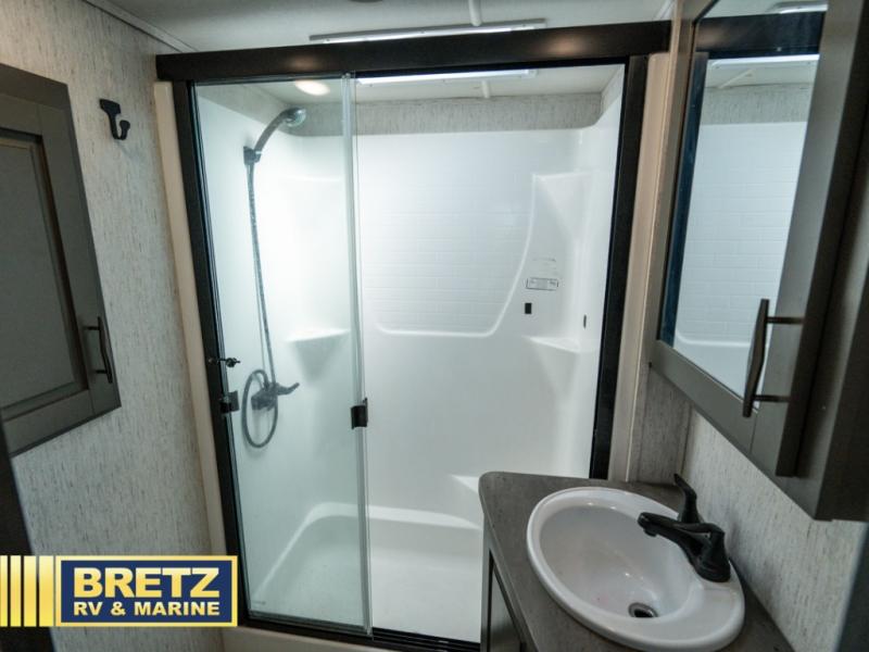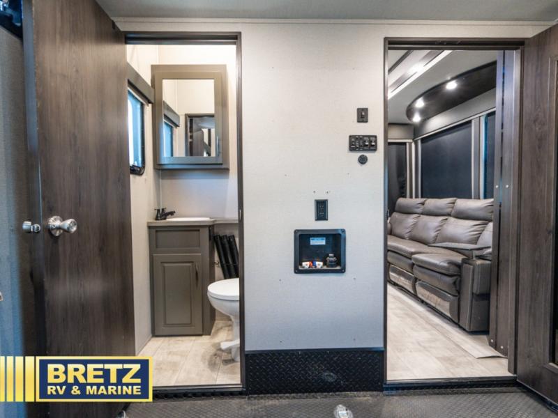 Everyone will stay clean with a full and half bath in this Momentum M-Class toy hauler, plus there is an exterior spray port to keep the sand outside! The kitchen is decked out in everything you will need to create a home-cooked meal including a kitchen island with bar stools, a fold-up countertop, and a USB charging port to keep your phone close by as it charges. There is also a hutch to store your nice dishes and a microwave for those nights when you don't feel like cooking. The four-seat sofa slide has a storable table for you to eat your meals and play a card game while you enjoy the entertainment center. The front private bedroom has a queen bed with USB charging outlets on either side and a wardrobe slide with drawers to keep your clothes looking their best! If you would prefer to have a residential refrigerator, you should check out model 351M-R!