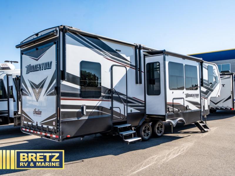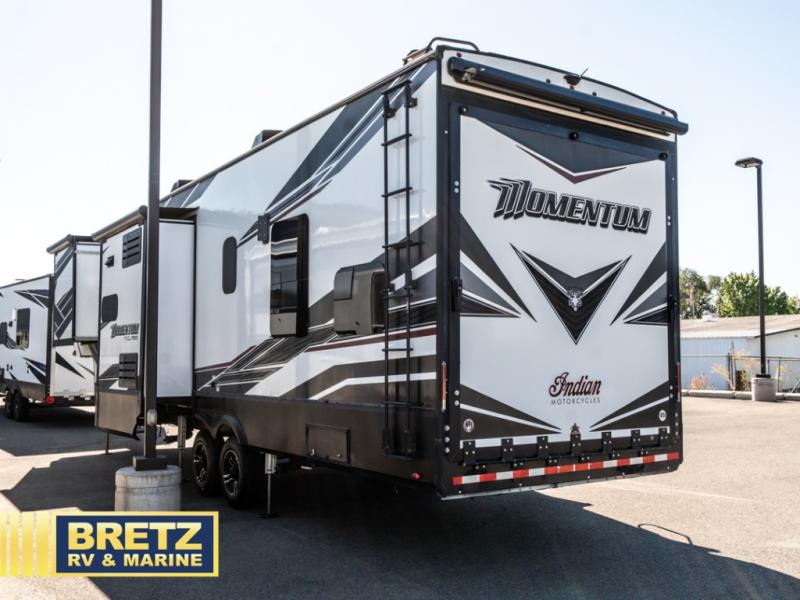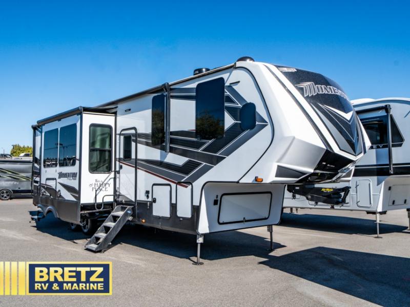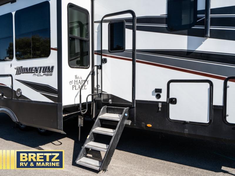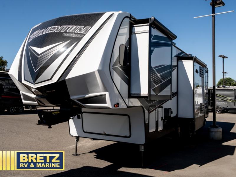 Live big and play even harder with any one of these Momentum M-Class toy hauler fifth wheels by Grand Design! The CRE3000 MORryde® suspension system improves its towability with a smoother tow and better protects from damaging road shock. Unlike many other toy haulers, Momentum features an exclusive garage floor design with an R-40 triple insulation in the garage floors and a Weather-Tek insulation throughout the roof, main floor, and side walls. Pump up the volume and shake things up with the optional Rockford Fosgate speaker package that comes with a 12" subwoofer and a 300W amp. You will also enjoy the fully enclosed fuel pump station, the door-side exterior spray port, and the four mandatory packages full of extra features that will make your next camping adventure luxurious!