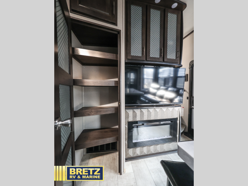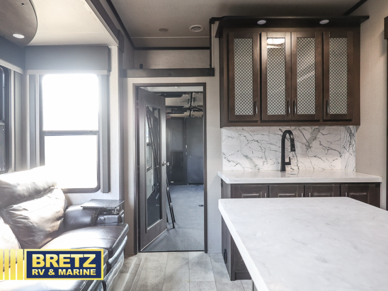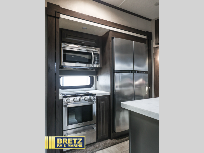 This Momentum M-Class toy hauler is decked out in luxurious features you will want on your next outdoor adventure! With 18' of cargo space and a rear ramp door, you can bring along your favorite off-road toys too. You will start each morning feeling clean and fresh after a good night's rest on the queen bed in the front private bedroom and showering in the sunken tub with seat and skylight above. The kitchen has everything you will need to create home-cooked meals as well as a kitchen island with two bar stools and a USB charging port. Grab a snack from the kitchen pantry and relax on the four-seat sofa slide with a storable table to set your food on. The garage area has an overhead loft bed, space to add the two sets of optional Happi-Jac rollover sofas, and a prepped space for the optional washer and dryer, plus you can even add the optional half bathroom! If you would prefer to have a residential refrigerator, you should check out model 398M-R!