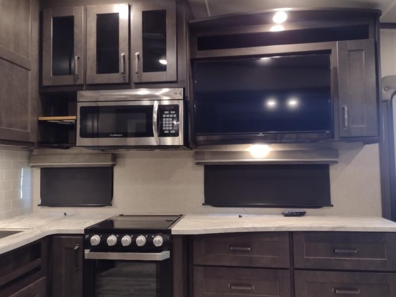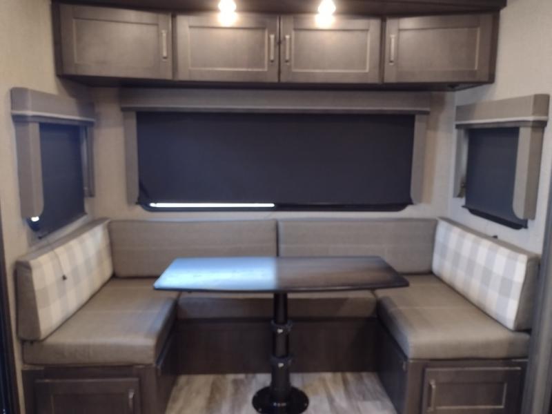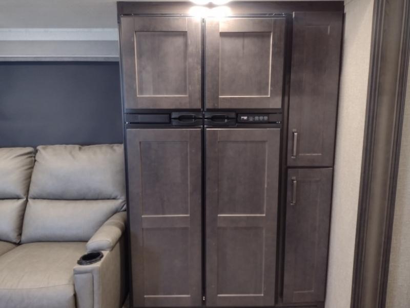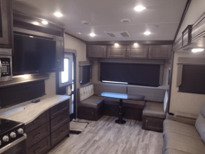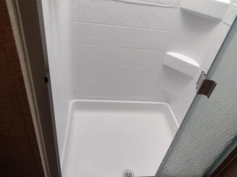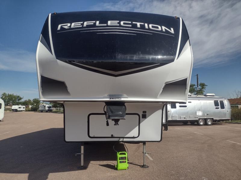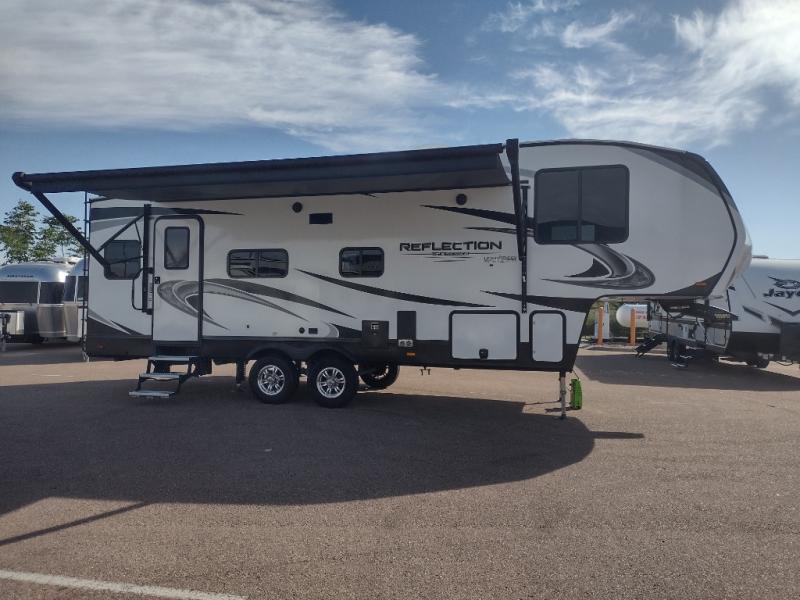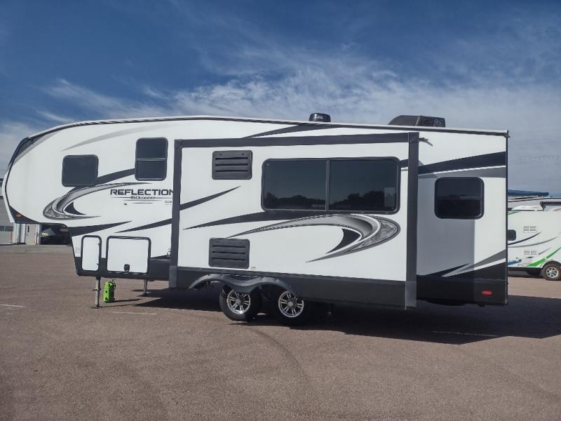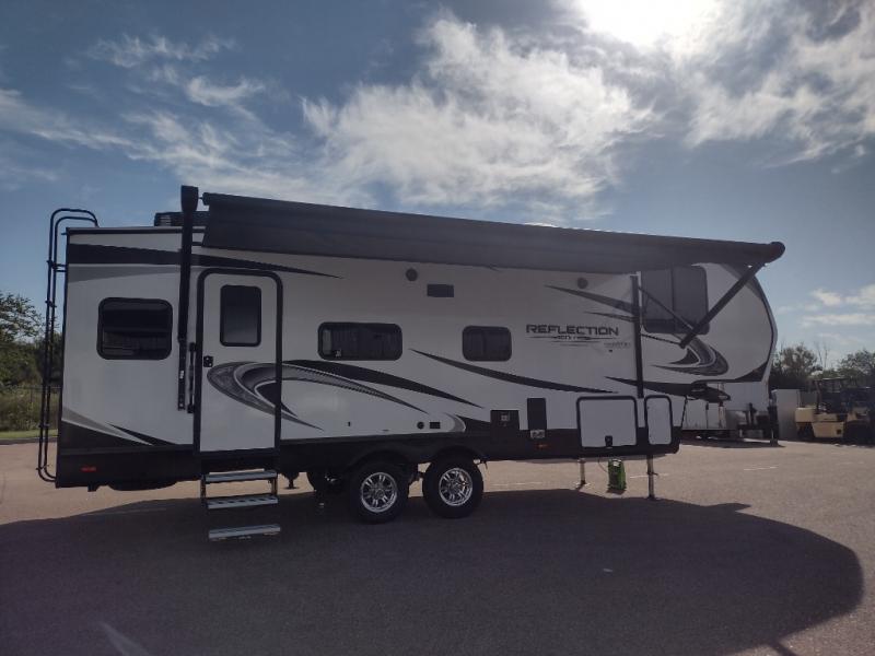 Load up lots of cold food in the 12-cu. ft. refrigerator to enjoy a weekend away from it all in this Reflection 150 Series fifth wheel! The dry food can be placed in the pantry and overhead cabinets, depending on where you want everything. You will enjoy having the appliances near by to make a warm meal in the L-shaped corner kitchen that is next to the entry. Head outside to sit under the 18' electric awning, and you can grab your camp chairs from the exterior unobstructed pass-through storage. You might prefer to dine at the U-shaped dinette with a view and watch TV from the theatre seating that has a massage feature. At night, you can get cleaned up in the 30" x 36" shower with skylight and fall quickly to sleep on your own queen bed.