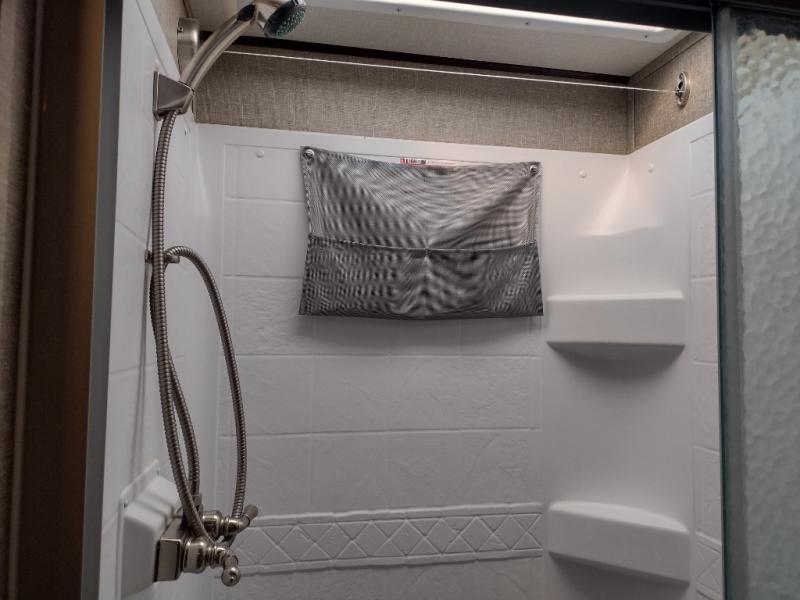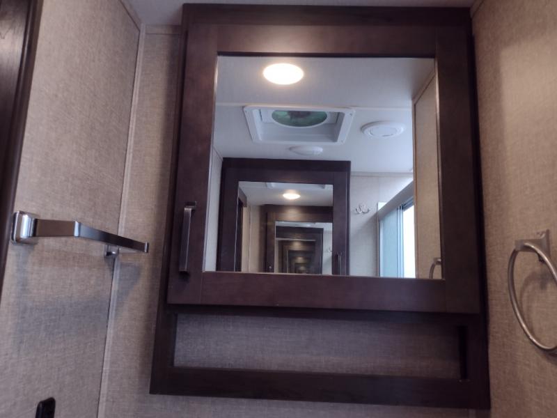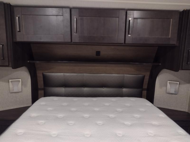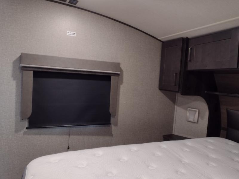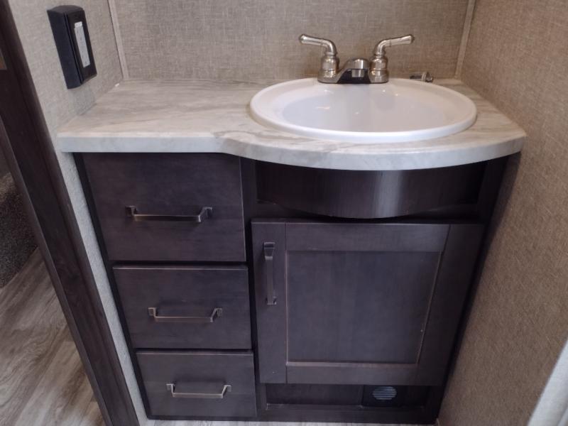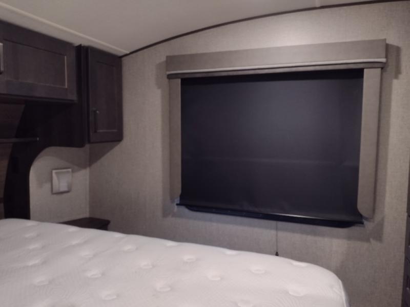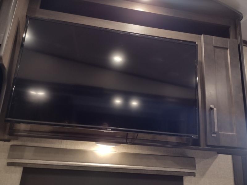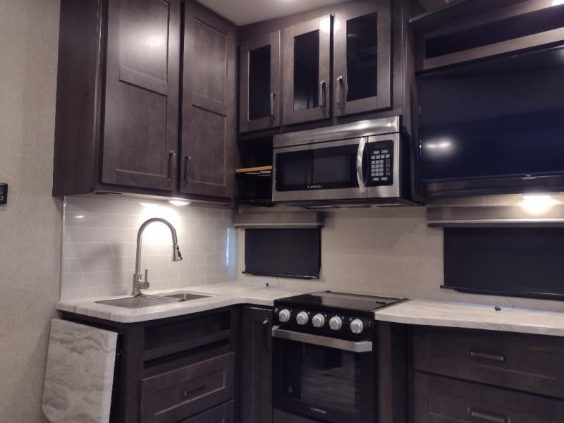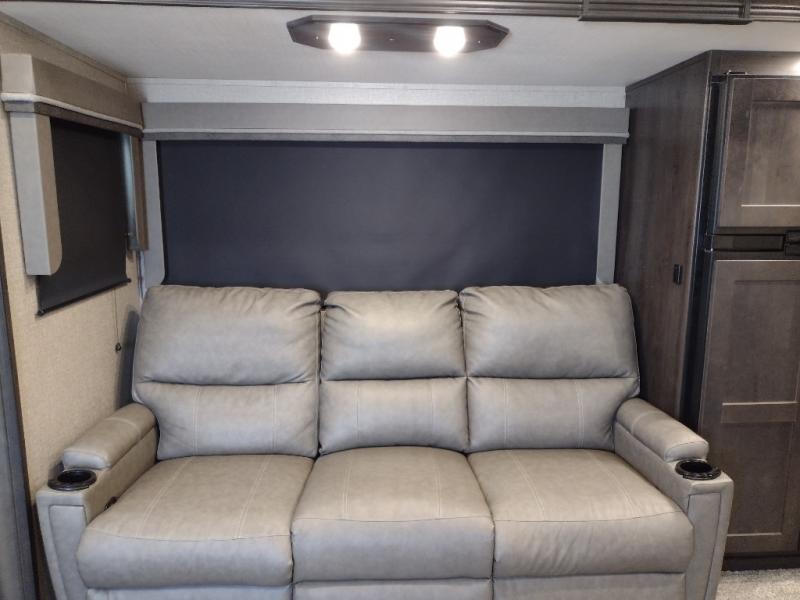 Load up lots of cold food in the 12-cu. ft. refrigerator to enjoy a weekend away from it all in this Reflection 150 Series fifth wheel! The dry food can be placed in the pantry and overhead cabinets, depending on where you want everything. You will enjoy having the appliances near by to make a warm meal in the L-shaped corner kitchen that is next to the entry. Head outside to sit under the 18' electric awning, and you can grab your camp chairs from the exterior unobstructed pass-through storage. You might prefer to dine at the U-shaped dinette with a view and watch TV from the theatre seating that has a massage feature. At night, you can get cleaned up in the 30" x 36" shower with skylight and fall quickly to sleep on your own queen bed.