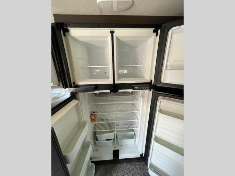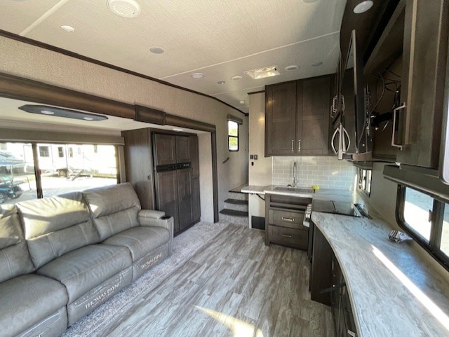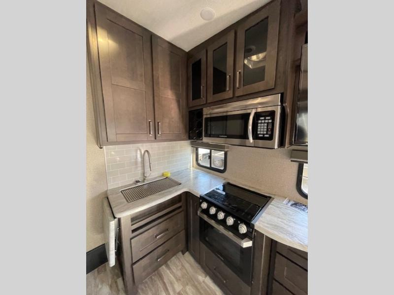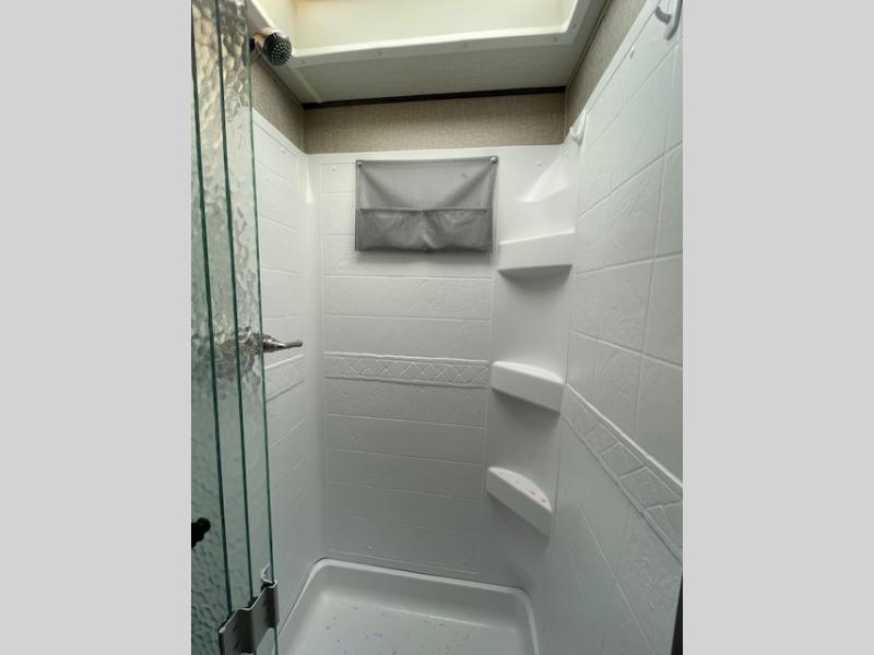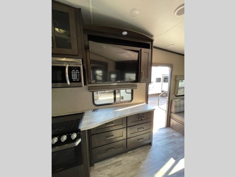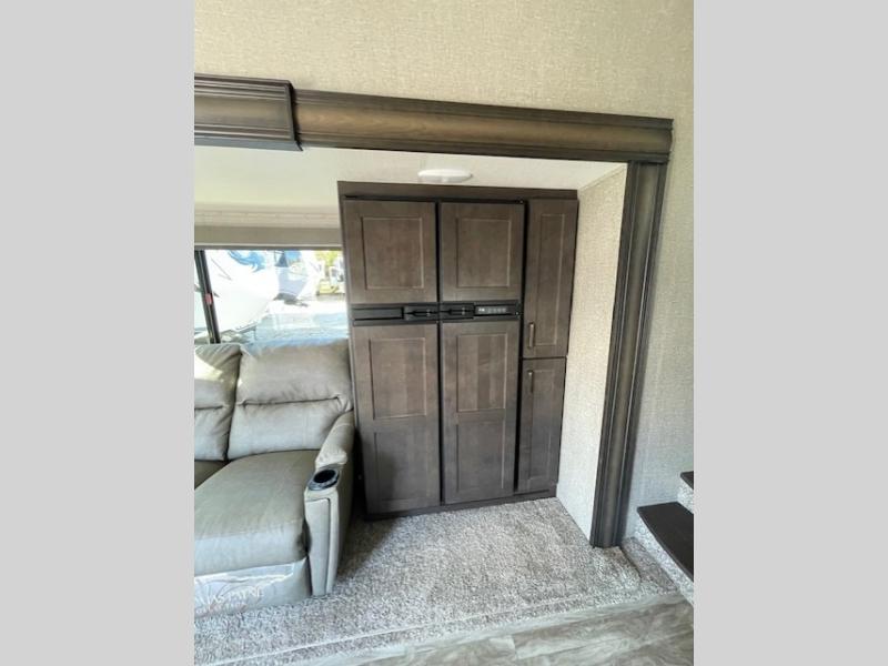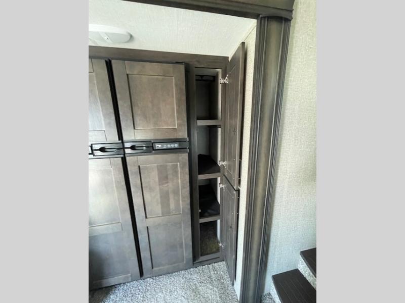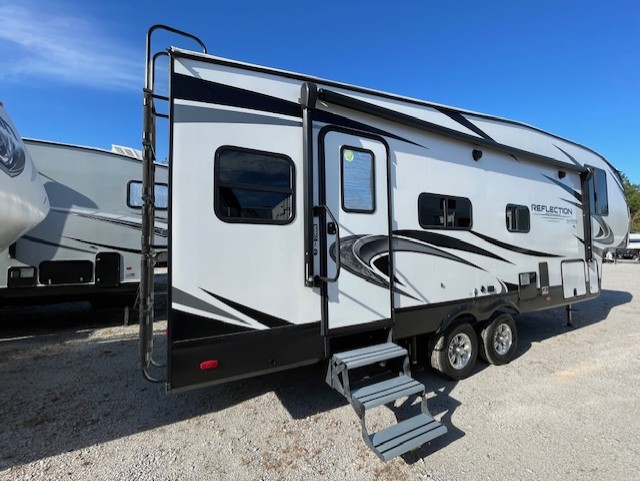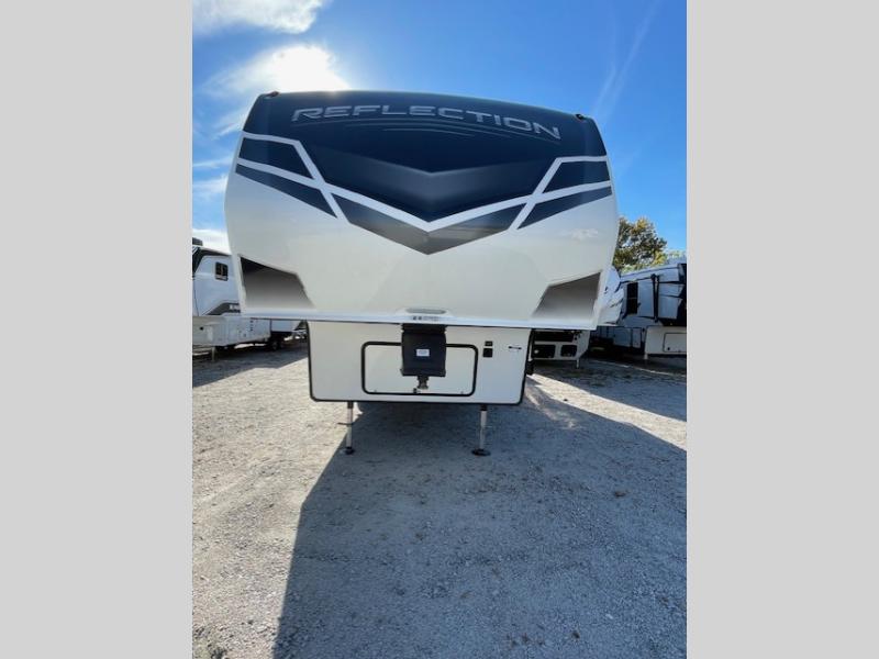 Load up lots of cold food in the 12-cu. ft. refrigerator to enjoy a weekend away from it all in this Reflection 150 Series fifth wheel! The dry food can be placed in the pantry and overhead cabinets, depending on where you want everything. You will enjoy having the appliances near by to make a warm meal in the L-shaped corner kitchen that is next to the entry. Head outside to sit under the 18' electric awning, and you can grab your camp chairs from the exterior unobstructed pass-through storage. You might prefer to dine at the U-shaped dinette with a view and watch TV from the theatre seating that has a massage feature. At night, you can get cleaned up in the 30" x 36" shower with skylight and fall quickly to sleep on your own queen bed.