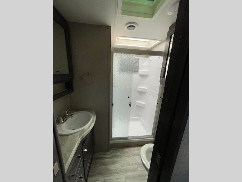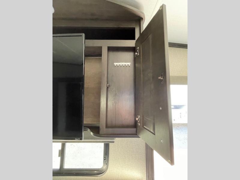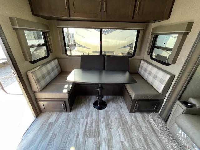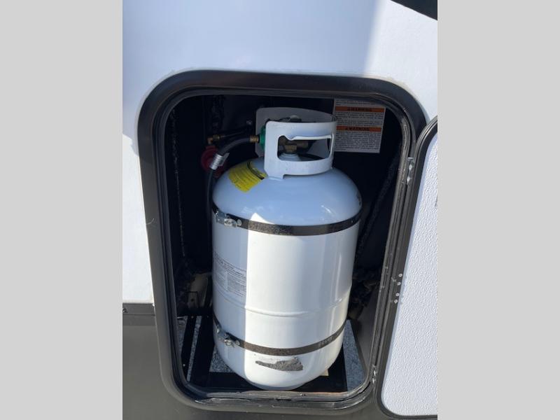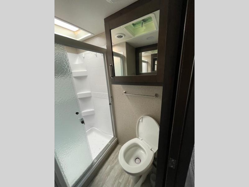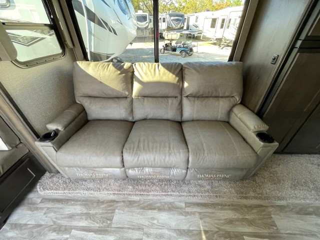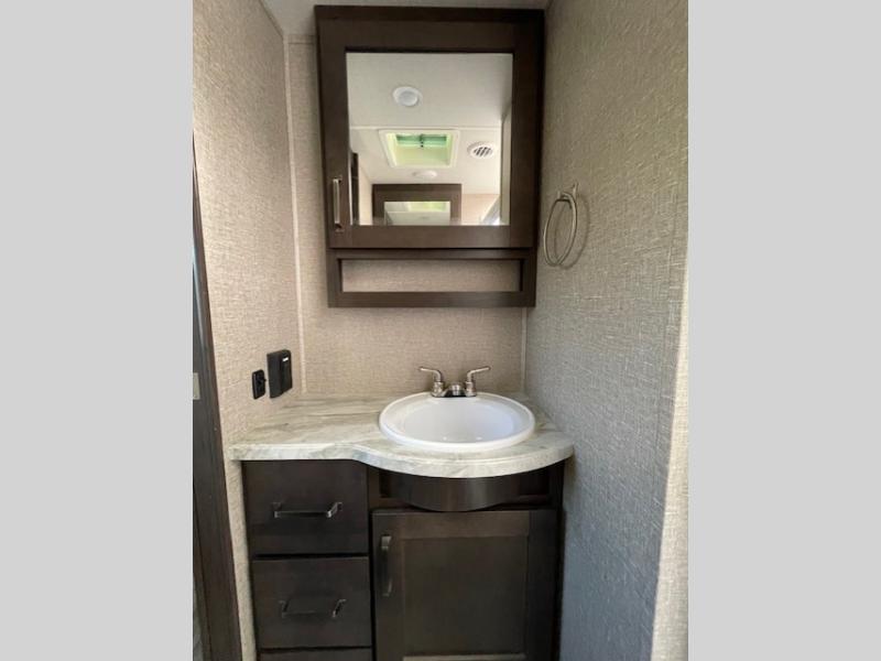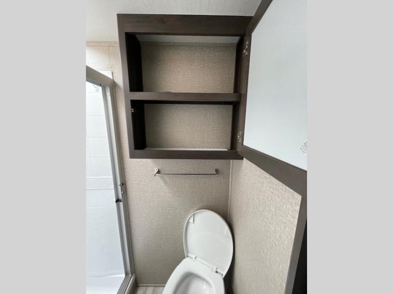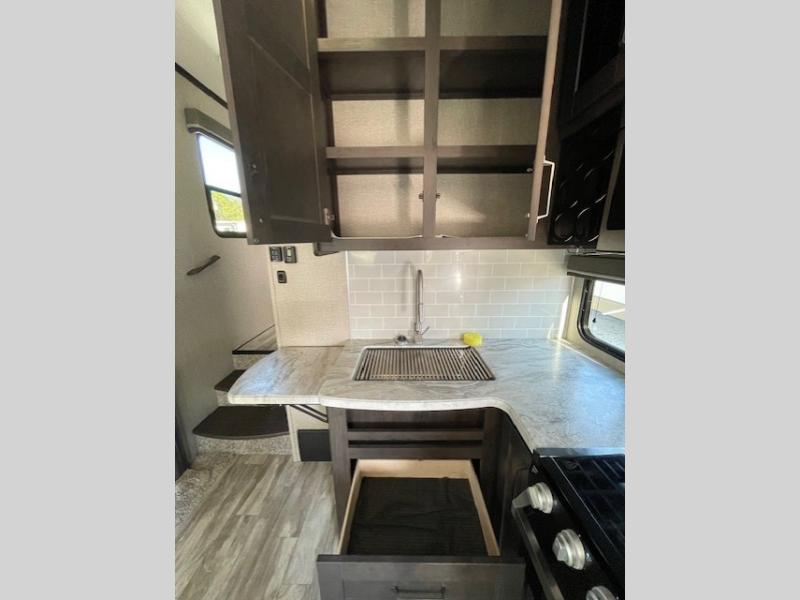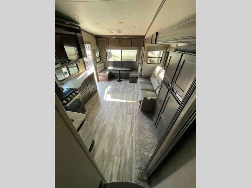 Load up lots of cold food in the 12-cu. ft. refrigerator to enjoy a weekend away from it all in this Reflection 150 Series fifth wheel! The dry food can be placed in the pantry and overhead cabinets, depending on where you want everything. You will enjoy having the appliances near by to make a warm meal in the L-shaped corner kitchen that is next to the entry. Head outside to sit under the 18' electric awning, and you can grab your camp chairs from the exterior unobstructed pass-through storage. You might prefer to dine at the U-shaped dinette with a view and watch TV from the theatre seating that has a massage feature. At night, you can get cleaned up in the 30" x 36" shower with skylight and fall quickly to sleep on your own queen bed.