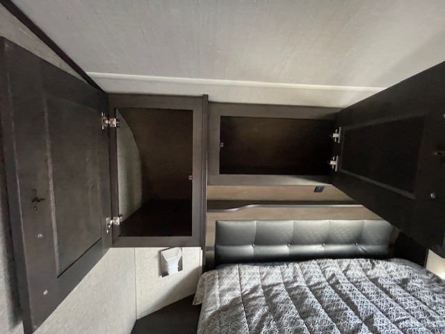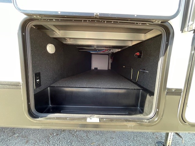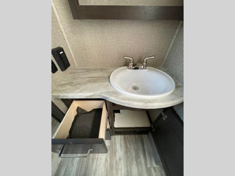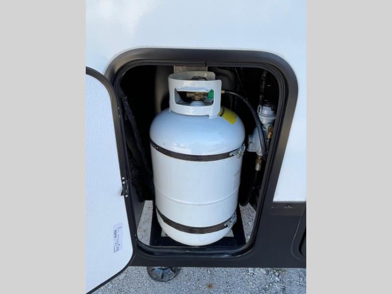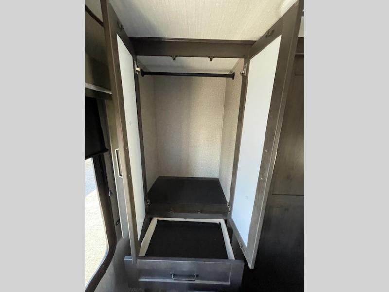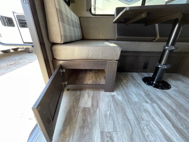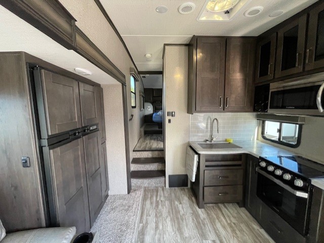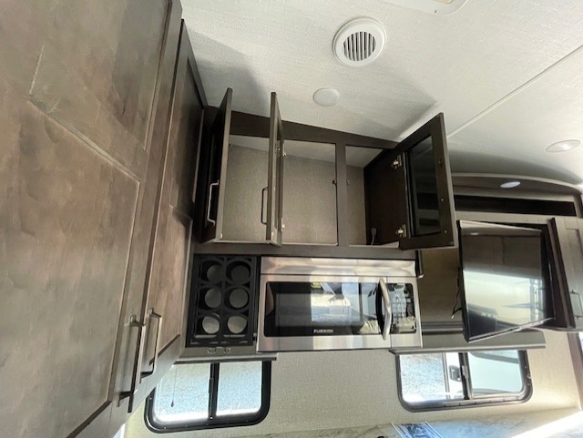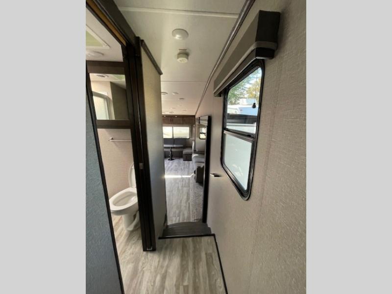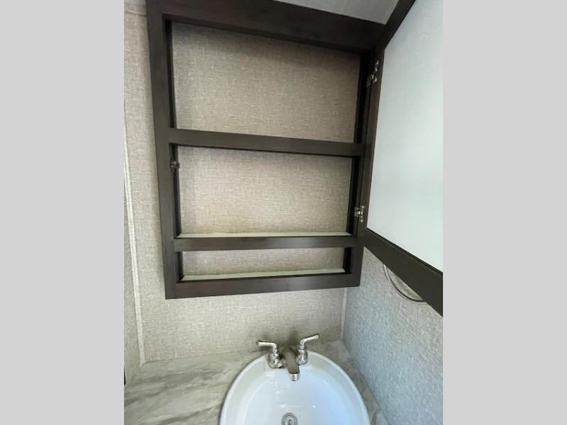 Load up lots of cold food in the 12-cu. ft. refrigerator to enjoy a weekend away from it all in this Reflection 150 Series fifth wheel! The dry food can be placed in the pantry and overhead cabinets, depending on where you want everything. You will enjoy having the appliances near by to make a warm meal in the L-shaped corner kitchen that is next to the entry. Head outside to sit under the 18' electric awning, and you can grab your camp chairs from the exterior unobstructed pass-through storage. You might prefer to dine at the U-shaped dinette with a view and watch TV from the theatre seating that has a massage feature. At night, you can get cleaned up in the 30" x 36" shower with skylight and fall quickly to sleep on your own queen bed.