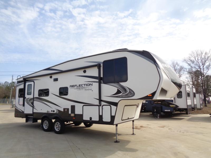 Each Reflection 150 Series fifth wheel by Grand Design allows you to use your half-ton and short-bed truck to tow thanks to the 90-degree turn radius pin box. The Universal All-In-One docking station, the LP Quick Connect, and the "One-Touch" automatic leveling system will make setting up and packing up easy for those weekenders or full-timers that like to move around to see the countryside. Inside, you will love the Gunstock fixtures and hardware, the louvered tread steps to the bedroom, the large panoramic windows, plus the many features in the mandatory packages. It's time to reflect on your wise choice, so choose a Reflection 150 Series today!