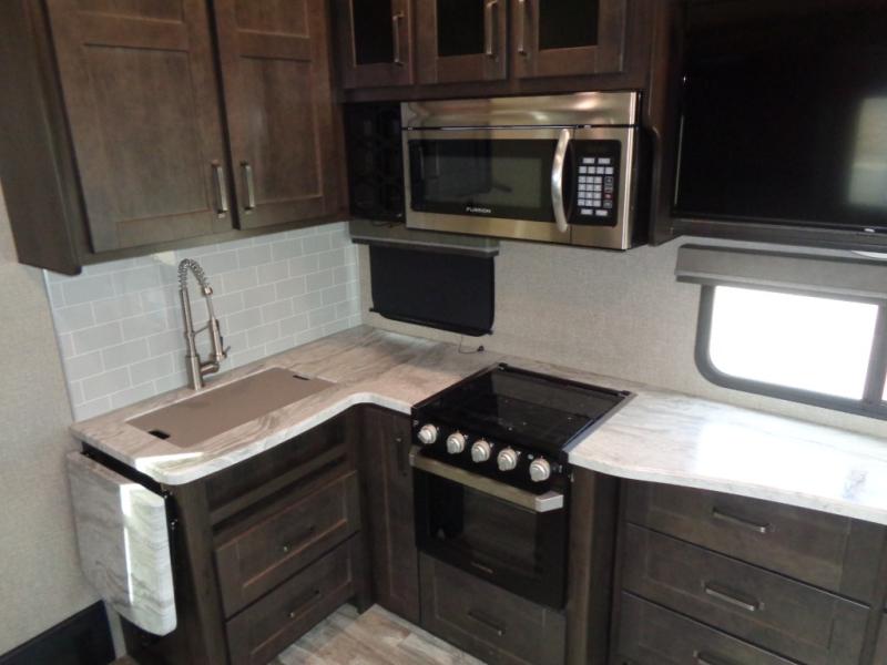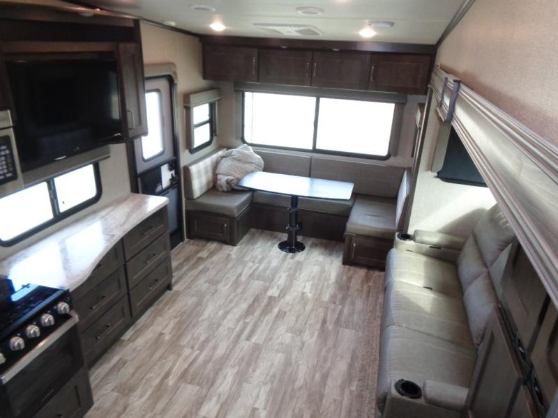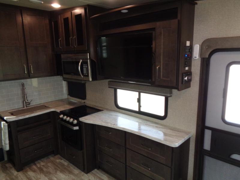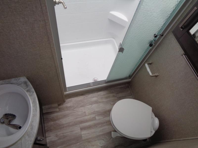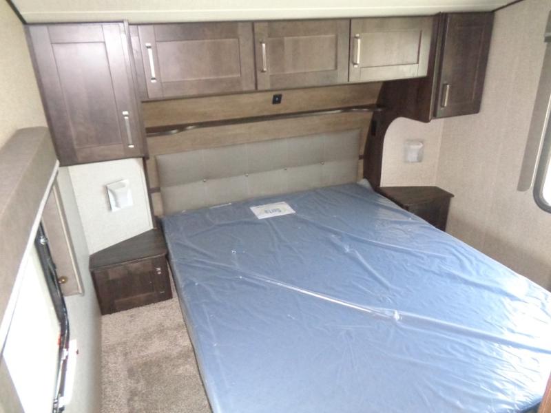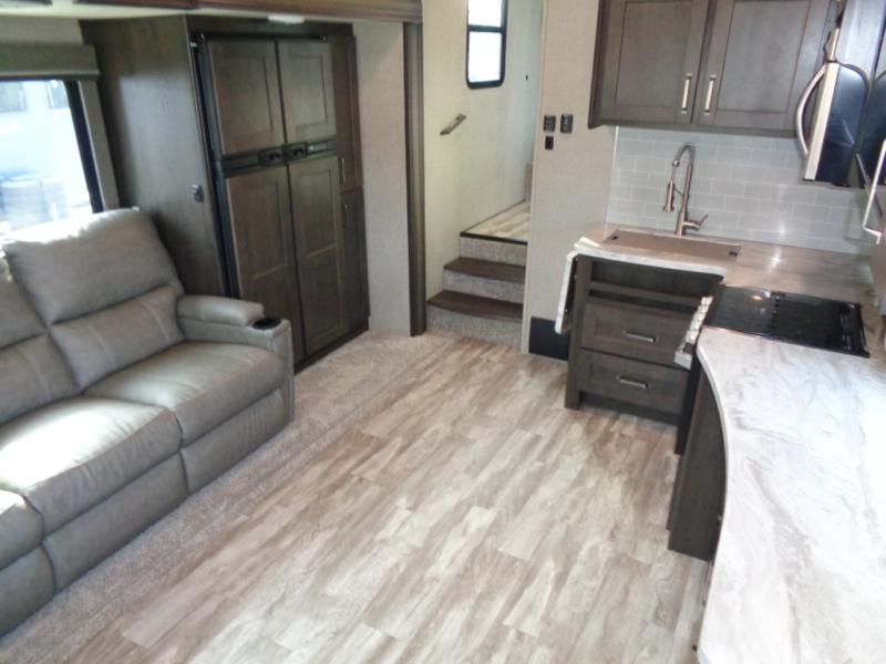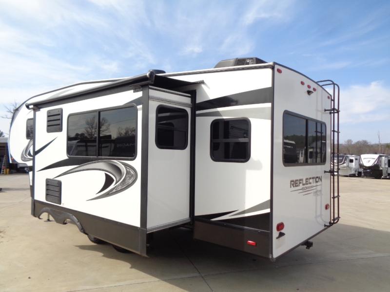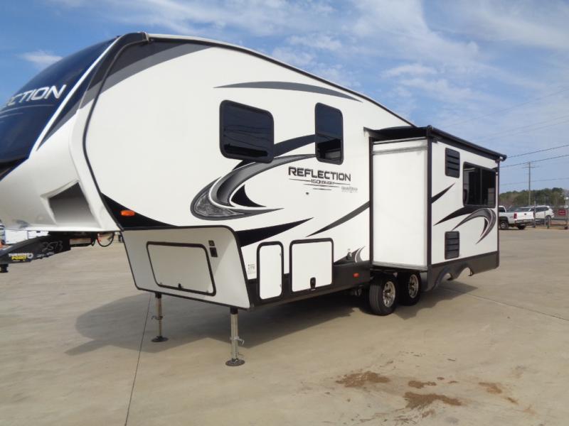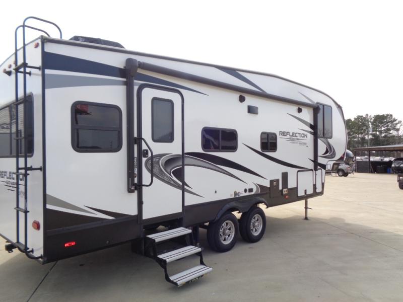 Load up lots of cold food in the 12-cu. ft. refrigerator to enjoy a weekend away from it all in this Reflection 150 Series fifth wheel! The dry food can be placed in the pantry and overhead cabinets, depending on where you want everything. You will enjoy having the appliances near by to make a warm meal in the L-shaped corner kitchen that is next to the entry. Head outside to sit under the 18' electric awning, and you can grab your camp chairs from the exterior unobstructed pass-through storage. You might prefer to dine at the U-shaped dinette with a view and watch TV from the theatre seating that has a massage feature. At night, you can get cleaned up in the 30" x 36" shower with skylight and fall quickly to sleep on your own queen bed.