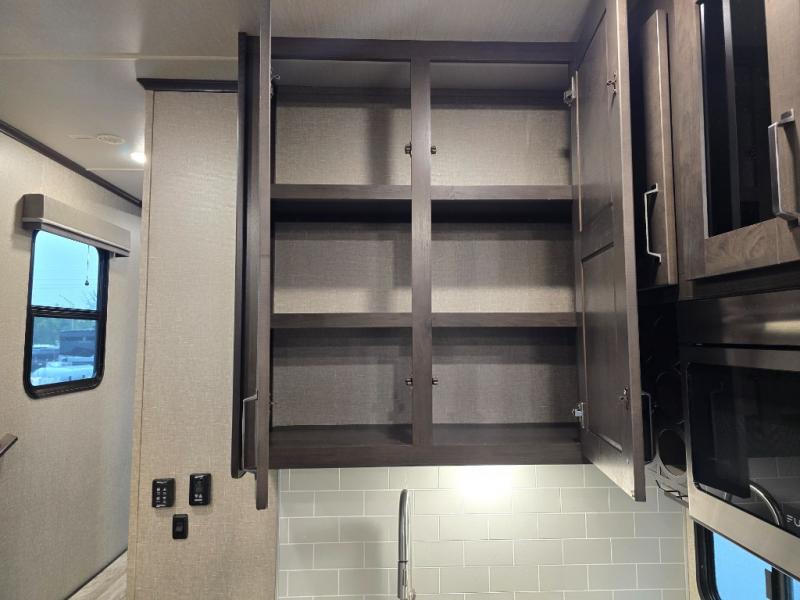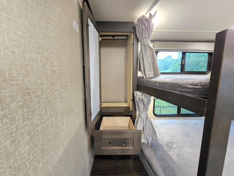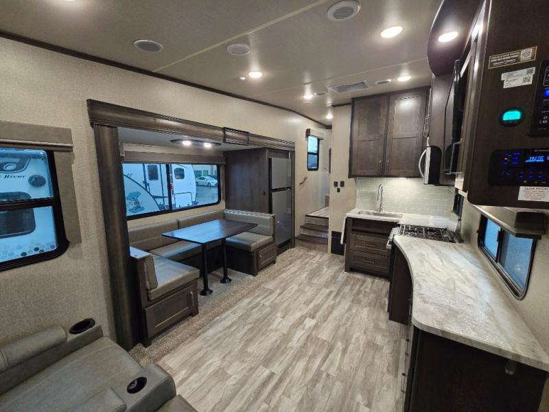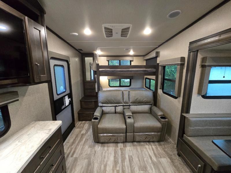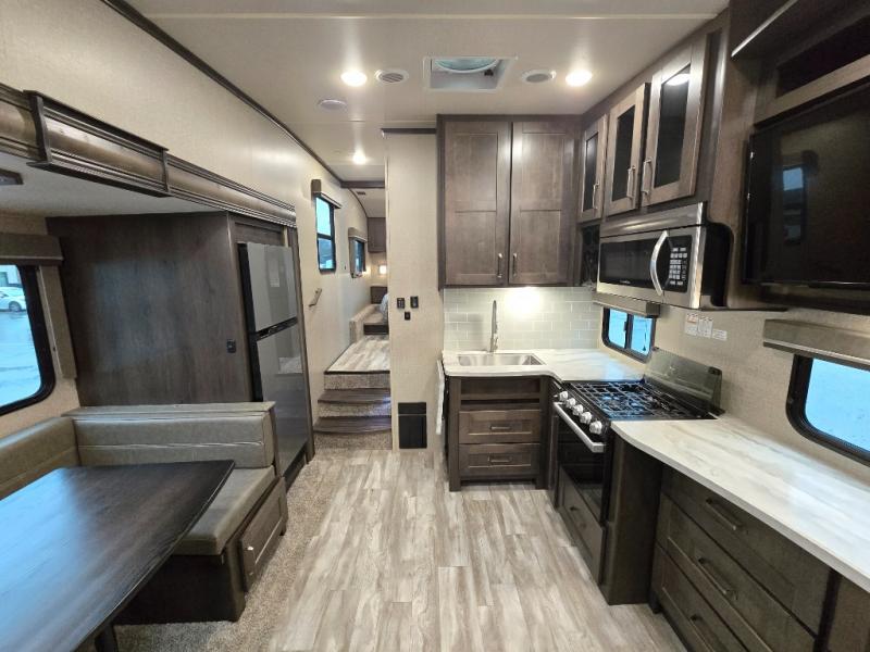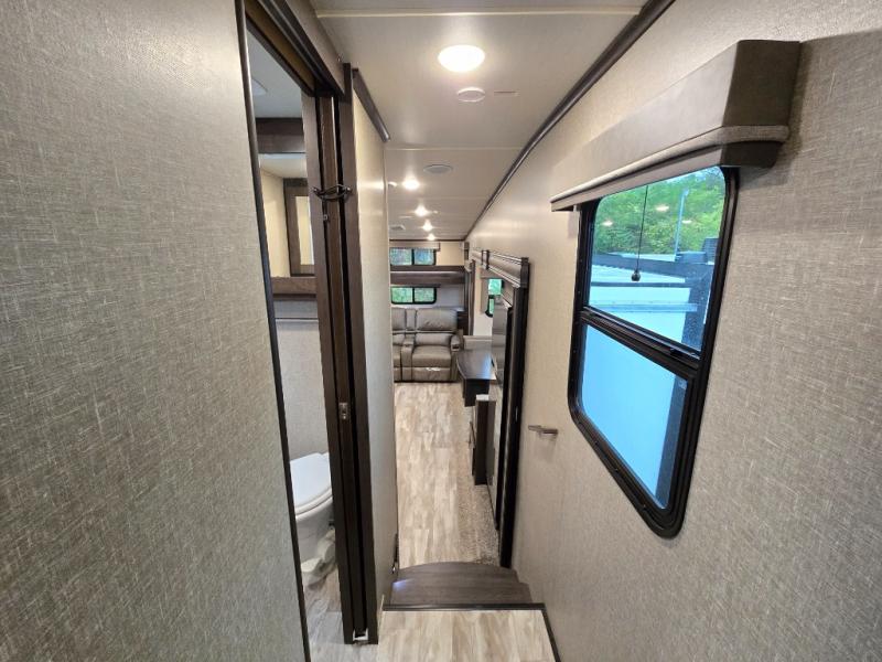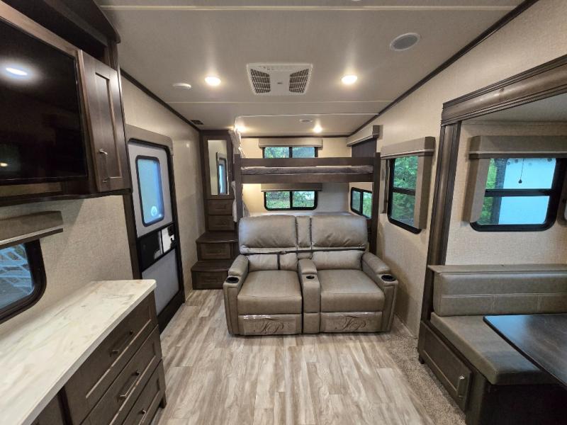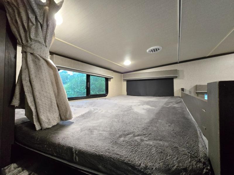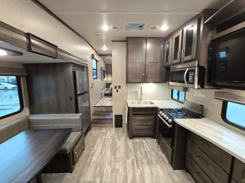 You will find plenty of storage for your clothing and such inside this Reflection 150 Series fifth wheel. Plus, the exterior also offers storage space with the rear storage and unobstructed pass-through compartment, so you can bring the outdoor games, camping chairs, charcoal, and fishing poles. The kids will love having their own bunk, a wardrobe, and step storage while you have your own space in the front master bedroom. The bedroom contains a walk-around queen bed and a space-saving sliding door. The main living area is spacious with the slide out, and you can relax on the theater seating. The U-shaped dinette also offers plenty of space for playing games as well.