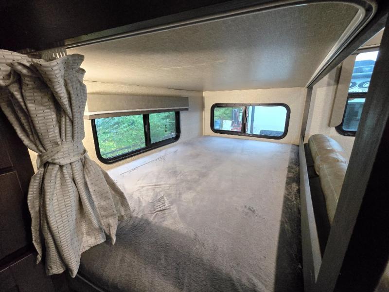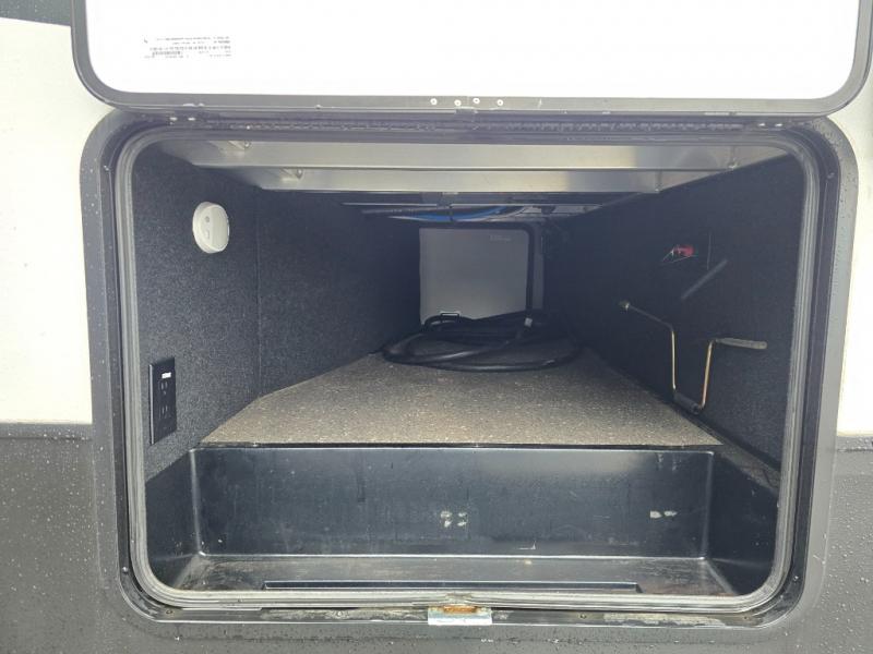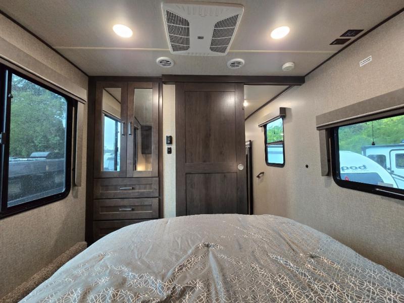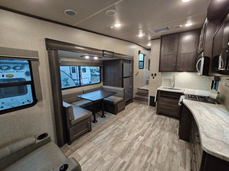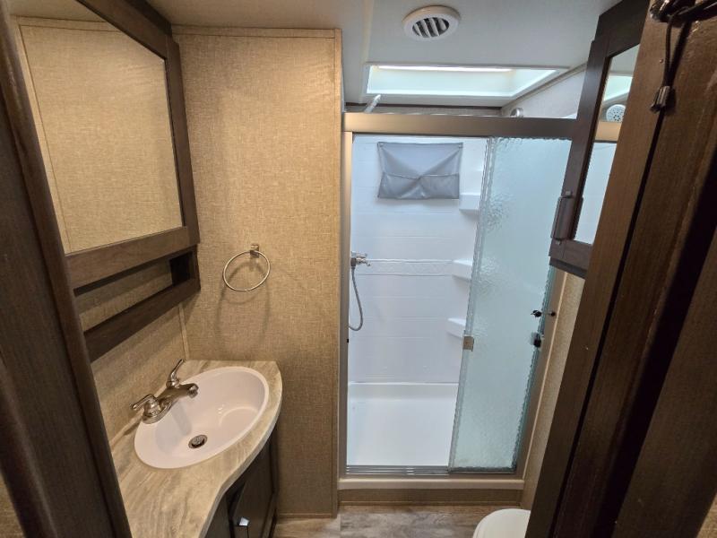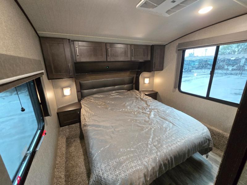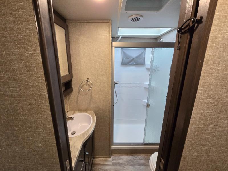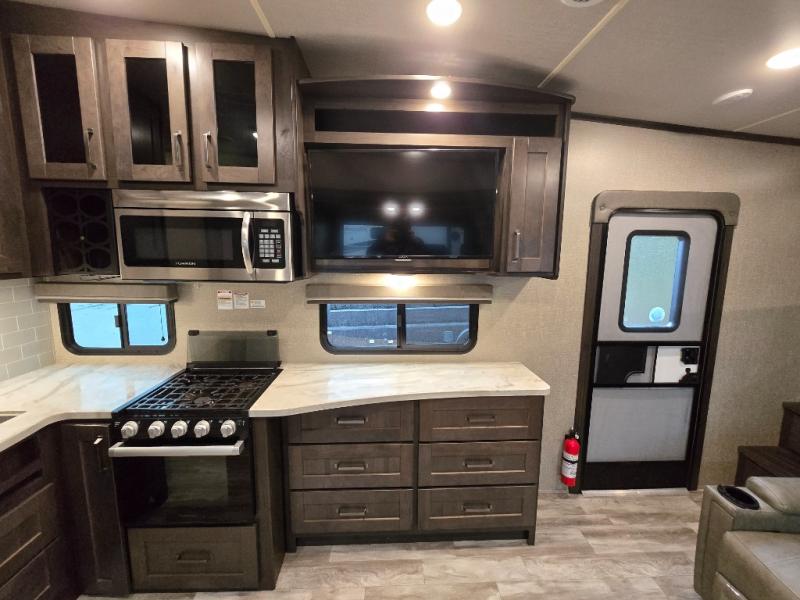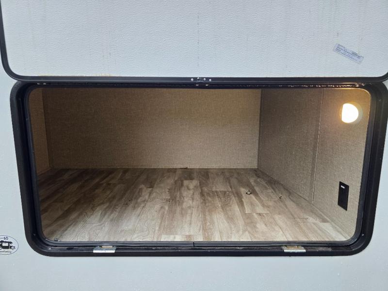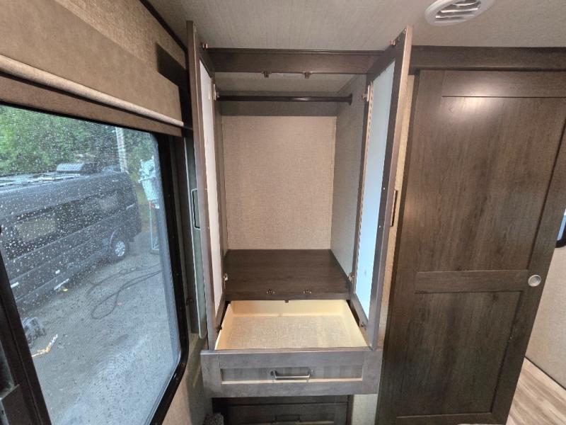 You will find plenty of storage for your clothing and such inside this Reflection 150 Series fifth wheel. Plus, the exterior also offers storage space with the rear storage and unobstructed pass-through compartment, so you can bring the outdoor games, camping chairs, charcoal, and fishing poles. The kids will love having their own bunk, a wardrobe, and step storage while you have your own space in the front master bedroom. The bedroom contains a walk-around queen bed and a space-saving sliding door. The main living area is spacious with the slide out, and you can relax on the theater seating. The U-shaped dinette also offers plenty of space for playing games as well.