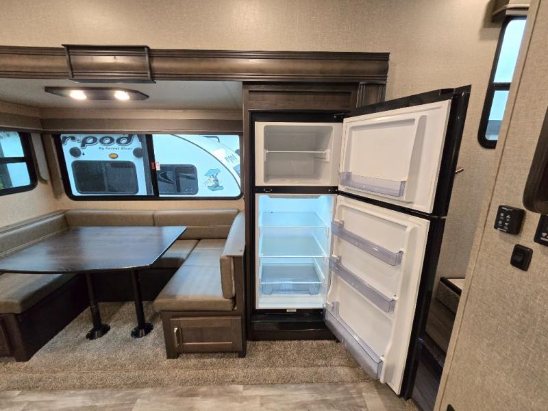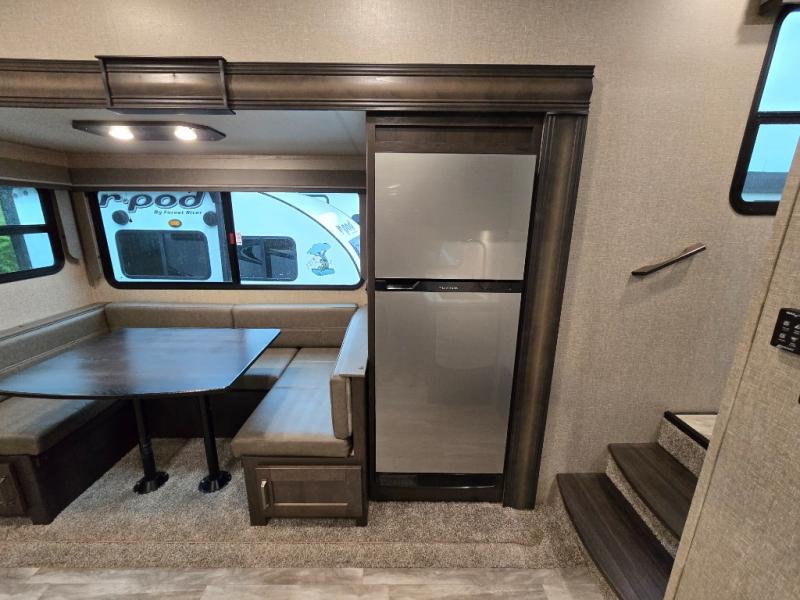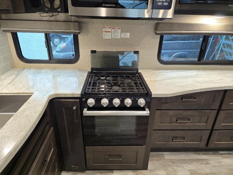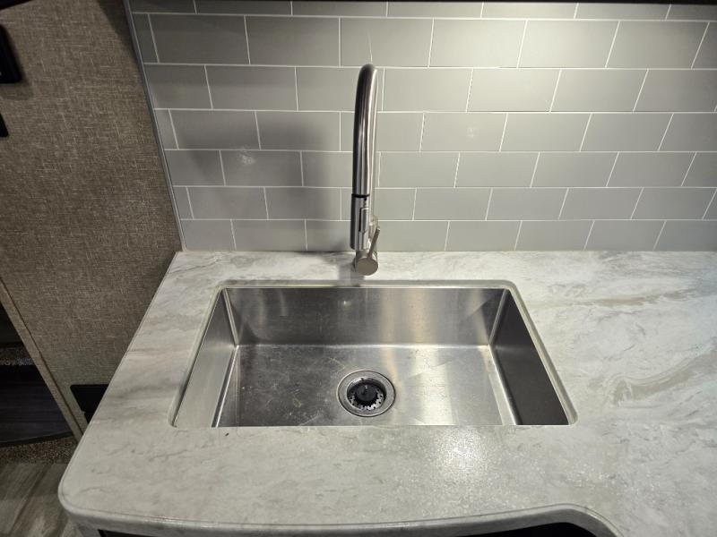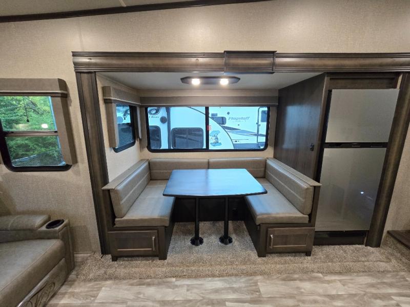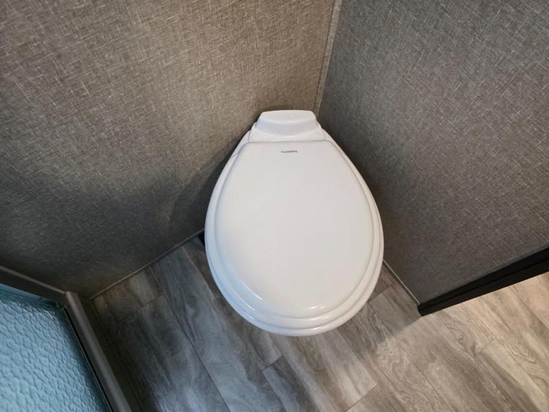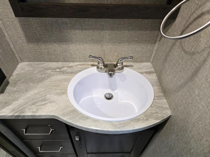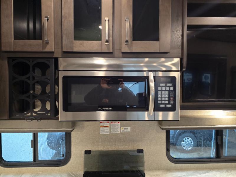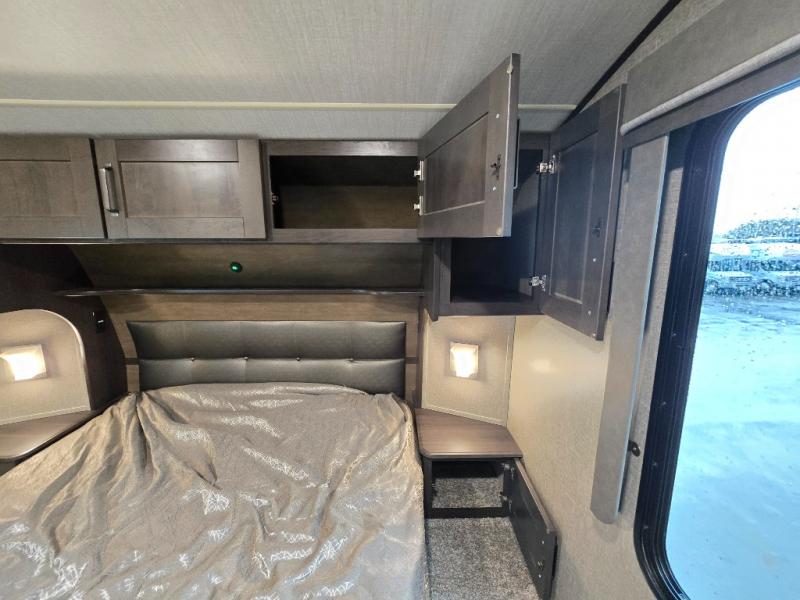 You will find plenty of storage for your clothing and such inside this Reflection 150 Series fifth wheel. Plus, the exterior also offers storage space with the rear storage and unobstructed pass-through compartment, so you can bring the outdoor games, camping chairs, charcoal, and fishing poles. The kids will love having their own bunk, a wardrobe, and step storage while you have your own space in the front master bedroom. The bedroom contains a walk-around queen bed and a space-saving sliding door. The main living area is spacious with the slide out, and you can relax on the theater seating. The U-shaped dinette also offers plenty of space for playing games as well.