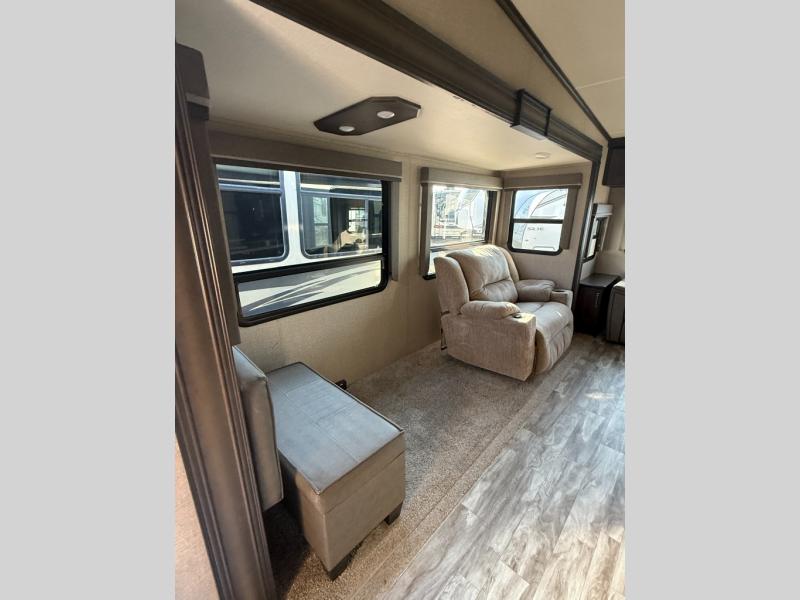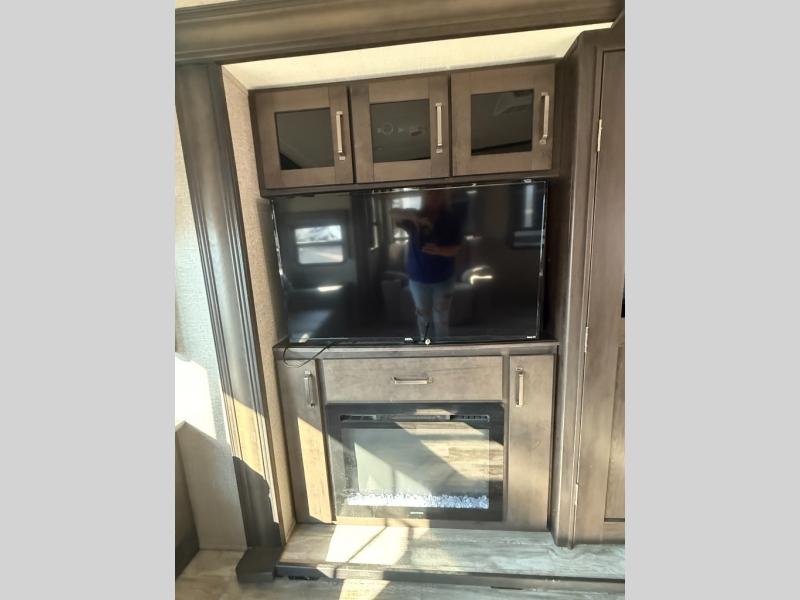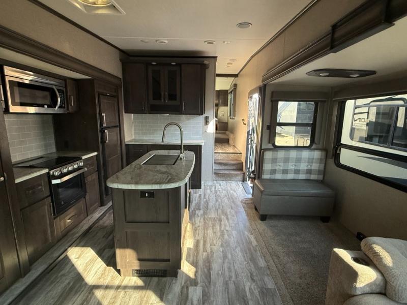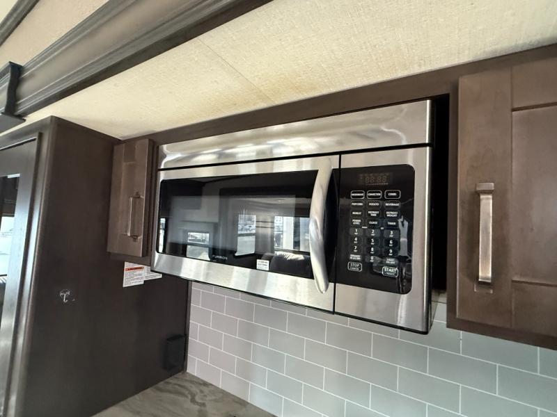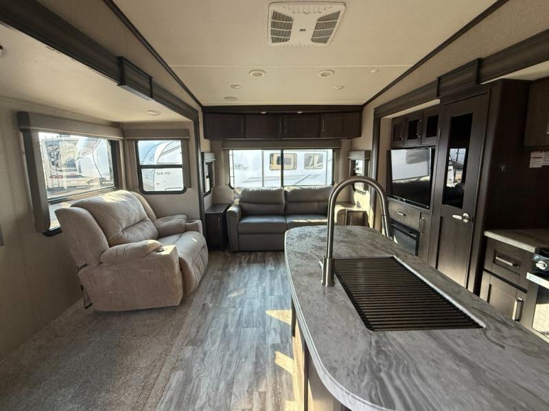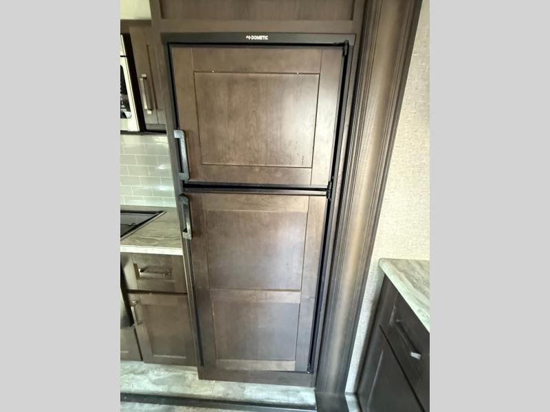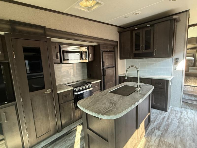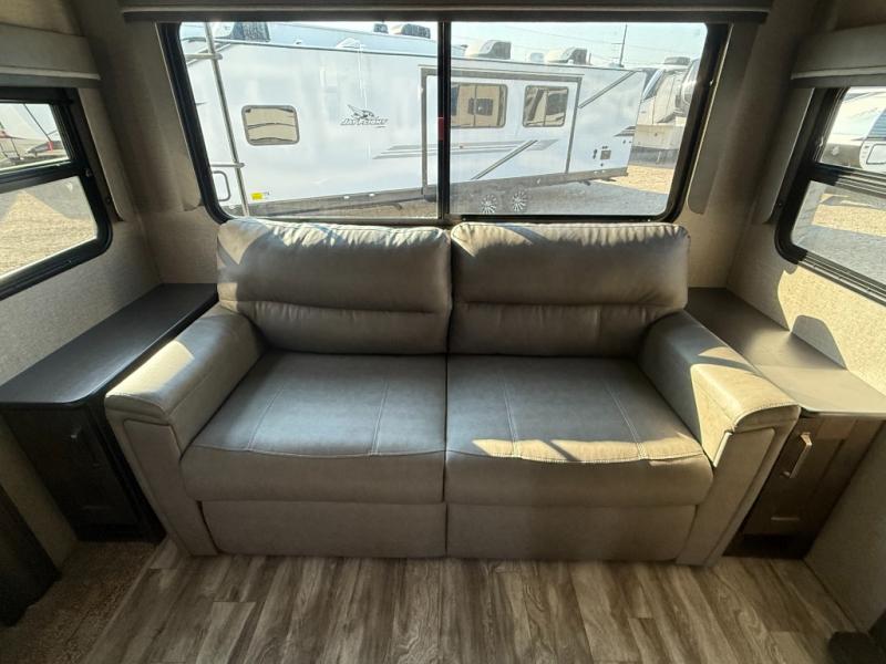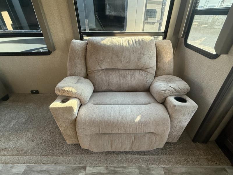 The tri-fold sofa on this Reflection 150 Series fifth wheel not only offers seating space, but it also offers extra sleeping space for the kids, grandkids, or friends. The main living area is quite spacious with two opposing slides, and this gives you more space around the kitchen island to prepare and serve meals. You will also find the hutch to be useful for storing your dishes, and the fireplace is nearby creating a great space to unwind in at night using the massage features on the theatre seats. You will find storage throughout the interior and along the exterior in the unobstructed pass-through compartment.