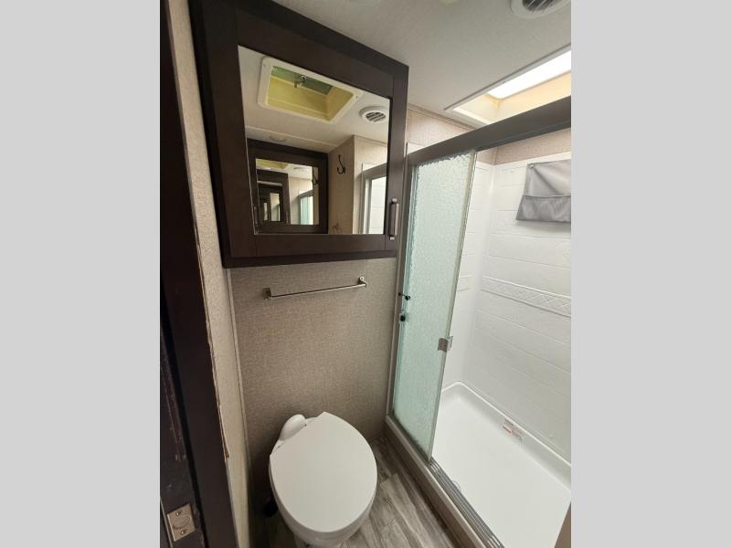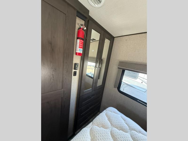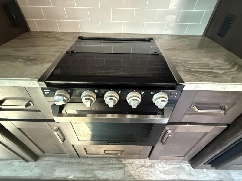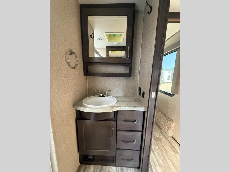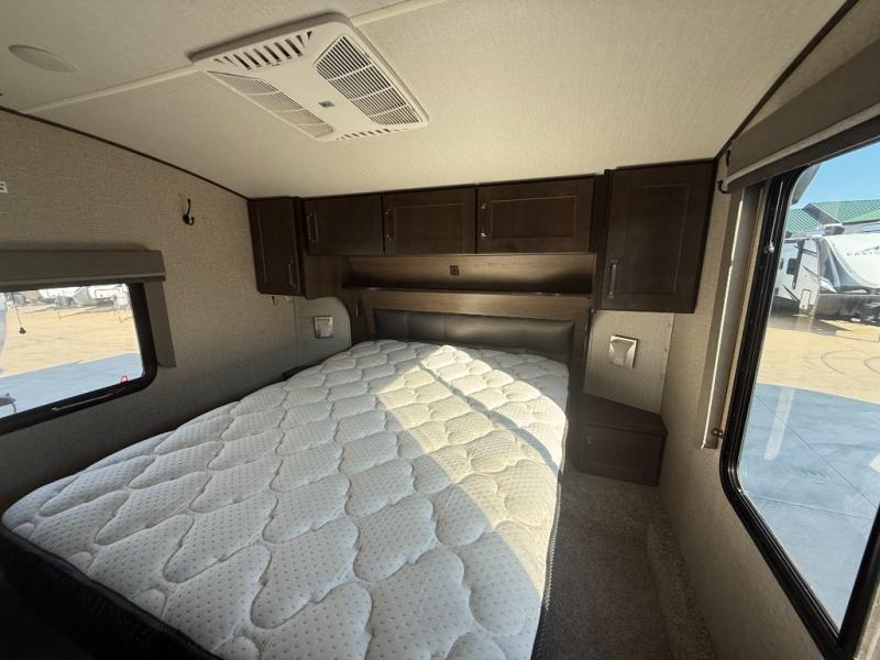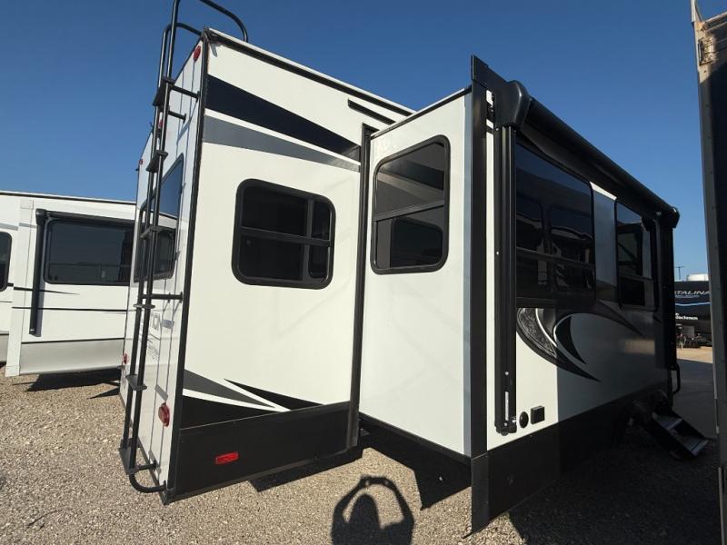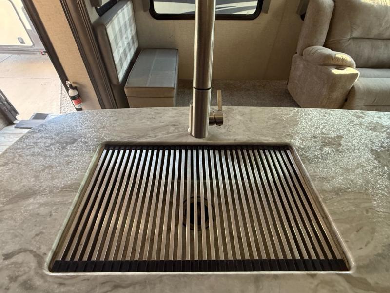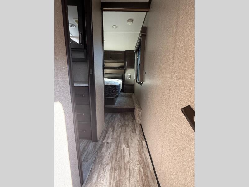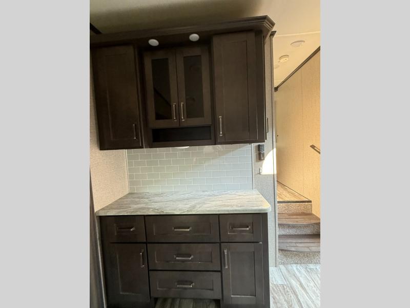 The tri-fold sofa on this Reflection 150 Series fifth wheel not only offers seating space, but it also offers extra sleeping space for the kids, grandkids, or friends. The main living area is quite spacious with two opposing slides, and this gives you more space around the kitchen island to prepare and serve meals. You will also find the hutch to be useful for storing your dishes, and the fireplace is nearby creating a great space to unwind in at night using the massage features on the theatre seats. You will find storage throughout the interior and along the exterior in the unobstructed pass-through compartment.