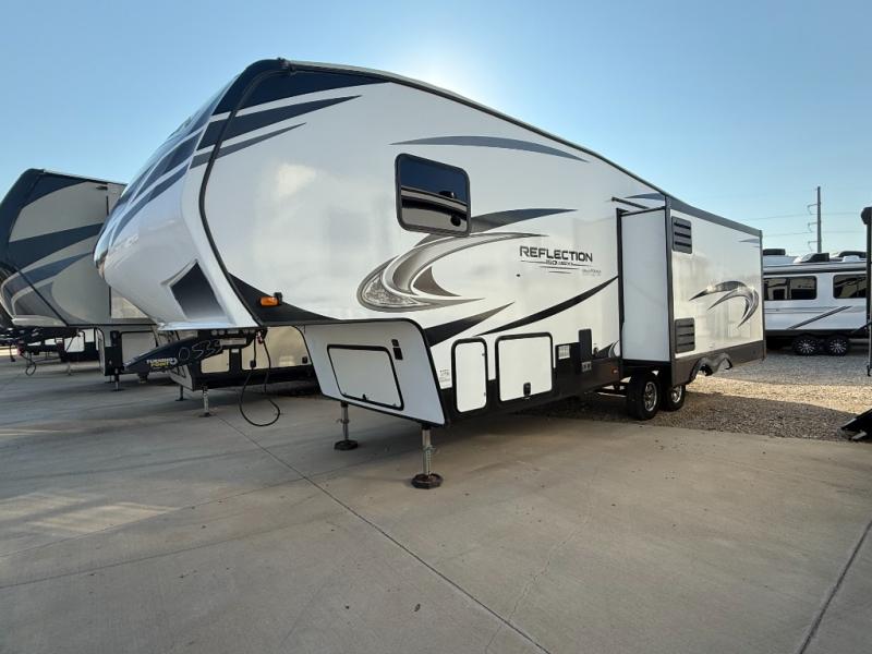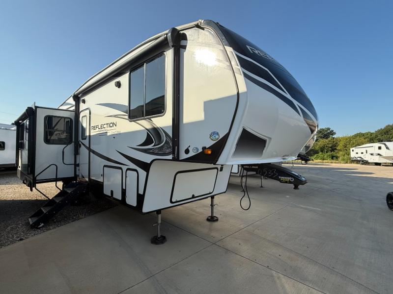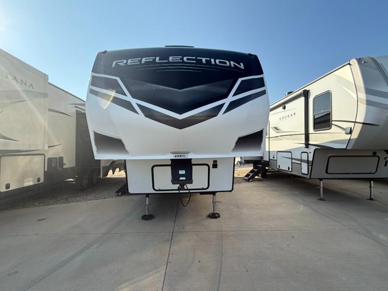 Each Reflection 150 Series fifth wheel by Grand Design allows you to use your half-ton and short-bed truck to tow thanks to the 90-degree turn radius pin box. The Universal All-In-One docking station, the LP Quick Connect, and the "One-Touch" automatic leveling system will make setting up and packing up easy for those weekenders or full-timers that like to move around to see the countryside. Inside, you will love the Gunstock fixtures and hardware, the louvered tread steps to the bedroom, the large panoramic windows, plus the many features in the mandatory packages. It's time to reflect on your wise choice, so choose a Reflection 150 Series today!