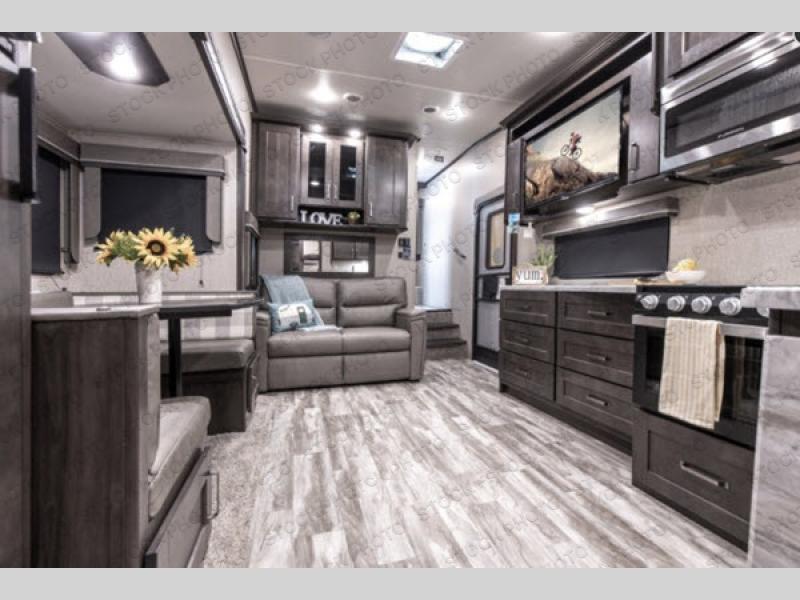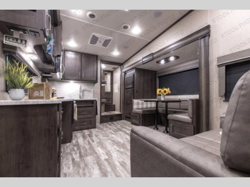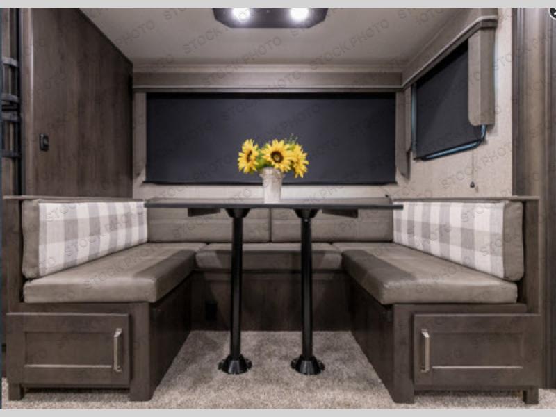Spacious Living Area – Gather around the U-shaped dinette for meals and games, or relax on the tri-fold sofa and watch the 40" LED TV. (Optional theater seating available!)