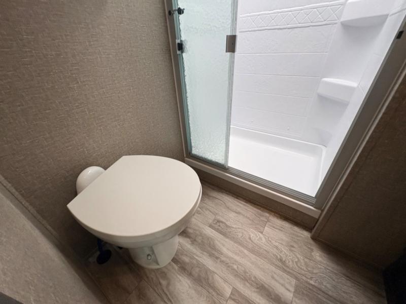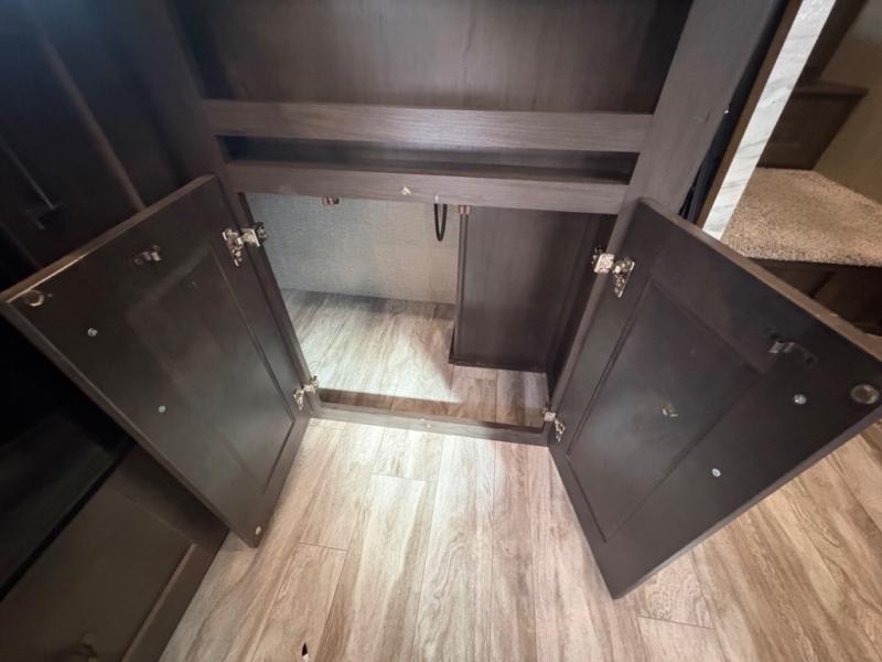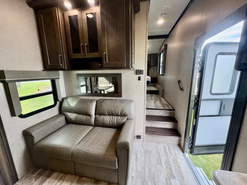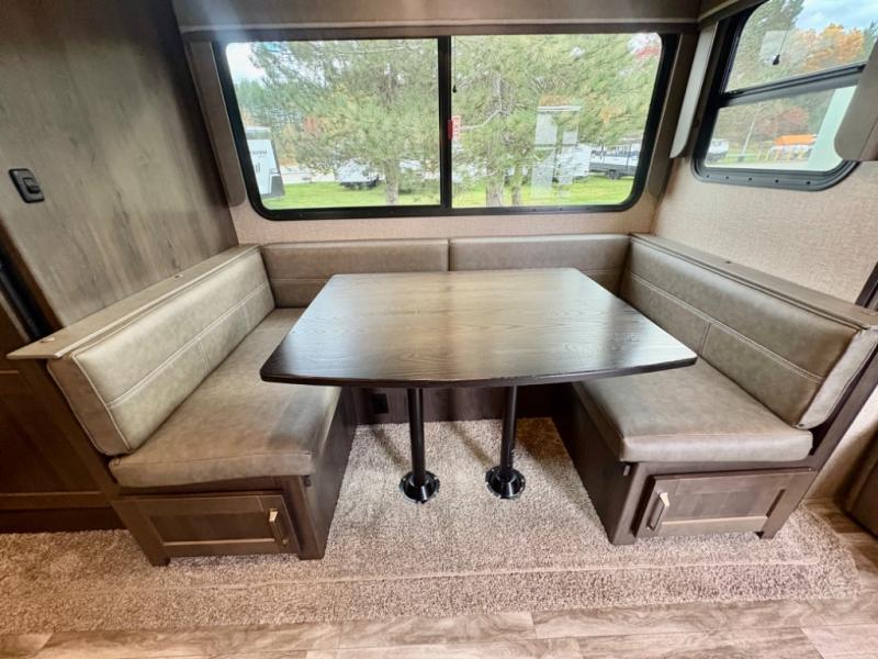 If you're looking for an efficient bunkhouse, then you need this Reflection 150 Series fifth wheel! The exterior rear storage compartment lets you bring all of your favorite camping gear, and the thoughtful storage near the bunks not only has a wardrobe closet but also a clever step storage area. You will enjoy eating your meals and playing card games at the U-shaped dinette, or you can switch it out for the optional 78" theater seating instead. Grab your favorite beverage from the 8-cu. ft. refrigerator and relax on the tri-fold sofa while you watch your favorite movie on the 40" LED TV. The full bathroom has a shower with a skylight for natural lighting as you get ready each morning, and is also has a linen closet to keep your towels close by.