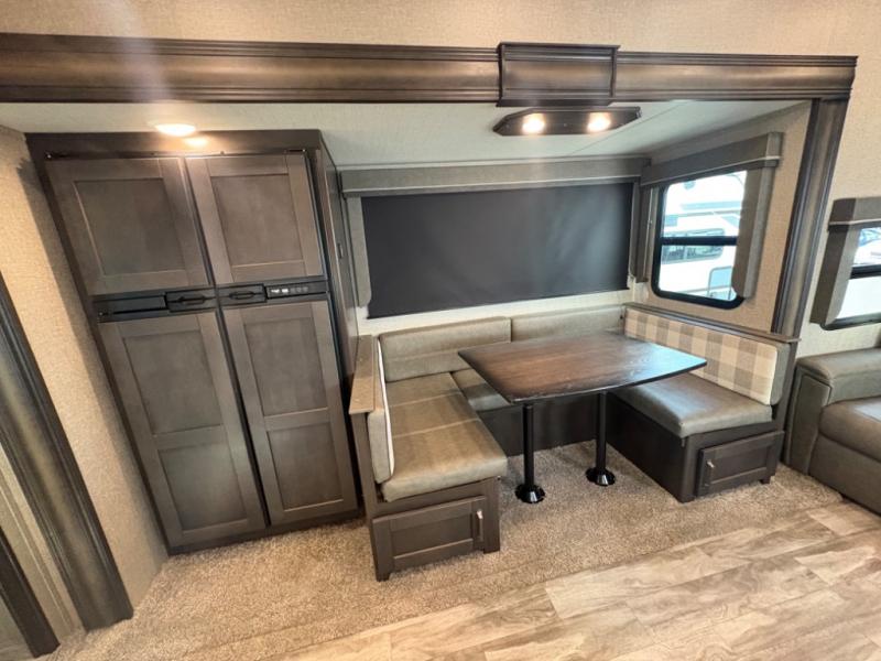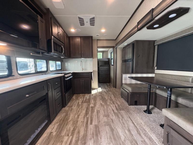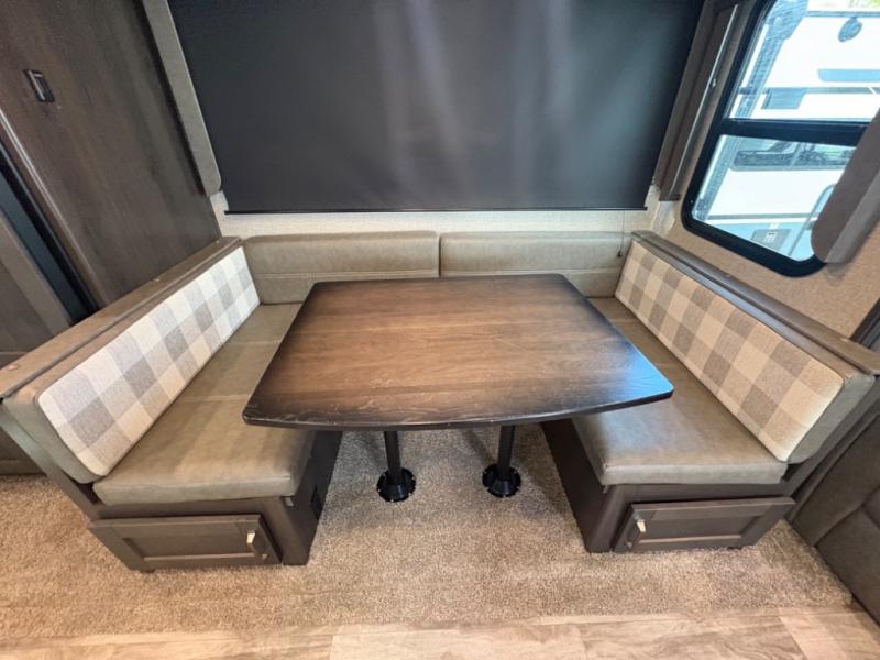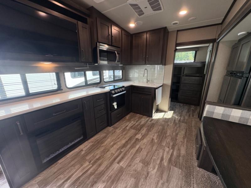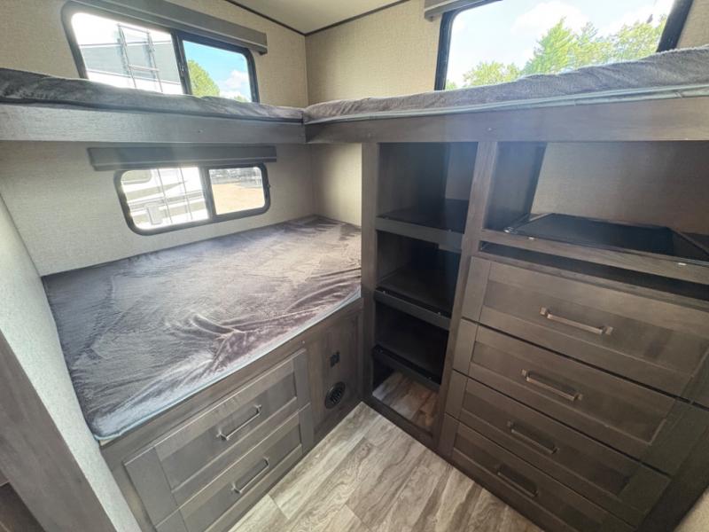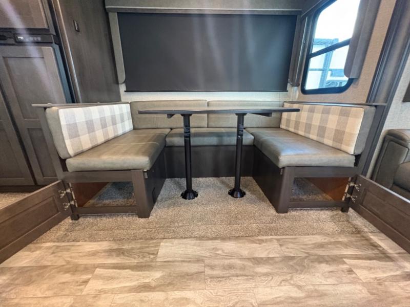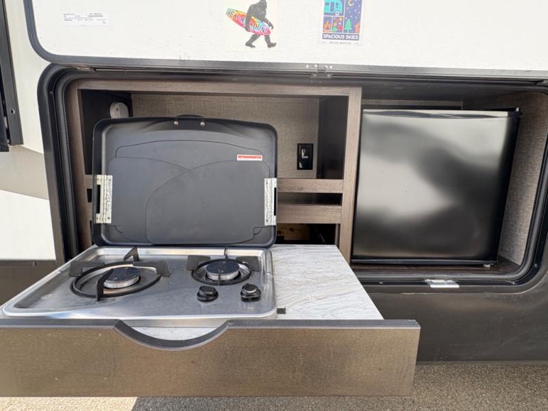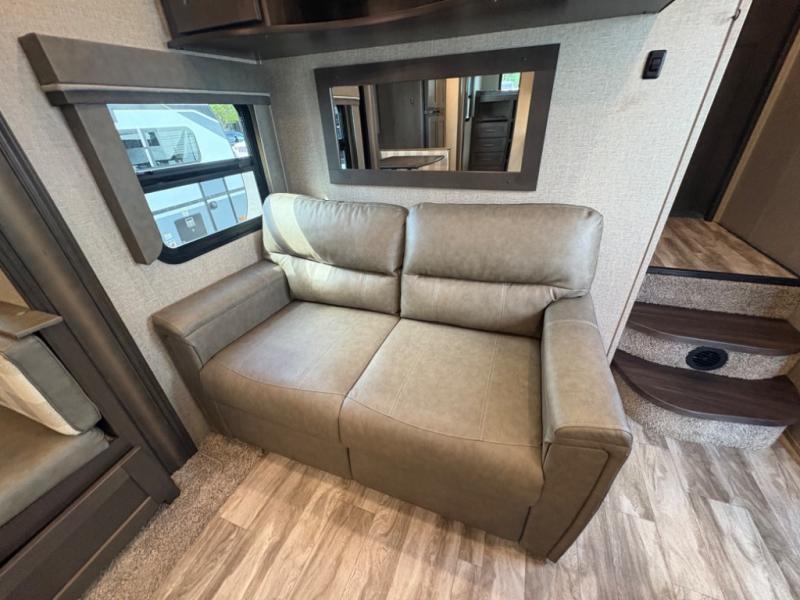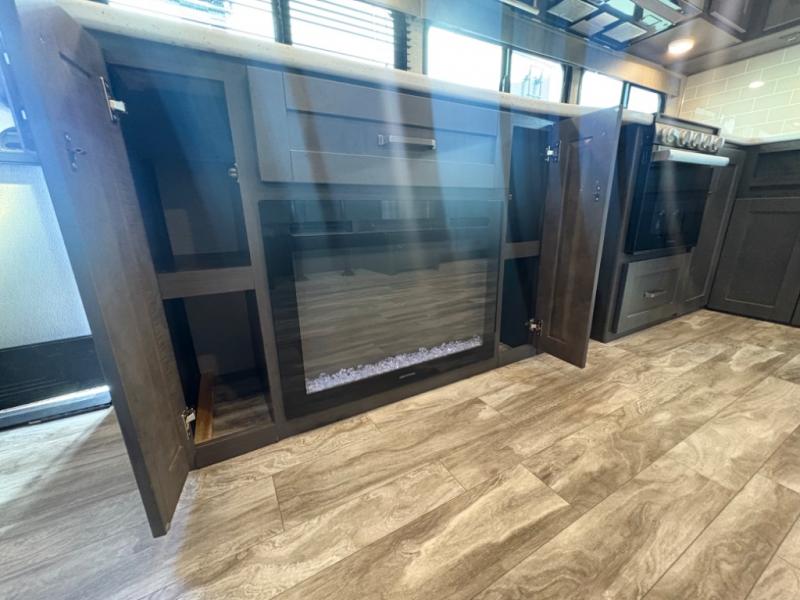 The whole family will love camping in this fifth wheel! The rear private bunkhouse has a 32" top bunk with a dresser below, a 34" top bunk above a 48" lower bunk, and is prepped for a TV to be added. The gourmet kitchen has a flip-up countertop extension to make meal prepping easier and a 12 cu. ft. refrigerator to keep your perishables fresh. The U-shaped dinette is big enough for everyone to gather around, but you can also choose to switch it out for the optional 78" theater seating instead. Above the fireplace is a 40" HDTV that you can move for a better view at the tri-fold sofa. The dual entry bathroom has a radius shower with a skylight above and an entrance that leads directly into the front private bedroom for your convenience!