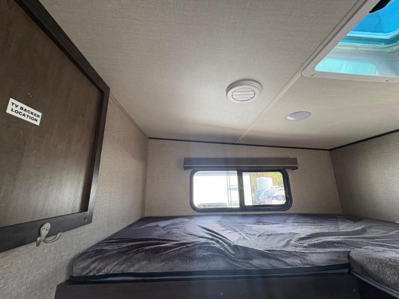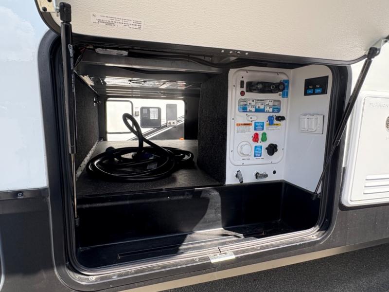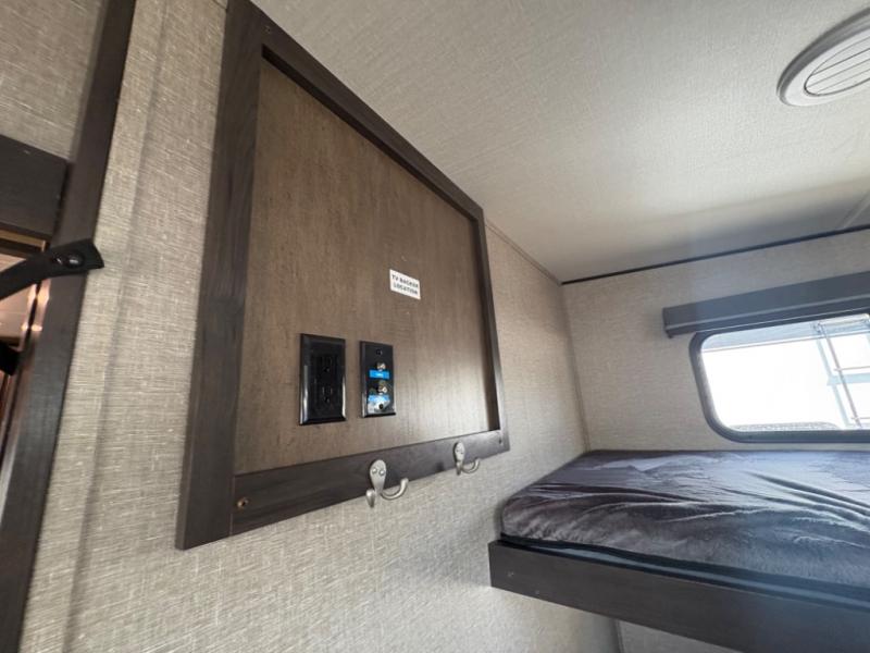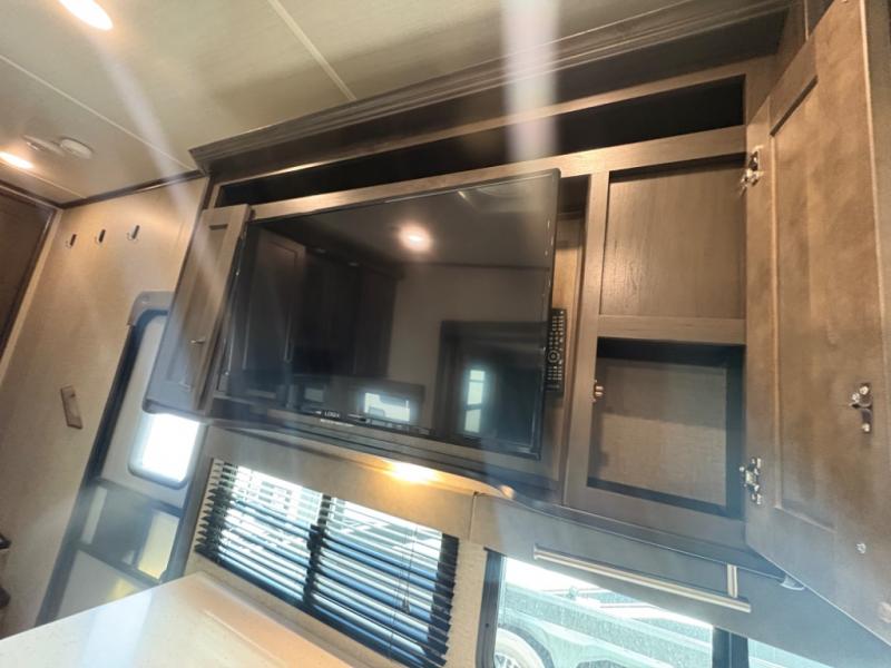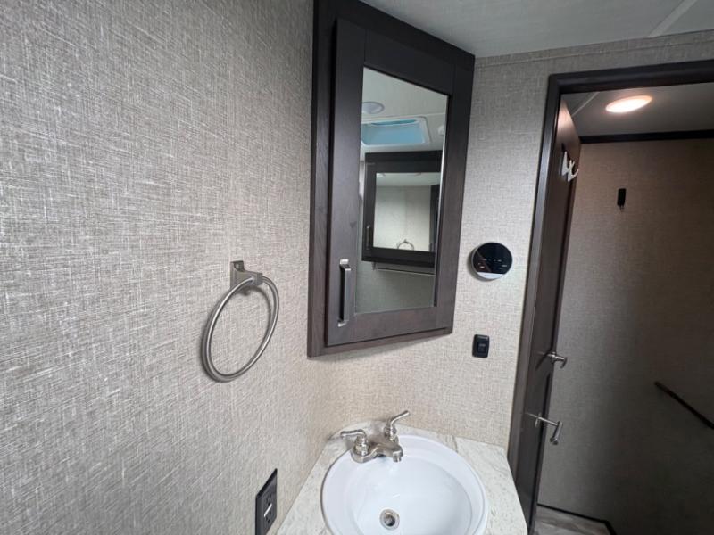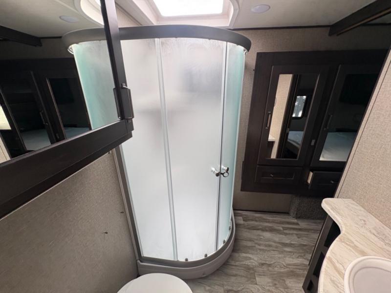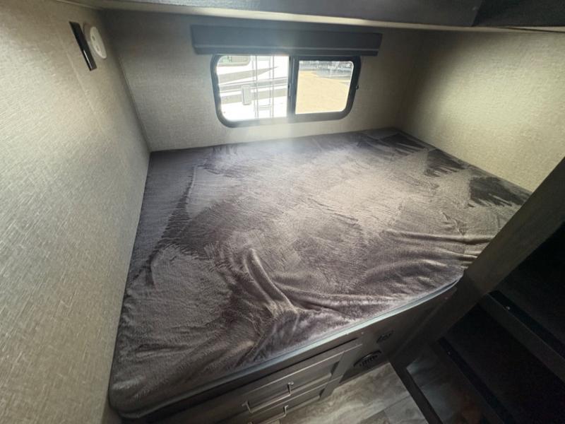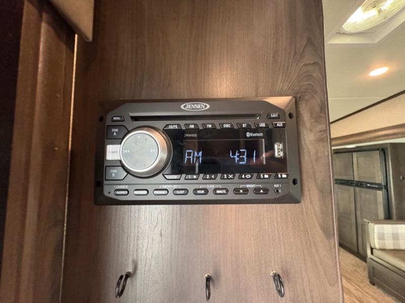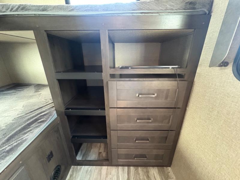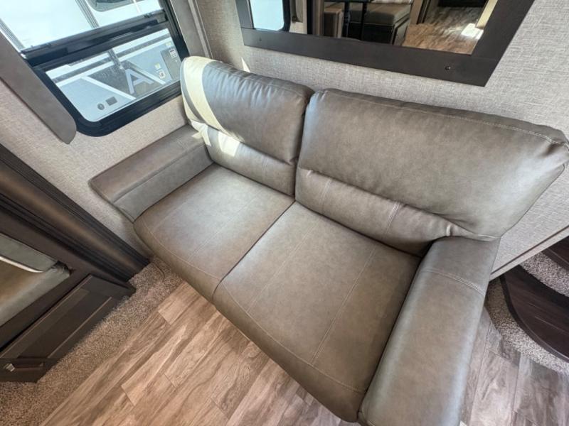 The whole family will love camping in this fifth wheel! The rear private bunkhouse has a 32" top bunk with a dresser below, a 34" top bunk above a 48" lower bunk, and is prepped for a TV to be added. The gourmet kitchen has a flip-up countertop extension to make meal prepping easier and a 12 cu. ft. refrigerator to keep your perishables fresh. The U-shaped dinette is big enough for everyone to gather around, but you can also choose to switch it out for the optional 78" theater seating instead. Above the fireplace is a 40" HDTV that you can move for a better view at the tri-fold sofa. The dual entry bathroom has a radius shower with a skylight above and an entrance that leads directly into the front private bedroom for your convenience!