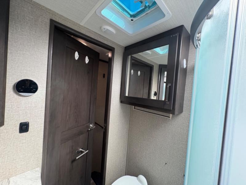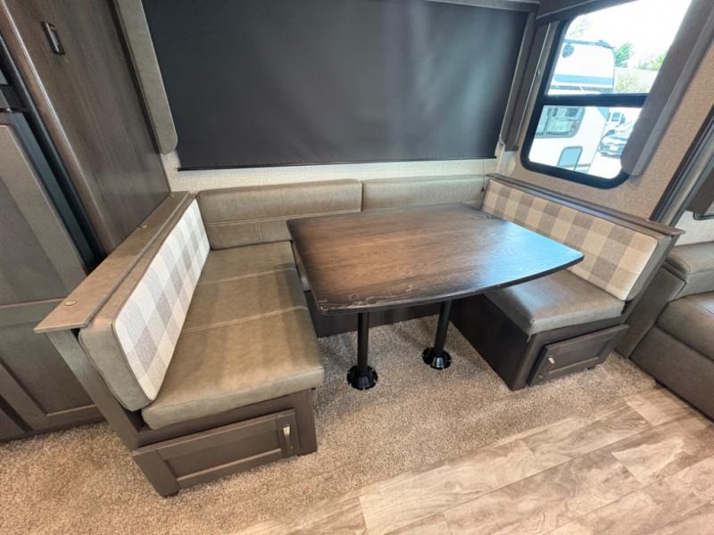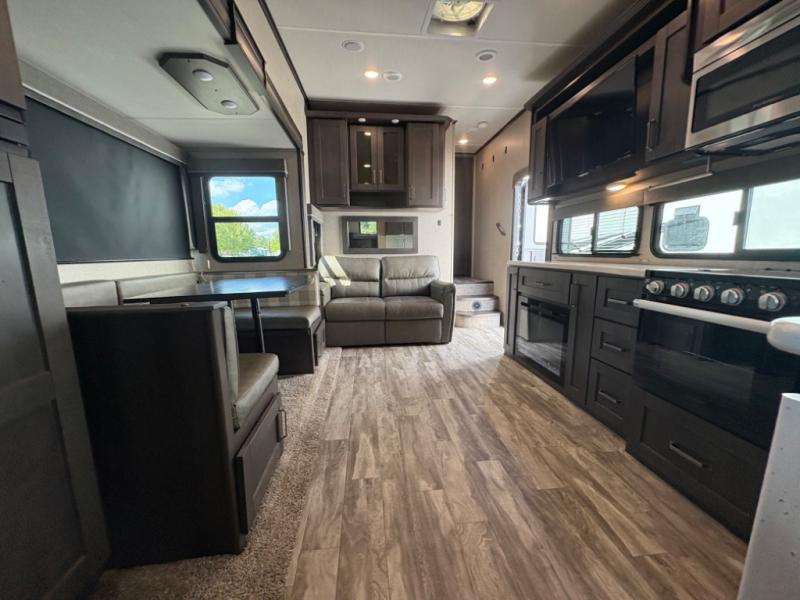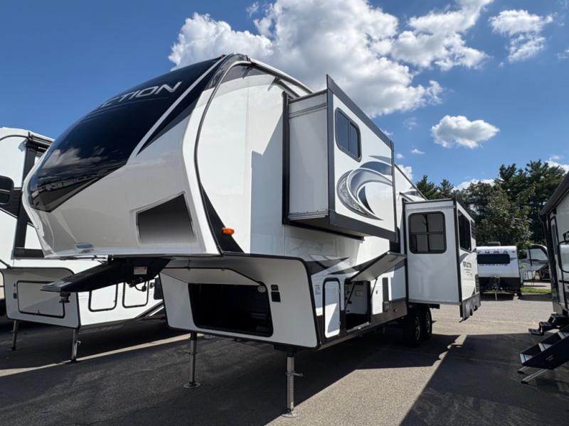 Luxury, value, and towability is what you will find in every one of these Reflection fifth wheels and travel trailers by Grand Design! The mandatory Arctic 4-Seasons Protection package allows you to camp all year round with the 35k BTU high capacity furnace, the Thermofoil insulation, and the heated and enclosed underbelly with circulating heat. Their gourmet kitchens have everything you will need to create home cooked meals including a deep, seated stainless steel sink with a high rise faucet with a pull down sprayer to make clean up easier too. The ductless flooring means there are no floor vent covers to collect dirt or debris, and the universal docking station is an all in one heated location with an EZ winterization system. Easily open the pivoting AXISTEP which will help eliminate debris and moisture from falling inside the unit and also goes all the way down to the ground to make it more stable when entering. Start your next camping trip in true luxury!