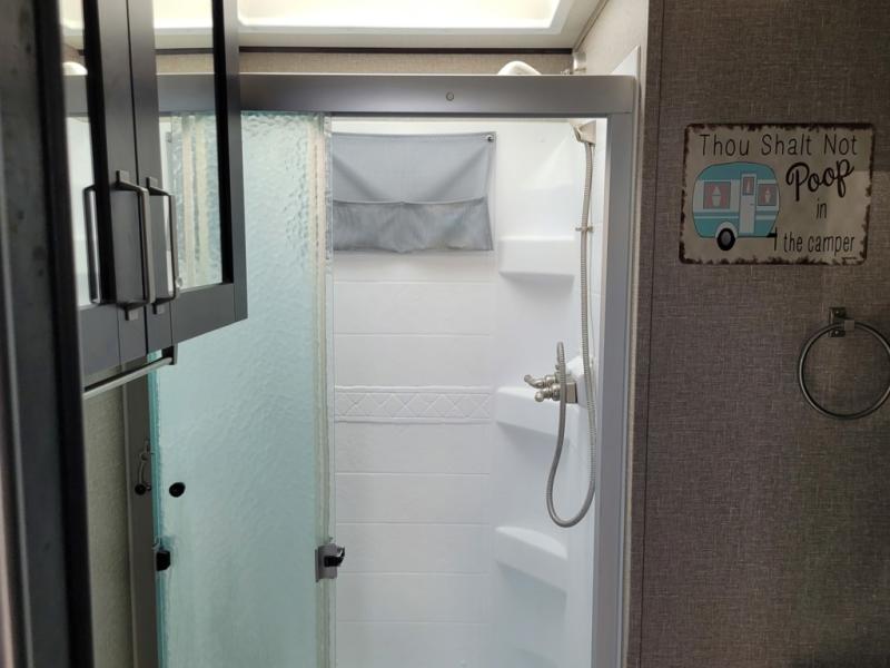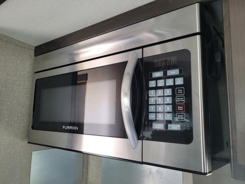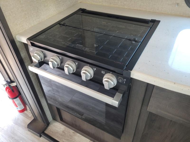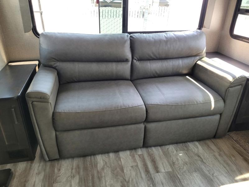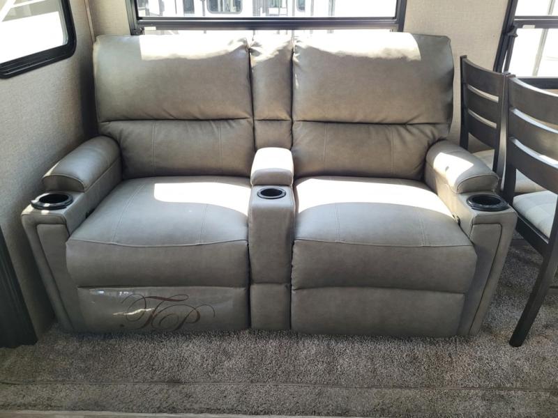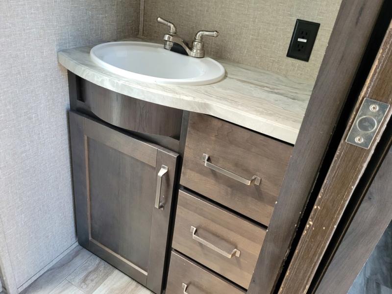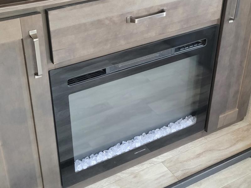 You and your spouse will love camping in this travel trailer! You can even bring along an extra guest or two to sleep on the rear tri-fold sofa. The theater seating is directly across from the entertainment center with a 40" HDTV and a fireplace below for a relaxing evening indoors. The kitchen has everything you will need to whip up a delicious meal including an island with a deep, undermount sink and a hutch to store your nice dishes. You can even breathe in some fresh air while you cook with the two burner cooktop at the outside kitchen. The full bathroom has a 30" x 36" shower with a skylight above for added natural lighting as you get ready and a linen closet to store your towels. The front private bedroom not only has wardrobes on either side of the queen bed, but also a wardrobe that is prepped to add the optional washer and dryer!