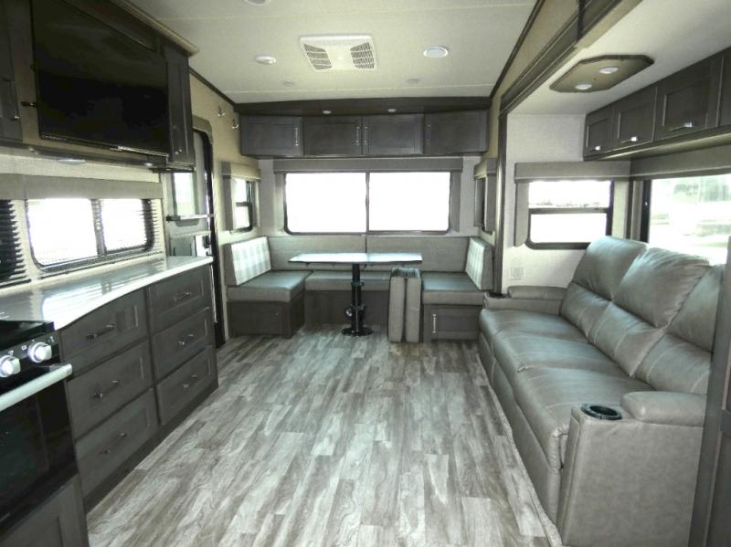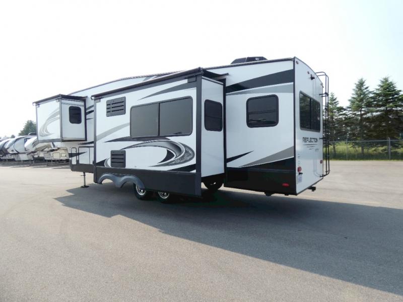 Luxury, value, and towability is what you will find in every one of these Reflection fifth wheels and travel trailers by Grand Design! The mandatory Arctic 4-Seasons Protection package allows you to camp all year round with the 35k BTU high capacity furnace, the Thermofoil insulation, and the heated and enclosed underbelly with circulating heat. Their gourmet kitchens have everything you will need to create home cooked meals including a deep, seated stainless steel sink with a high rise faucet with a pull down sprayer to make clean up easier too. The ductless flooring means there are no floor vent covers to collect dirt or debris, and the universal docking station is an all in one heated location with an EZ winterization system. Easily open the pivoting AXISTEP which will help eliminate debris and moisture from falling inside the unit and also goes all the way down to the ground to make it more stable when entering. Start your next camping trip in true luxury!
