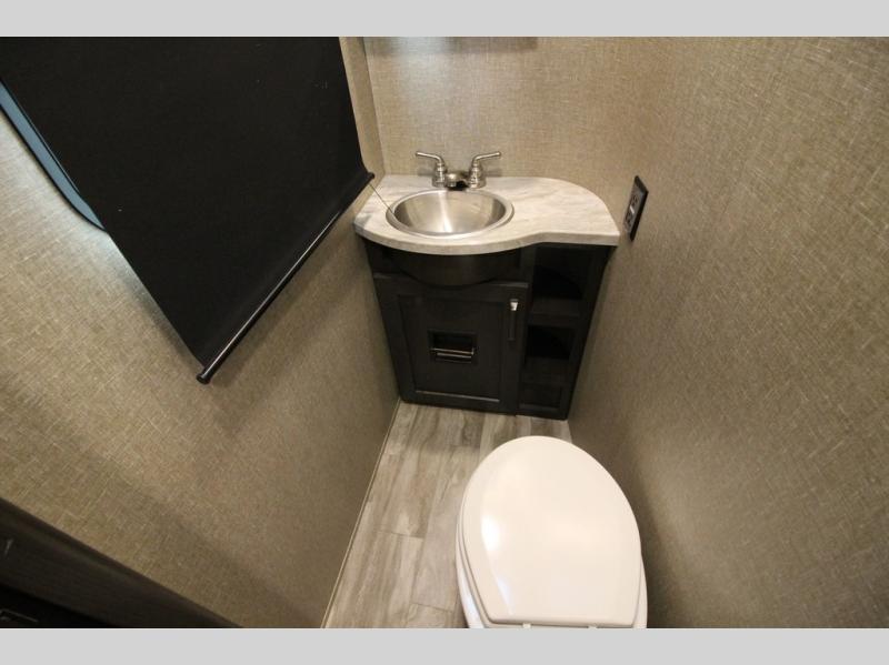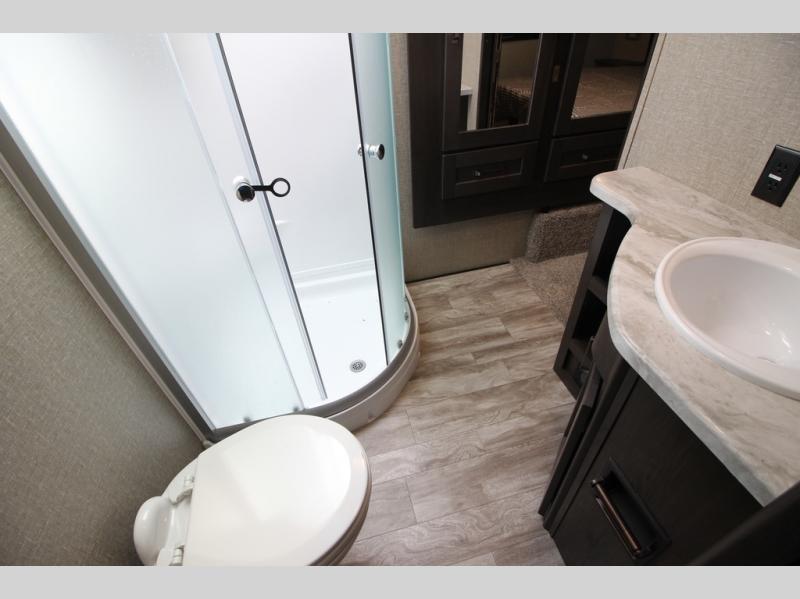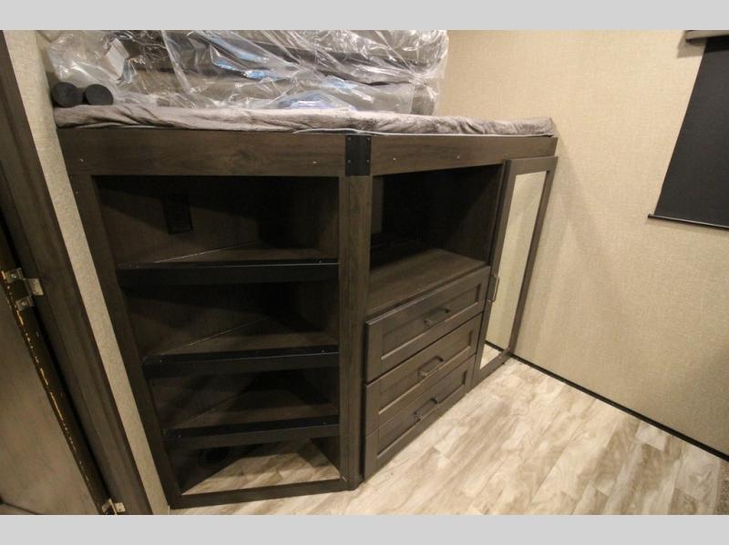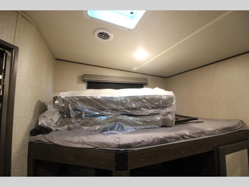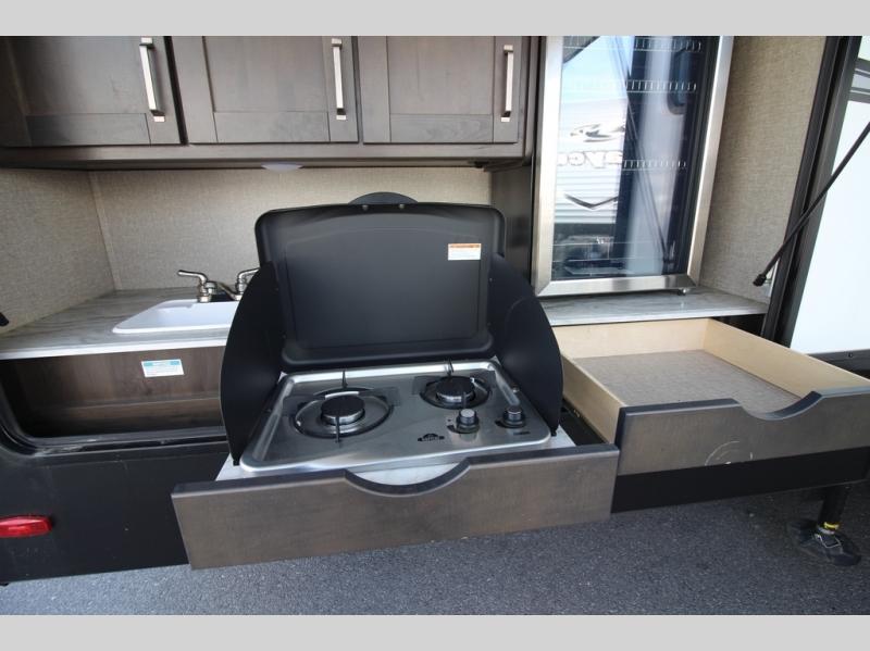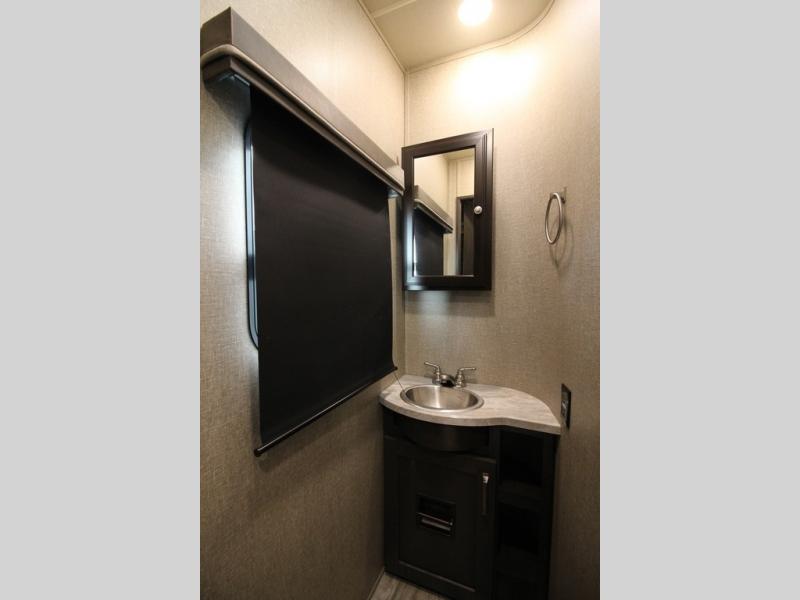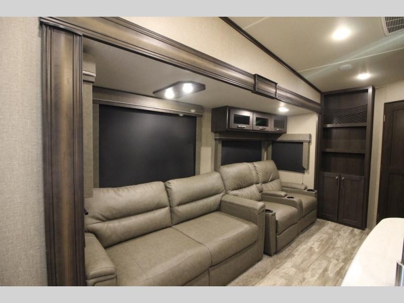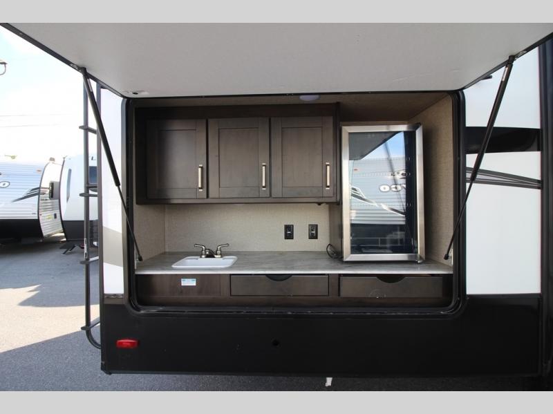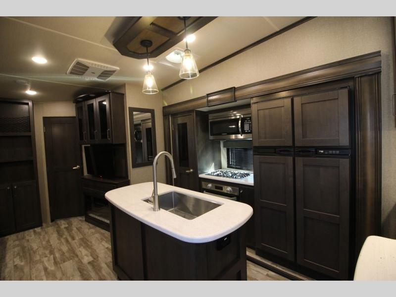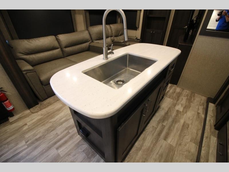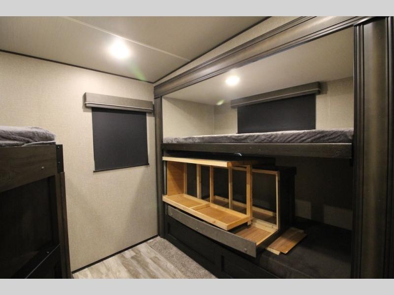The kids will love camping in this fifth wheel! They can invite a friend or two to tag along thanks to the rear private bunkhouse having a bunk bed with a window and wardrobe below it, a flip bunk above a tri-fold sofa, and its very own private half bathroom, plus the booth dinette can transform into an extra sleeping space too. The theater seating is a great place to unwind at night in front of the entertainment center with a 40" HDTV and fireplace below it. Grab some eggs from the 12 cu. ft. refrigerator and fry them up on the three burner cooktop each morning. The kitchen island has a deep, seated stainless steel sink with a high rise faucet with a pull down sprayer to make clean up a breeze too. The dual entry bathroom has a radius shower with a skylight above for natural lighting as you get ready each morning, and enters right into the front private bedroom!
