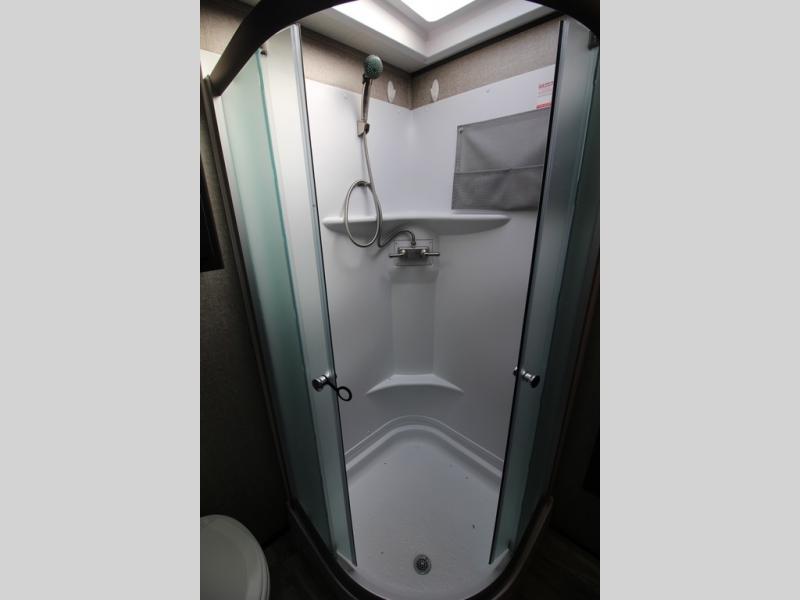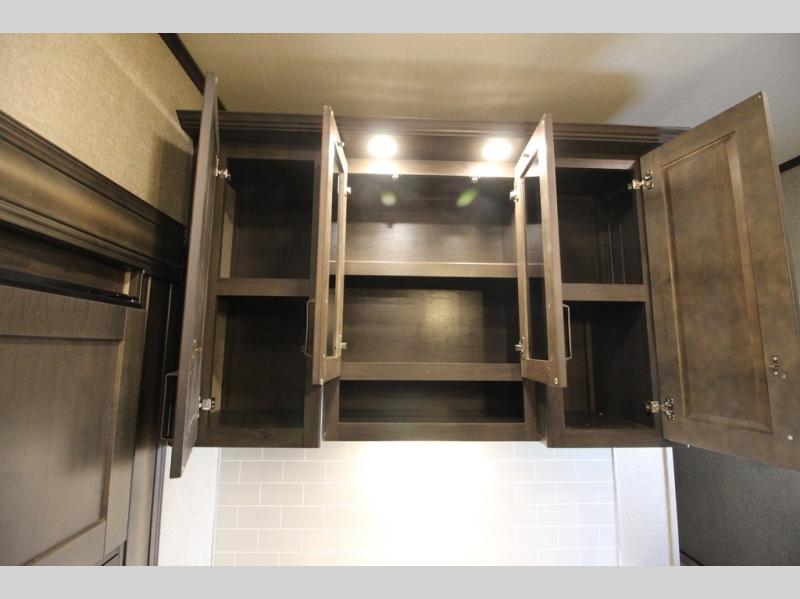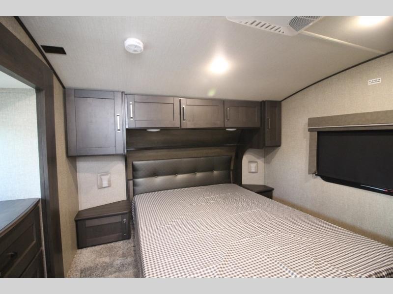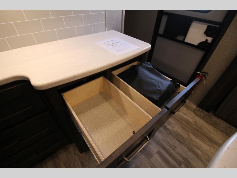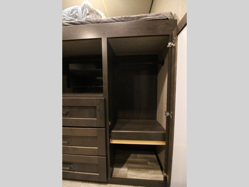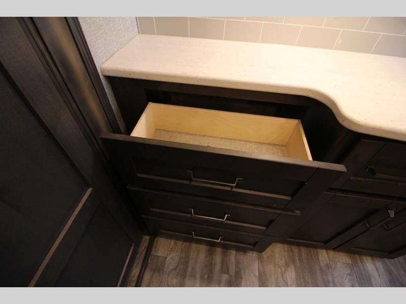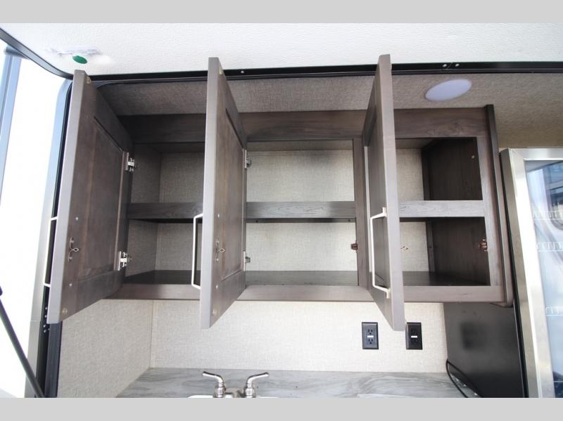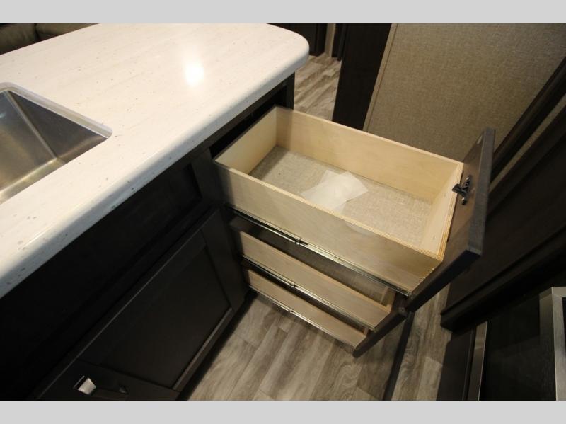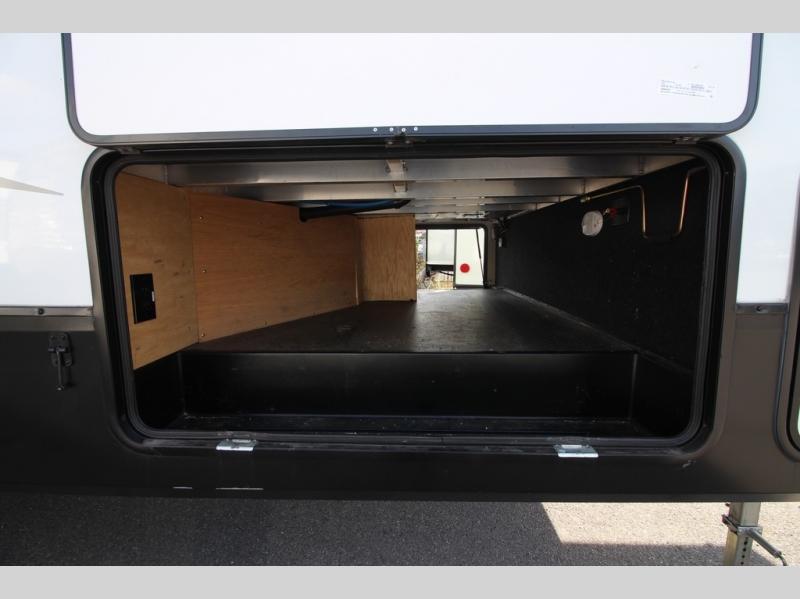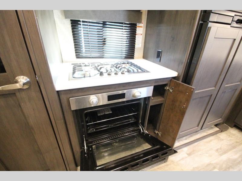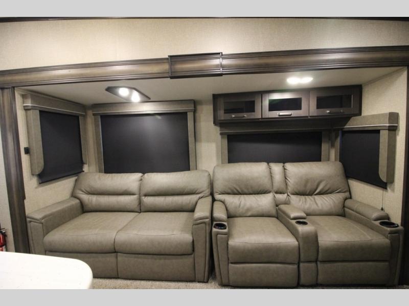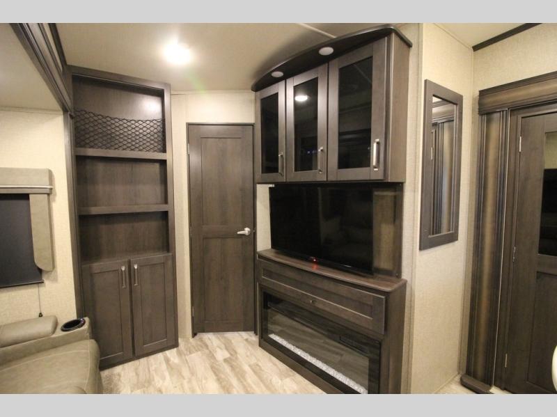 The kids will love camping in this fifth wheel! They can invite a friend or two to tag along thanks to the rear private bunkhouse having a bunk bed with a window and wardrobe below it, a flip bunk above a tri-fold sofa, and its very own private half bathroom, plus the booth dinette can transform into an extra sleeping space too. The theater seating is a great place to unwind at night in front of the entertainment center with a 40" HDTV and fireplace below it. Grab some eggs from the 12 cu. ft. refrigerator and fry them up on the three burner cooktop each morning. The kitchen island has a deep, seated stainless steel sink with a high rise faucet with a pull down sprayer to make clean up a breeze too. The dual entry bathroom has a radius shower with a skylight above for natural lighting as you get ready each morning, and enters right into the front private bedroom!