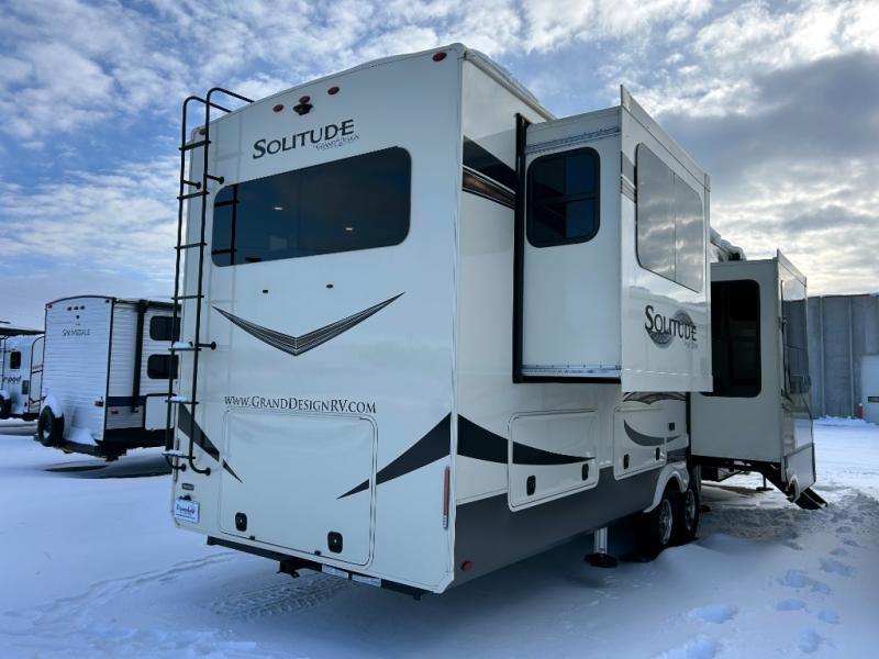 With each Solitude fifth wheel by Grand Design, you will have an exclusive superchassis, a wide rail design on heavy duty l-beam main rails providing a more stable jack stance, and maximum insulation from the thermal roof design and the exclusive full laminated walls to the insulated gooseneck and baggage doors. More features offered to help with traveling include the MORryde rubber pin box, the Tire Linc TPMS system, and the 6-point hydraulic system. And the 40,000 BTU of heating power, the heated underbelly and heated storage bay, the Evenflow heating system, and the Stealth A/C system with racetrack ducting, allow you to camp all year long! You will also find maximum storage solutions, residential features and so much more!