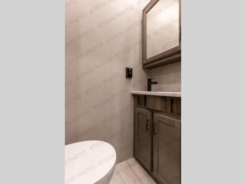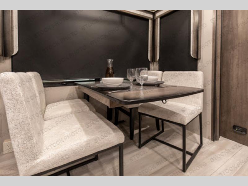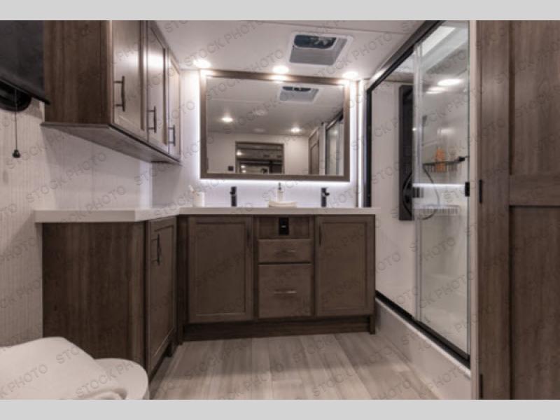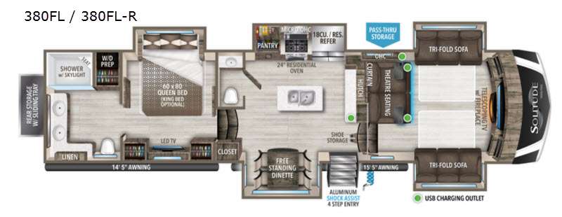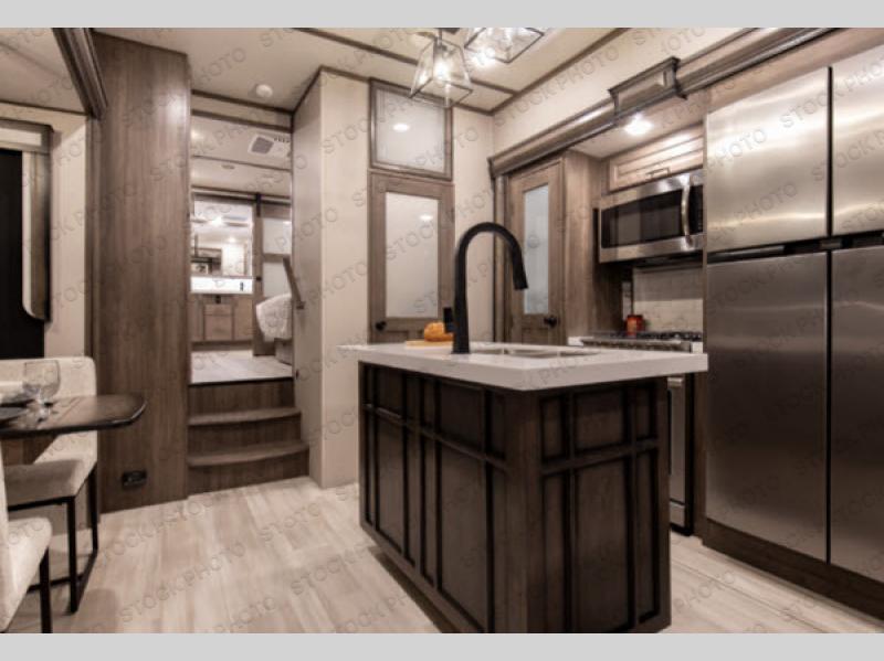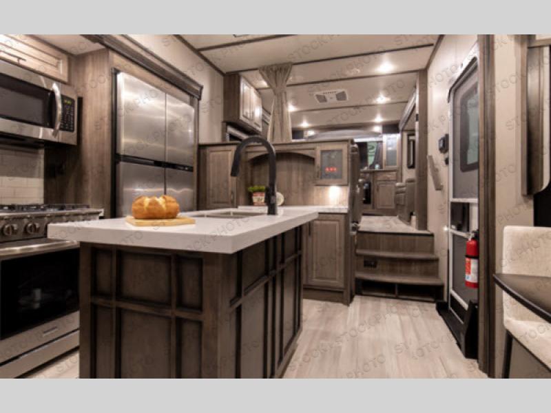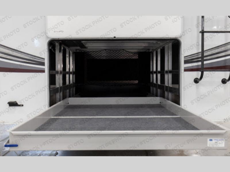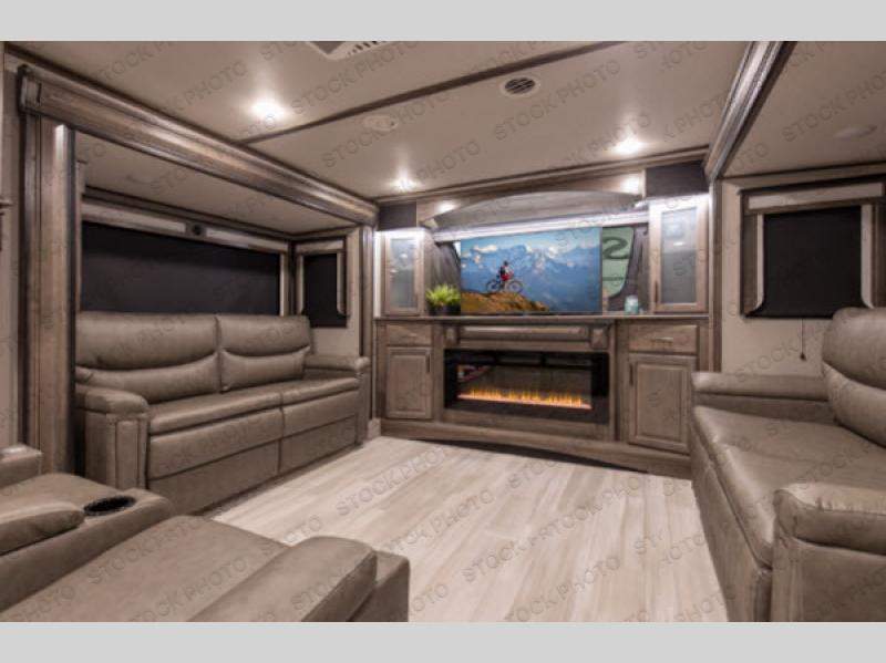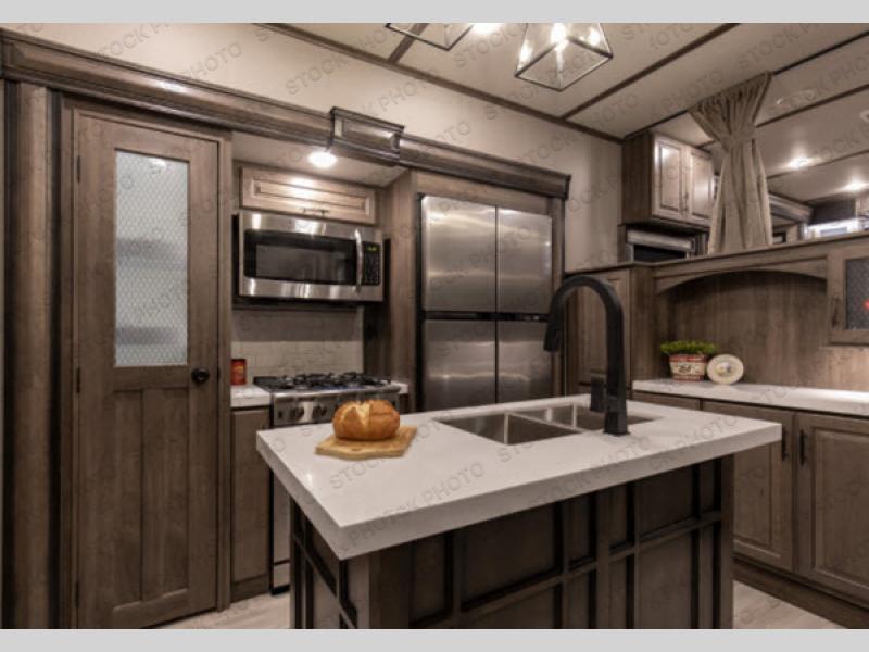 If you decide to be a full-timer or take long trips in this fifth wheel, you will appreciate all the floor space thanks to the five slide outs found throughout! The cook will love their dream kitchen which is separate from the main living area and includes a center island, a hutch with more counter space, plus full amenities including a residential refrigerator and a free-standing dinette. And there is a half bath for convenience for all. You can head up front to enjoy the entertainment center, the LED TV and the fireplace, plus the dual opposing tri-fold sofas and theater seats. The kids or grandkids can sleep here while you enjoy your own master suite with a queen-bed slide and wardrobes plus an LED TV and easy access through the sliding door to the large full bathroom with dual sinks, one for you and one for your spouse. You might even decide to add a few options such as a washer/dryer and/or king-size bed. Outside, there is a pass-through storage compartment and a rear storage with a sliding tray to make getting to your gear easy.