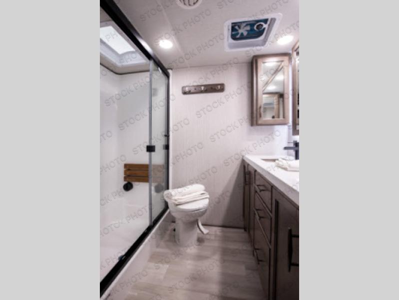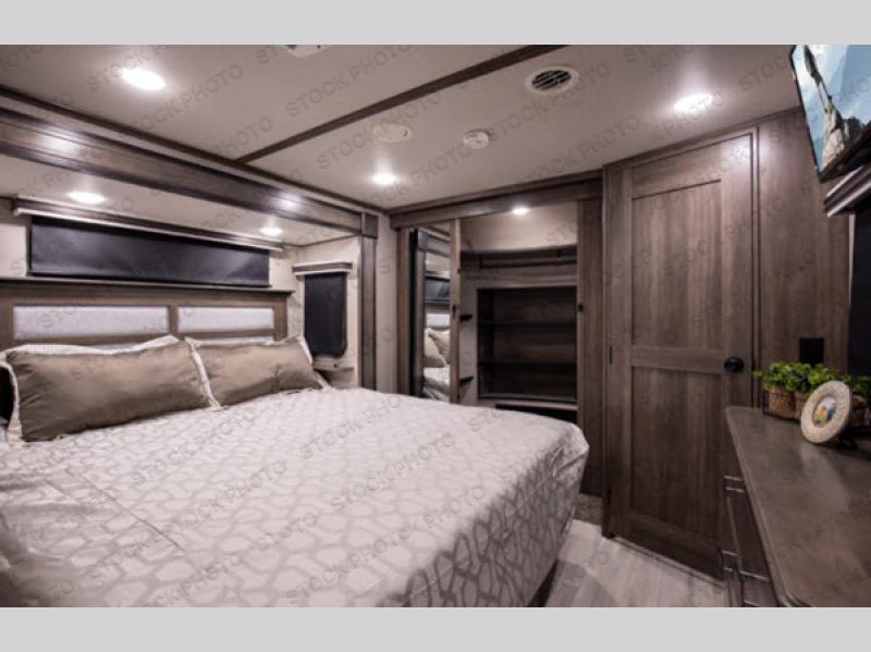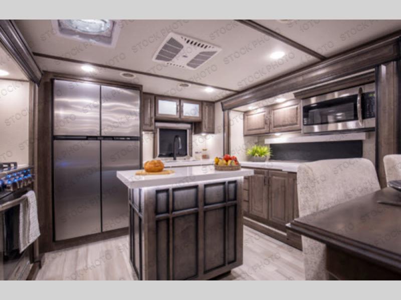 You will love your extended stays while traveling in this Solitude fifth wheel which features five slides! A rear raised kitchen provides the family chef a great space with opposing slides as well as an island for food prep. A raised bar top with two stools overlooks the center living space that also features dual opposing slides, two tri-fold sofas, and theatre seating. Dual sinks in the full bathroom means getting ready is easy for two, and the shower with skylight offers more head room that you are also sure to appreciate. As you wind down your day, the front master bedroom will be a welcomed retreat thanks to a queen bed slide with a pull-out ottoman to sit on when removing your shoes, and the walk-in closet provides ample space for all of your things. For added storage, a large exterior sliding tray offers more room for luggage and larger items. There is also a mid-coach pass-through storage compartment for other camping gear, and an optional pull-out kitchen and/or king bed option if you decide to change things up.