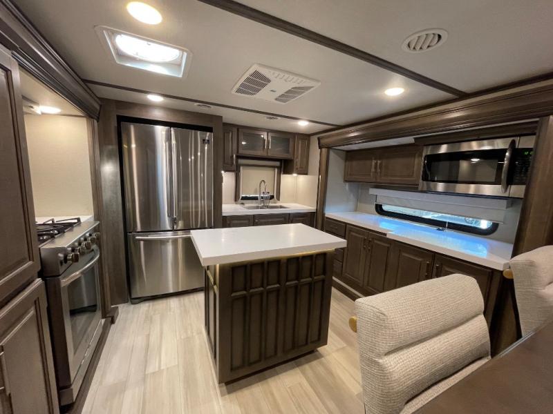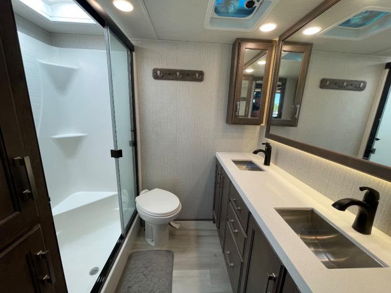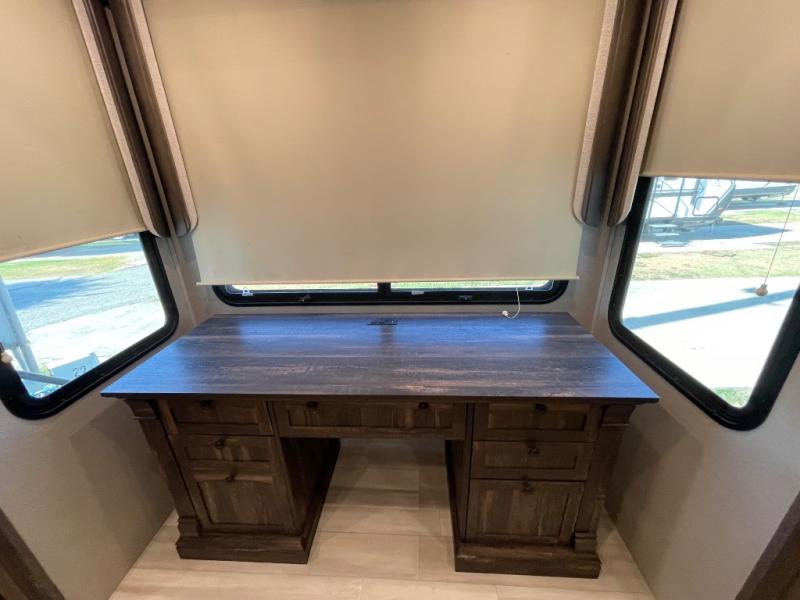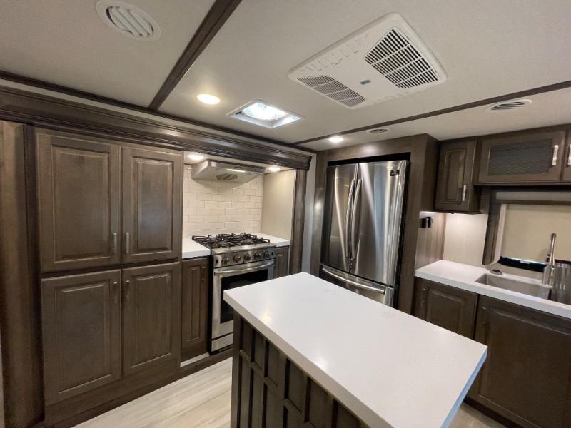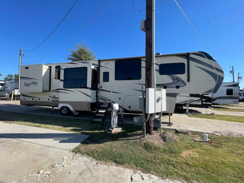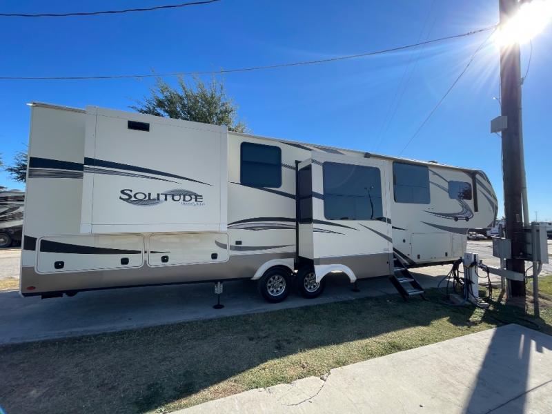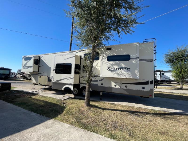 You will love your extended stays while traveling in this Solitude fifth wheel which features five slides! A rear raised kitchen provides the family chef a great space with opposing slides as well as an island for food prep. A raised bar top with two stools overlooks the center living space that also features dual opposing slides, two tri-fold sofas, and theatre seating. Dual sinks in the full bathroom means getting ready is easy for two, and the shower with skylight offers more head room that you are also sure to appreciate. As you wind down your day, the front master bedroom will be a welcomed retreat thanks to a queen bed slide with a pull-out ottoman to sit on when removing your shoes, and the walk-in closet provides ample space for all of your things. For added storage, a large exterior sliding tray offers more room for luggage and larger items. There is also a mid-coach pass-through storage compartment for other camping gear, and an optional pull-out kitchen and/or king bed option if you decide to change things up.